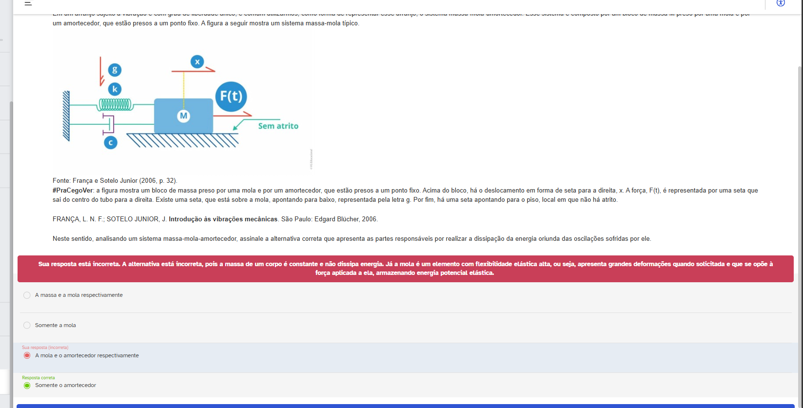 um amortecedor, que estão presos a um ponto fixo. A figura a seguir mostra um sistema massa-mola típico. g k F(t) M Sem atrito Fonte: França e Sotelo Junior (2006, p. 32). #PraCegoVer: a figura mostra um bloco de massa preso por uma mola e por um amortecedor, que estão presos a um ponto fixo. Acima do bloco, há 0 deslocamento em forma de seta para a direita, X. A força, F(t), é representada por uma seta que sai do centro do tubo para a direita. Existe uma seta, que está sobre a mola, apontando para baixo, representada pela letra g. Por fim, ha uma seta apontando para 0 piso, local em que não atrito. FRANÇA, L. N. SOTELO JUNIOR, J. Introdução às vibrações mecânicas. São Paulo: Edgard Blücher, 2006. Neste sentido, analisando um sistema massa-mola-amortecedor assinale a alternativa correta que apresenta as partes responsáveis por realizar a dissipação da energia oriunda das oscilações sofridas por ele. Sua resposta incorreta. A alternativa está incorreta, pois a massa de um corpo é constante e não dissipa energia. Já a mola é um elemento com flexibilidade elástica alta, ou seja, apresenta grandes deformações quando solicitada e que se opõe à força aplicada a ela, armazenando energia potencial elástica. A massa e a mola respectivamente Somente a mola Sua resposta (incorreta) A mola e amortecedor respectivamente Resposta correta Somente amortecedor
