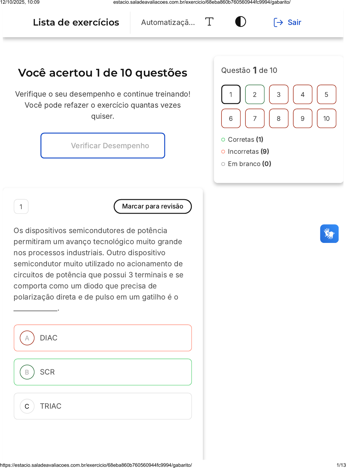 Você acertou 1 de 10 questões Verifique o seu desempenho e continue treinando! Você pode refazer o exercício quantas vezes quiser. Verificar Desempenho A B C 1 Marcar para revisão Os dispositivos semicondutores de potência permitiram um avanço tecnológico muito grande nos processos industriais. Outro dispositivo semicondutor muito utilizado no acionamento de circuitos de potência que possui 3 terminais e se comporta como um diodo que precisa de polarização direta e de pulso em um gatilho é o _____________. DIAC SCR TRIAC Questão 1 de 10 Corretas (1) Incorretas (9) Em branco (0) 1 2 3 4 5 6 7 8 9 10 Lista de exercícios Automatizaçã… Sair 12/10/2025, 10:09 estacio.saladeavaliacoes.com.br/exercicio/68eba860b760560944fc9994/gabarito/ https://estacio.saladeavaliacoes.com.br/exercicio/68eba860b760560944fc9994/gabarito/ 1/13 D E MOSFET DIODO Resposta incorreta Opa! A alternativa correta é a letra B. Confira o gabarito comentado! Gabarito Comentado O dispositivo semicondutor que se comporta como um diodo e necessita de polarização direta e de um pulso de disparo no gatilho para entrar em estado de condução é o SCR (Silicon Controlled Rectifier). Este componente é amplamente utilizado em circuitos de potência devido à sua capacidade de controlar grandes quantidades de corrente e tensão. Portanto, a alternativa correta é a letra B, que se refere ao SCR. 2 Marcar para revisão Os dispositivos semicondutores de potência permitiram um avanço tecnológico muito grande nos processos industriais. Existem diversas vantagens na utilização dos motores trifásicos em comparação com os monofásicos nas aplicações industriais. Entre essas vantagens, pode-se destacar: 12/10/2025, 10:09 estacio.saladeavaliacoes.com.br/exercicio/68eba860b760560944fc9994/gabarito/ https://estacio.saladeavaliacoes.com.br/exercicio/68eba860b760560944fc9994/gabarito/ 2/13 A B C D E Uma faixa de potência mais ampla. Uma faixa de potência menos ampla. Menor torque para as cargas. Maior consumo de energia. Incapacidade de iniciarem movimentos de rotação por conta própria. Resposta correta Parabéns, você selecionou a alternativa correta. Confira o gabarito comentado! Gabarito Comentado Os motores trifásicos possuem uma série de vantagens em relação aos motores monofásicos. Entre elas, destaca-se a faixa de potência mais ampla, que é a resposta correta para esta questão. Isso significa que os motores trifásicos podem operar em uma gama maior de potências, tornando-os mais versáteis para diferentes aplicações industriais. Além disso, eles também apresentam menor consumo de energia, maior torque e a capacidade de iniciar movimentos de rotação por conta própria, o que os torna mais eficientes e autônomos. 12/10/2025, 10:09 estacio.saladeavaliacoes.com.br/exercicio/68eba860b760560944fc9994/gabarito/ https://estacio.saladeavaliacoes.com.br/exercicio/68eba860b760560944fc9994/gabarito/ 3/13 A B C D E 3 Marcar para revisão Os dispositivos semicondutores de potência permitiram um avanço tecnológico muito grande nos processos industriais. Os dispositivos do tipo SCR apresentam grandes vantagens na utilização de circuitos eletrônicos de potência onde é necessário um disparo em seu gatilho. Após o início da condição de condução de um SCR, para realizar o seu bloqueio natural, é necessário: Colocar a corrente que atravessa o SCR em uma intensidade inferior à corrente de manutenção e uma tensão de polarização reversa seja aplicada sobre o dispositivo. Promover a interrupção da tensão de alimentação do SCR leva ao seu bloqueio. Colocar a corrente que atravessa o SCR em uma intensidade superior à corrente de manutenção. Promover um aumento súbito da tensão de alimentação do SCR leva ao seu bloqueio. Promover a redução da corrente que atravessa o SCR para um valor inferior à corrente de manutenção de condução (holding current) até que ela seja nula. Resposta incorreta 12/10/2025, 10:09 estacio.saladeavaliacoes.com.br/exercicio/68eba860b760560944fc9994/gabarito/ https://estacio.saladeavaliacoes.com.br/exercicio/68eba860b760560944fc9994/gabarito/ 4/13 Opa! A alternativa correta é a letra E. Confira o gabarito comentado! Gabarito Comentado Para realizar o bloqueio natural de um SCR, após o início da condição de condução, é necessário reduzir a corrente que atravessa o dispositivo para um valor inferior à corrente de manutenção de condução, também conhecida como "holding current", até que ela se torne nula. Essa condição é alcançada na alternativa E, que é a resposta correta. A redução da corrente até que ela se torne nula é o que caracteriza o bloqueio natural do SCR, interrompendo a condução de corrente através do dispositivo. 4 Marcar para revisão Um inversor de frequência é um dispositivo eletrônico capaz de transformar corrente (ou tensão) elétrica alternada fixa em corrente (ou tensão) elétrica alternada variável. Os inversores escalares são amplamente utilizados nos sistemas industriais devido a sua simplicidade e custo reduzido, quando comparados com os inversores vetoriais. Observando-se a seguinte relação entre a tensão (Vca) e a frequência (Hz) de um inversor escalar, é possível afirmar que para operar com uma tensão igual a 300 Vca a frequência, em Hz, será igual a: 12/10/2025, 10:09 estacio.saladeavaliacoes.com.br/exercicio/68eba860b760560944fc9994/gabarito/ https://estacio.saladeavaliacoes.com.br/exercicio/68eba860b760560944fc9994/gabarito/ 5/13 A B C D E 20 5 30 10 60 Resposta incorreta Opa! A alternativa correta é a letra C. Confira o gabarito comentado! Gabarito Comentado 5 Marcar para revisão Os dispositivos semicondutores de potência permitiram um avanço tecnológico muito grande nos processos industriais. Um dispositivo capaz de permitir o controle da condução nos dois sentidos, similar a dois diodos em antiparalelo e 12/10/2025, 10:09 estacio.saladeavaliacoes.com.br/exercicio/68eb