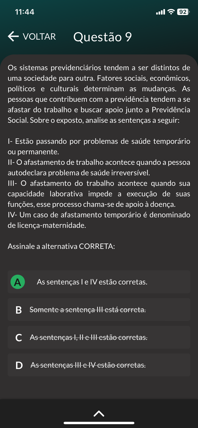11:44 92 VOLTAR Questão 9 Os sistemas previdenciários tendem a ser distintos de uma sociedade para outra. Fatores sociais, econômicos, políticos e culturais determinam as mudanças. As pessoas que contribuem com a previdência tendem a se afastar do trabalho e buscar apoio junto a Previdência Social. Sobre o exposto, analise as sentenças a seguir: I- Estão passando por problemas de saúde temporário ou permanente. II- afastamento de trabalho acontece quando a pessoa autodeclara problema de saúde irreversível. III- afastamento do trabalho acontece quando sua capacidade laborativa impede a execução de suas funções, esse processo chama-se de apoio à doença. IV- Um caso de afastamento temporário é denominado de licença-maternidade. Assinale a alternativa CORRETA: A As sentenças e IV estão corretas. Somente a sentença está correta. c As sentenças estão corretas. D As sentenças e IV estão corretas.