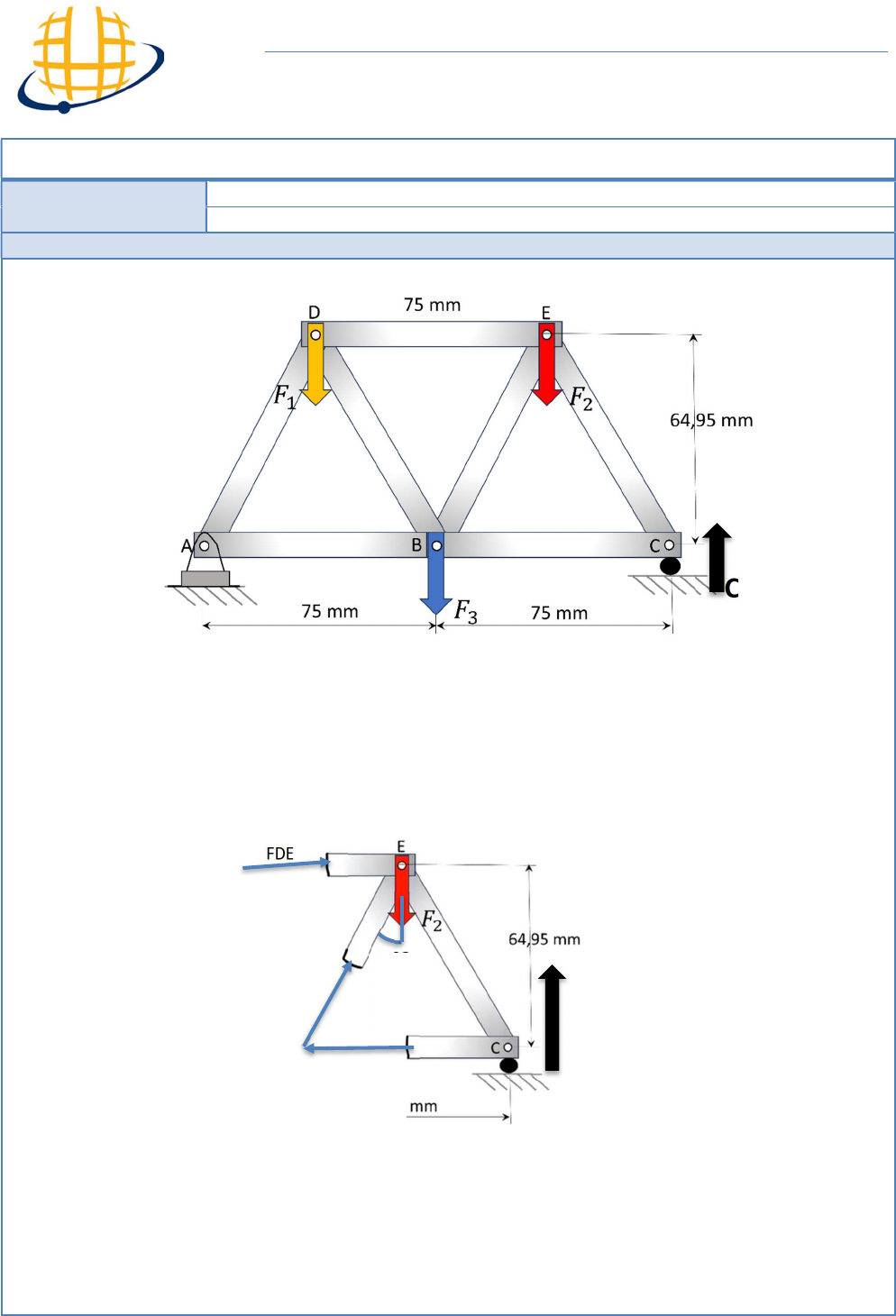 Relatório Identificação do aluno Nome: Adryan Joseph Rodrigues RU: 4649669 ETAPA I F1 = 0,4905 | F2 = 0,4905 | F3 = 0,4905 ∑ 𝑴𝒂 = 0 𝟎 = −(𝑭𝟏 ∗ 𝟑𝟕, 𝟓) − (𝑭𝟐 ∗ 𝟏𝟏𝟐, 𝟓) − (𝐹3 ∗ 75) + (𝑪𝒀 ∗ 𝟏𝟓𝟎) 0 = −18,39375 − 55,18125 − 36,7875 − 150𝐶𝑌 110,3625 = 150𝐶𝑌 0,73575 = 𝐶𝑌 Sabendo que, para equilíbrio: 𝑭𝒀 = 𝟎 𝑭𝒀 = 𝟎 = −𝑭𝟐 + 𝑪𝒀 − 𝑭𝑩𝑬 ∗ 𝑪𝑶𝑺𝟑𝟎° CY CY 30° B FBE FDE FBC 𝟎 = −𝟎, 𝟒𝟗𝟎𝟓 + 𝟎, 𝟕𝟑𝟓𝟕𝟓 − √𝟑 𝟐 𝑭𝑩𝑬 0,24525 √𝟑 2 = 𝐹𝐵𝐸 0,28319 = FBE Para Calcular FDE: 𝐵 = 0 0 = −𝐹𝐷𝐸 ∗ 64,95 − 𝐹2 ∗ 37,5 + 𝐶𝑌 ∗ 75 0 = 64,95𝐹𝐷𝐸 − 18,39375 + 55,18125 𝟑𝟔, 𝟕𝟖𝟕𝟓 𝟔𝟒, 𝟗𝟓 = 𝑭𝑫𝑬 𝐅𝐃𝐄 = 𝟎, 𝟓𝟔𝟔 Para calcular FBC 𝐹𝑋 = 0 0 = 0,566 − 𝐹𝐵𝐶 − 0,28319 ∗ 𝑆𝑒𝑛30° 𝟎 = 𝟎, 𝟓𝟔𝟔 − 𝑭𝑩𝑪 − 𝟎, 𝟏𝟒𝟏𝟓𝟗𝟓 𝐹𝐵𝐶 = 0,566 − 0,141595 𝑭𝑩𝑪 = 𝟎, 𝟒𝟐𝟒𝟒𝟎𝟓 ETAPA II ETAPA III