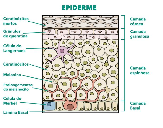 Sistema Tegumentar - Funções: 1. Proteção contra lesões físicas, químicas ou biológicas. 2. Proteção contra raios ultravioletas nocivos (protegendo o DNA das células). 3. Regulação da temperatura corporal; 4. Indicativos de aspectos gerais do estado fisiológico e/ou patológico; - Principais Características 1. Espessura varia de 0,5mm a 4,0mm; 2. Cobre toda a superfície externa do corpo; 3. A tela subcutânea (não faz parte da pele) liga a pele à fáscia integrando-a ao corpo. - Epiderme • Apenas uma camada composta pelo tecido: epitélio estratificado pavimentoso queratinizado; Obs.: Na lâmina aparece como teias de aranhas de uma cor mais clara adentrando, são as papilas dérmicas, fazem parte da derme e tem como função auxiliar na inervação e na nutrição da epiderme. • A epiderme é dividida em 5 camadas: Figura 1 - Ilustração da Epiderme 1. Camada Basal: Responsável por renovar as células da epiderme, a velocidade da mitose nessa região é intensificada para a renovação das células; 2. Camada Espinhosa: Responsável por sintetizar uma grande quantidade de queratina, os queratinócitos, estão unidos por desmossomos; 3. Camada Granulosa: Células contendo granulas de querato- hialina; No corte histológico você consegue perceber uma camada mais fina, onde possui apenas 3 linhas de células com muitos pontinhos. 4. Camada Lúcida: primeira camada de células anucleadas da pele; 5. Camada Córnea: camada onde fica localizada a queratina. Obs.: camadas que não existem na pele fina de forma evidente: granulosa e lúcida. - População Celular da Epiderme 1. Queratinócitos: Característica: Maior parte das células da epiderme; Localização: Se proliferam na camada basal e migram para a superfície da epiderme se especificando e contribuindo na formação da camada córnea. Função: Produção de Queratina. Figura 2 - Corte Histológico Pele Grossa Figura 3 - Corte Histológico Pele Fina 2. Células de Langerhans: Característica: Nos cortes histológicos aparecem arredondadas, circundadas por uma borda mais clara que as separam e distinguem dos queratinócitos. Localização: Mais frequentes na camada espinhosa. Função: Captam antígenos, processa-os e os apresentam aos linfócitos. 3. Células de Merkel: Característica: Em contato com essas células existem terminações nervosas eferentes mielinizadas em forma de disco que penetram a lâmina basal; Localização: Encontrados em mais evidência na pele espessa – localizadas na camada basal; Função: ajudam no mecanismo receptor do tato, auxiliando nos impulsos nervosos; 4. Melanócitos: Característica: Diferença de pigmentação no corte histológico, por conta da presença de melanina e carotenos; Localização: Localizados na camada basal; Função: Produção de melanina; Figura 4 - Ilustração da Epiderme evidenciando a população celular - Derme • É o tecido conjuntivo em quem se apoia a epiderme; • Sua superfície mais externa é irregular por conta das papilas dérmicas; • O tempo mitótico é menor em comparação com a epiderme; • A derme serve de apoio nutricional à epiderme, por o tecido epitelial ser avascular; • A derme é importante para a percepção sensorial, defesa imunológica da pele e a termorregulação. • Formada por duas camadas: a papilar, mais superficial e a reticular, mais profunda. 1. Derme Papilar a. Formada por tecido conjuntivo frouxo; b. Possuem muitos vasos sanguíneos e receptores sensoriais; c. Contém os ductos das glândulas sudoríparas e as hastes dos pelos. 2. Derme Reticular a. Formada por tecido conjuntivo denso não modelado. b. Fibras mais espessas e de arranjo mais denso. c. Contém as estruturas: folículos pilosos, glândulas sebáceas e glândulas sudoríparas. Figura 5 - Corte Histológico da Derme - Tela Subcutânea • Não faz parte do restante da Pele; • Formada por tecido adiposo (literatura indica o tecido adiposo como a especialização do tecido conjuntivo frouxo); • Integra a pele ao tecido muscular; • As células (adipócitos) desse tecido armazenam gordura, logo os núcleos são periféricos. - Glândulas 1. Glândulas Sebáceas Localização: Derme, normalmente seus ductos se abrem no folículo piloso ou na superfície da pele (não se encontra em pele grossa); no corte histológico está ligado ao folículo, fica envolta; Função: Secretam sebo, com função de impermeabilização; Características: Secreção de natureza lipídica e consideradas holócrinas; Figura 6 - Corte Histológico da Unidade Pilossebácea 2. Glândulas Sudoríparas Merócrinas Localização: Derme, porém seus ductos vão até a superfície e são encontradas em toda a pele; Função: Participam da regulação da temperatura corpórea; Características: sua secreção é composta por água, sódio e potássio, secreção não possui odor; 3. Glândulas Sudoríparas Apócrinas Localização: Estão mais presentes nas axilas, couro cabeludo e região pudenda; Características: sua secreção é composta por água, eletrólitos, gorduras, proteínas, hormônios e derivados de certos alimentos, secreção com odor característico; As glândulas sudoríparas aparecem nos cortes histológicos como tubos cortados transversalmente, as merócrinas mais escuras e as apócrinas maiores e com o meio esbranquiçado; Figura 7 - Corte Histológico das Glândulas do Sistema Tegumentar Figura 8 - Corte Histológico da pele com as suas glândulas glândulas Figura 9 - Corte Histológico das Glândulas Sudoríperas - As células da porção secretora são menos coradas e mais altas que a porção condutora Resumo Prático Epiderme Epitélio Estratificado Pavimentoso Queratinizado Proteção Derme Papilar Tecido Conjuntivo Frouxo Nutrição e Sensibilidade Derme Reticular Tecido Conjutivo denso não modelado Resistência e Elasticidade Tela Subcutânea Tecido Adiposo Reserva Energética e isolamento térmico Referências Bibliográficas JUNQUEIRA, L