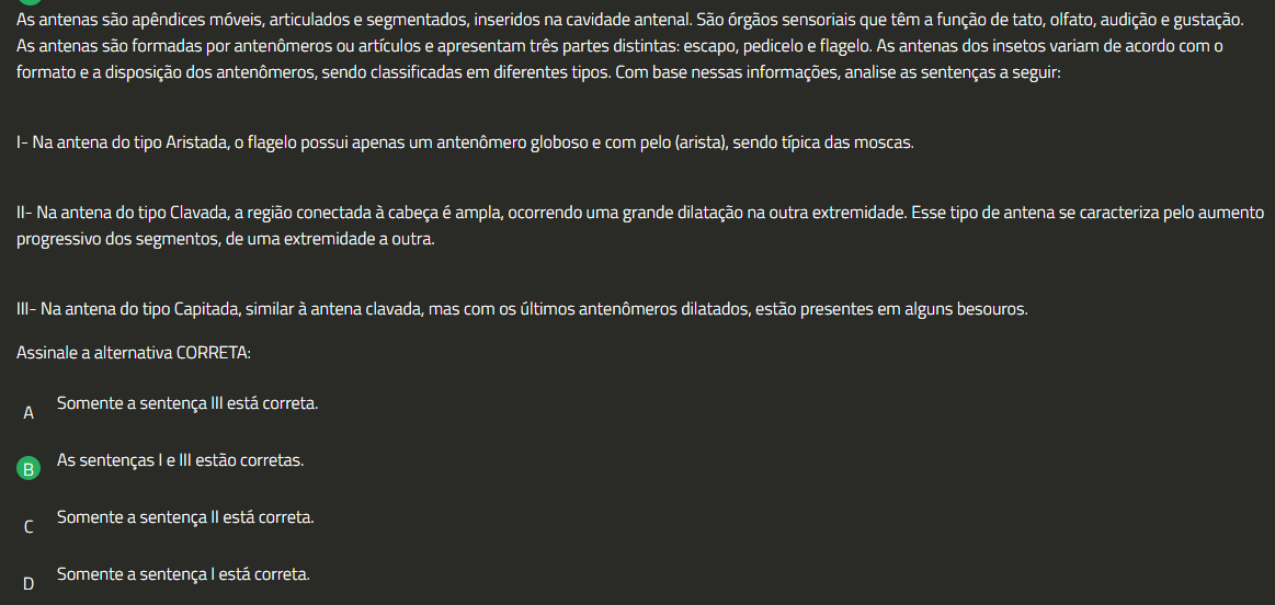 As antenas são apêndices móveis, articulados e segmentados, inseridos na cavidade antenal. São órgãos sensoriais que têm a função de tato, olfato, audição e gustação. As antenas são formadas por antenômeros ou artículos e apresentam três partes distintas: escapo, pedicelo e flagelo. As antenas dos insetos variam de acordo com 0 formato e a disposição dos antenômeros, sendo classificadas em diferentes tipos. Com base nessas informações, analise as sentenças a seguir: I- Na antena do tipo Aristada, 0 flagelo possui apenas um antenômero globoso e com pelo (arista), sendo típica das moscas. II- Na antena do tipo Clavada, a região conectada à cabeça é ampla, ocorrendo uma grande dilatação na outra extremidade. Esse tipo de antena se caracteriza pelo aumento progressivo dos segmentos, de uma extremidade a outra. III- Na antena do tipo Capitada, similar à antena clavada, mas com últimos antenômeros dilatados, estão presentes em alguns besouros. Assinale a alternativa CORRETA: A Somente a sentença III está correta. As sentenças le III estão corretas. Somente a sentença II está correta. D Somente a sentença está correta.