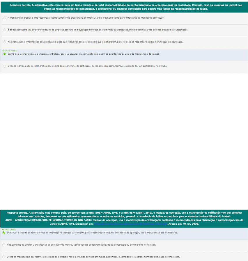Resposta correta. A alternativa está correta, pois um Laudo técnico é de total responsabilidade do perito habilitado na area para qual foi contratado. Contudo, caso os usuários do imóvel não sigam as recomendações de manutenção, profissional ou empresa contratada para pericia fica isenta da responsabilidade do Laudo. A manutenção predial uma responsabilidade somente do do imóvel, sendo arquivada como parte integrante do manual da edificação. E de responsabilidade do profissional ou da empresa contratada a avaliação de todos elementos da edificação, mesmo aquelas que não puderem ser As orientações e informações constatadas no laudo são exclusivas aos profissionais que pois eles são os responsáveis pela manutenção da Resposta correta Exime-se profissional ou a empresa contratada, caso usuários da edificação não sigam as orientações de uso e de manutenção do laudo técnico pode ser elaborado pelo sindico ou proprietário da edificação, desde que seja posteriormente avaliado por um profissional Resposta correta. A alternativa está correta, pois, de acordo com a NBR (ABNT, e a NBR 5674 (ABNT, 2012), manual de operação, uso e manutenção da edificação tem por objetivo: informar aos usuários, descrever os procedimentos recomendáveis, orientar os usuários, prevenir a ocorrência de falhas e contribuir para aumento da do imóvel. ABNT ASSOCIAÇÃO BRASILEIRA DE NORMAS NBR 14037: manual de operação, uso e manutenção das edificações: conteúdo e recomendações para elaboração e apresentação. Rio de Janeiro: ABNT, 1998. Disponível em: Acesso em: 10 jun. 2020. Resposta correta manual restrito ao fornecimento de informações técnicas unicamente para das atividades de operação, uso manutenção das edificações. Não compete ao sindico a atualização do do manual, sendo apenas de responsabilidade da construtora ou de um perito uso do manual deve ser restrito ao sindico do e não e permitido seu uso em mesmo que eles apresentem boa qualidade de