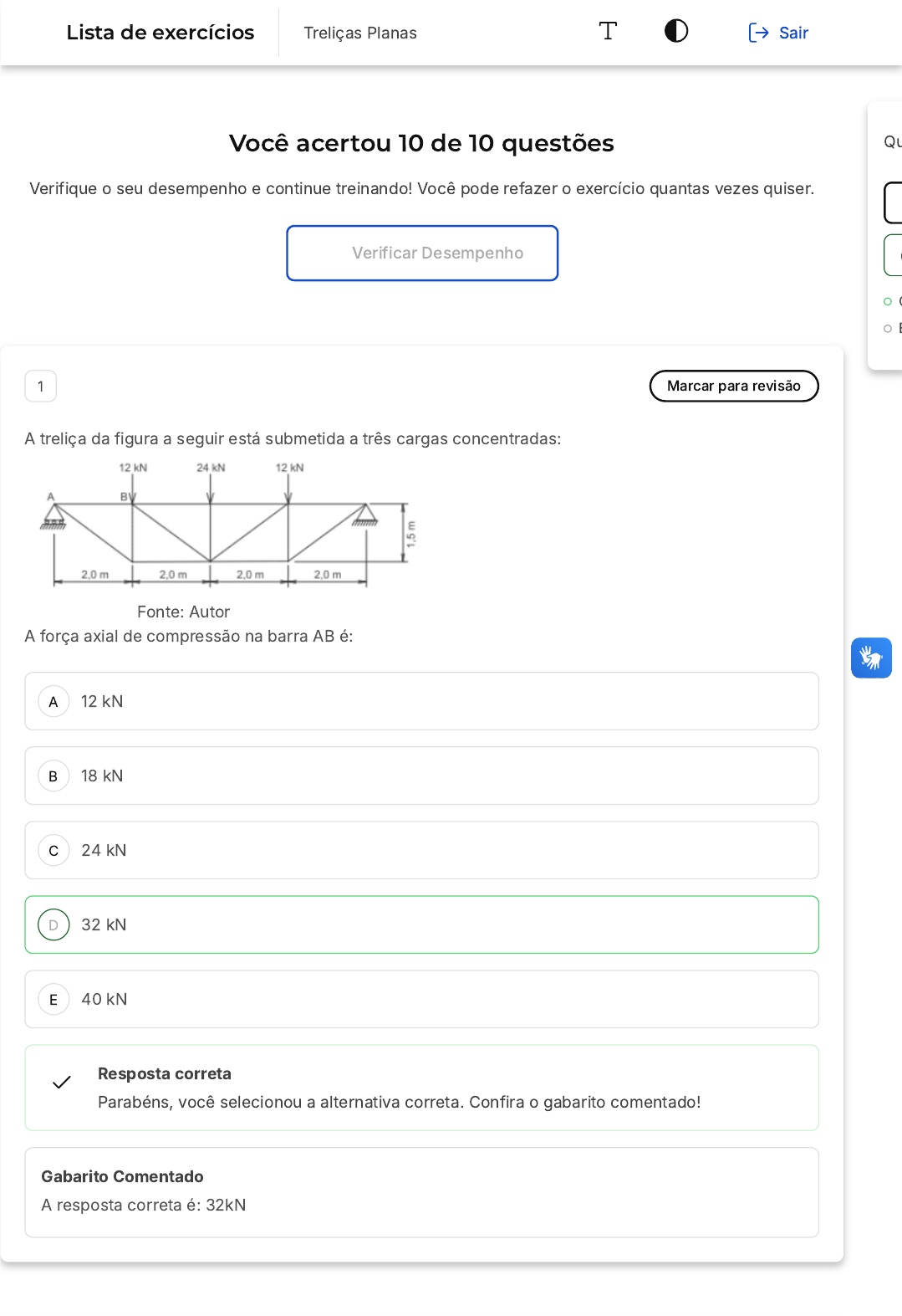 07/09/25, 01:32 estacio.saladeavaliacoes.com.br/exercicio/68bd0a1957e88db34d87e15e/gabarito/ https://estacio.saladeavaliacoes.com.br/exercicio/68bd0a1957e88db34d87e15e/gabarito/ 1/9 Você acertou 10 de 10 questões Verifique o seu desempenho e continue treinando! Você pode refazer o exercício quantas vezes quiser. Verificar Desempenho A B C D E 1 Marcar para revisão A treliça da figura a seguir está submetida a três cargas concentradas: Fonte: Autor A força axial de compressão na barra AB é: 12 kN 18 kN 24 kN 32 kN 40 kN Resposta correta Parabéns, você selecionou a alternativa correta. Confira o gabarito comentado! Gabarito Comentado A resposta correta é: 32kN Qu C E 6 Lista de exercícios Treliças Planas Sair 07/09/25, 01:32 estacio.saladeavaliacoes.com.br/exercicio/68bd0a1957e88db34d87e15e/gabarito/ https://estacio.saladeavaliacoes.com.br/exercicio/68bd0a1957e88db34d87e15e/gabarito/ 2/9 A B C D E 2 Marcar para revisão Para o projeto da estrutura de um telhado, foi utilizada a treliça da figura a seguir: Fonte: Autor A barra DE está solicitada a um esforço de compressão de: 2,40 kN 4,50 kN 3,00 kN 5,00 kN 1,80 kN Resposta correta Parabéns, você selecionou a alternativa correta. Confira o gabarito comentado! Gabarito Comentado A resposta correta é: 5,00 kN 3 Marcar para revisão A treliça metálica representada na figura a seguir está submetida ao carregamento indicado: Fonte: Autor 07/09/25, 01:32 estacio.saladeavaliacoes.com.br/exercicio/68bd0a1957e88db34d87e15e/gabarito/ https://estacio.saladeavaliacoes.com.br/exercicio/68bd0a1957e88db34d87e15e/gabarito/ 3/9 A B C D E As letras maiúsculas representam os encontros das barras em nós rotulados. Sabendo que as barras AB, CD, AC e BD têm o mesmo comprimento, assinale a alternativa correta: Não há reação de apoio em D. A barra BC está tracionada. Os esforços nas barras AB e CD têm o mesmo valor. A reação vertical em C é igual a 5t. Nenhuma barra está sujeita a esforço nulo. Resposta correta Parabéns, você selecionou a alternativa correta. Confira o gabarito comentado! Gabarito Comentado A resposta correta é: Os esforços nas barras AB e CD têm o mesmo valor. Não há reação de apoio em D. ¿ Falsa. O apoio D possui uma reação na componente y de 10t. A barra BC está tracionada. Falso. Está sob compressão. A reação vertical em C é igual a 5t. Falso. A reação vertical C é menor que 5t, pois divide a carga 5t com a reação vertical em D. Nenhuma barra está sujeita a esforço nulo. Falso. Nenhuma barra tem esforço nulo Os esforços nas barras AB e CD têm o mesmo valor. Verdadeiro Como todas as AB, CD, AC e BD tem o mesmo comprimento, vamos arbitrar o valor de 1 m. Assim, o triângulo formado pelas barras CD, BD e BC tem lados com 1m, 1m e , respectivamente. Valor obtido aplicando o teorema de Pitágoras. Reações de apoio: Método dos nós: Ponto A� √2 07/09/25, 01:32 estacio.saladeavaliacoes.com.br/exercicio/68bd0a1957e88db34d87e15e/gabarito/ https://estacio.saladeavaliacoes.com.br/exercicio/68bd0a1957e88db34d87e15e/gabarito/ 4/9 A B C D E Ponto D� Ponto C� Ponto B� + ↑ ∑Fy = 0 ∴ −FAC − 5 = 0 ∴ FAC = −5t = 5t Compressoão +↑ ∑Fy = 0 ∴ RDy + FBD = 0 ∴ FBD = 10t Tração ⎧⎪⎪⎪ ⎨ ⎪⎪⎪⎩ + ↑ ∑Fy = 0 ∴ RCy + FAC + FBC ⋅ = 0 ∴ FBC = −20√2t = 20√2t Compressão +∑Fx = 0 ∴ RCx + FCD + FBC ⋅ = 0 ∴ FCD = 10t Tração 1 √2 1 √2 ⎧ ⎨⎩ + ↑ ∑Fy = 0 ∴ −FBD − FBC ⋅ = 0 ∴ FBD = −20t = 20 t Compressão + → ∑Fx = 0 ∴ FAB − 10 − FBC ⋅ = 0 ∴ FAB = 10t Tração 1 √2 1 √2 4 Marcar para revisão No projeto de estruturas metálicas, as treliças planas são utilizadas para garantir resistência e estabilidade às estruturas. Entre os tipos de treliça plana abaixo, qual deles é caracterizado por ter barras diagonais inclinadas alternadamente para cima e para baixo? Treliça Warren. Treliça Howe. Treliça Pratt. Treliça Kiewitt. Treliça Poligonal. Resposta correta Parabéns, você selecionou a alternativa correta. Confira o gabarito comentado! Gabarito Comentado A treliça Howe é caracterizada por ter barras diagonais inclinadas alternadamente para cima e para baixo. Esse tipo de treliça é amplamente utilizado em diversas aplicações, como estruturas de telhados, devido à sua capacidade de distribuir as cargas de forma eficiente e proporcionar uma estrutura estável. 07/09/25, 01:32 estacio.saladeavaliacoes.com.br/exercicio/68bd0a1957e88db34d87e15e/gabarito/ https://estacio.saladeavaliacoes.com.br/exercicio/68bd0a1957e88db34d87e15e/gabarito/ 5/9 A B C D E 5 Marcar para revisão Uma treliça plana é composta por barras e nós, e é utilizada para suportar cargas e transmiti-las para os apoios. O método dos nós e o método das seções são amplamente utilizados para analisar treliças. Em relação a esses métodos, assinale a alternativa correta: O método dos nós é usado para determinar as forças internas em cada barra da treliça, enquanto o método das seções é usado para calcular a força total em um determinado segmento da treliça. O método dos nós é usado para determinar as forças internas em cada barra da treliça, enquanto o método das seções é usado para calcular as forças nos apoios da treliça. O método dos nós é usado para determinar as forças totais em cada barra da treliça, enquanto o método das seções é usado para calcular as forças nos apoios da treliça. O método dos nós é usado para determinar as forças totais em cada barra da treliça, enquanto o método das seções é usado para calcular as forças resultantes nas juntas da treliça. O método dos nós é usado para determinar as forças totais em cada barra da treliça, enquanto o método das seções é usado para calcular as forças resultantes em um determinado segmento da treliça. Resposta correta Parabéns, você selecionou a alternativa correta. Confira o gabarito comentado! Gabar