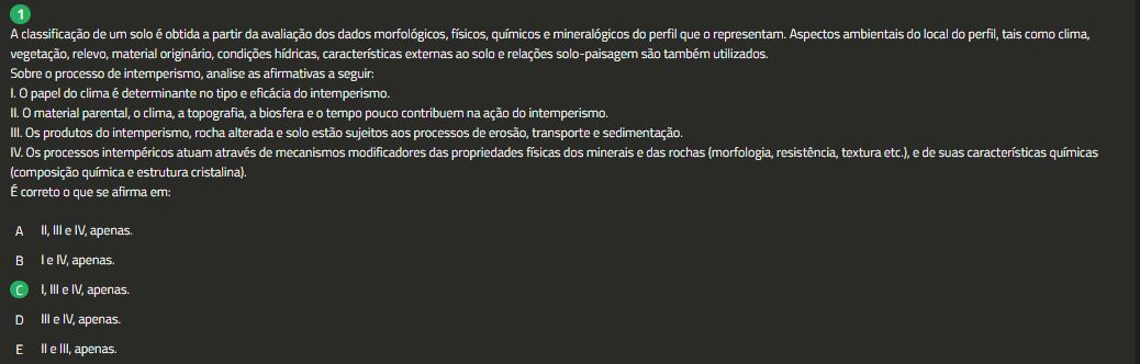 1 A classificação de um solo é obtida a partir da avaliação dos dados morfológicos, físicos, químicos e mineralógicos do perfil que 0 representam. Aspectos ambientais do local do perfil, tais como clima, vegetação, relevo, material condições hídricas, características externas ao solo e relações solo-paisagem são também utilizados. Sobre processo de intemperismo, analise as afirmativas a seguir: papel do clima é determinante no tipo e eficácia do intemperismo. II. material parental, clima, a topografia, a biosfera e 0 tempo pouco contribuem na ação do intemperismo. III. Os produtos do intemperismo, rocha alterada e solo estão sujeitos aos processos de erosão, transporte e sedimentação. IV. Os processos intempéricos atuam através de mecanismos modificadores das propriedades dos minerais e das rochas (morfologia, resistência, textura etc.), e de suas características (composição e estrutura cristalina). É correto que se afirma em: A II, III e IV, apenas. B le IV, apenas. I, III e IV, apenas. D III e IV, apenas. E II e III, apenas.