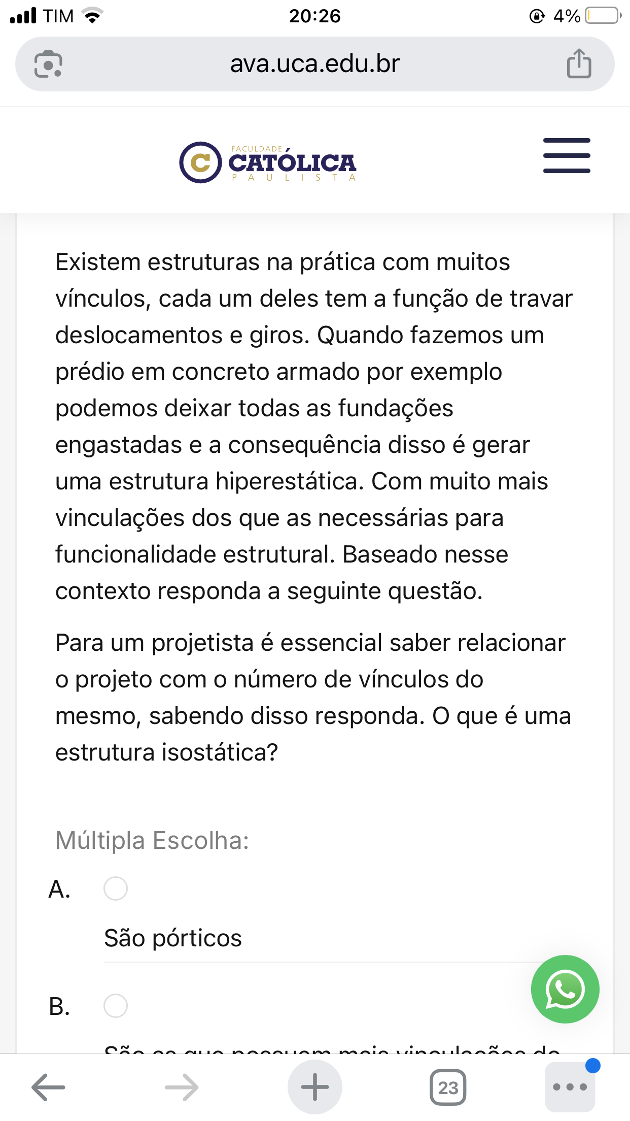 TIM 20:26 4% ava.uca.edu.br FACULDADE CATOLICA PAULISTA Existem estruturas na prática com muitos vínculos, cada um deles tem a função de travar deslocamentos e giros. Quando fazemos um prédio em concreto armado por exemplo podemos deixar todas as fundações engastadas e a consequência disso é gerar uma estrutura hiperestática. Com muito mais vinculações dos que as necessárias para funcionalidade estrutural. Baseado nesse contexto responda a seguinte questão. Para um projetista é essencial saber relacionar projeto com número de vínculos do mesmo, sabendo disso responda. que é uma estrutura isostática? Múltipla Escolha: São pórticos + 23