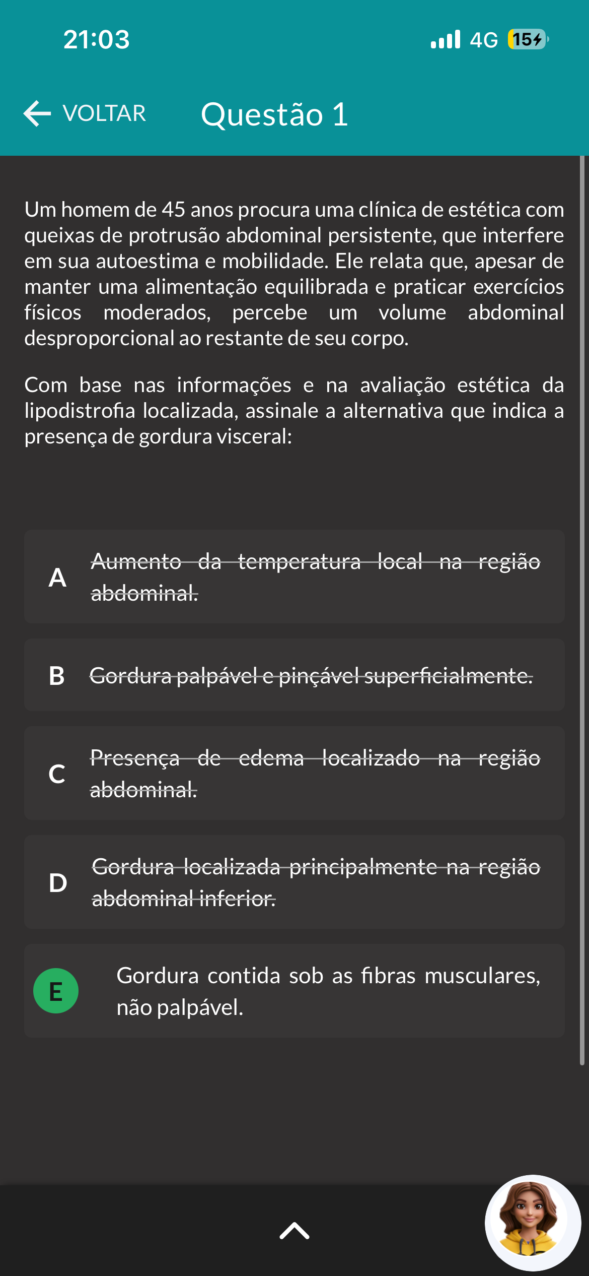 21:03 4G 154 VOLTAR Questão 1 Um homem de 45 anos procura uma clínica de estética com queixas de protrusão abdominal persistente, que interfere em sua autoestima e mobilidade. Ele relata que, apesar de manter uma alimentação equilibrada e praticar exercícios físicos moderados, percebe um volume abdominal desproporcional ao restante de seu corpo. Com base nas informações e na avaliação estética da lipodistrofia localizada, assinale a alternativa que indica a presença de gordura visceral: Aumento da temperatura local na região A abdominal. Gordura palpável e pinçável superficialmente. Presença de edema localizado na região c abdominal. Gordura localizada principalmente na região D abdominal inferior. Gordura contida sob as fibras musculares, E não palpável.