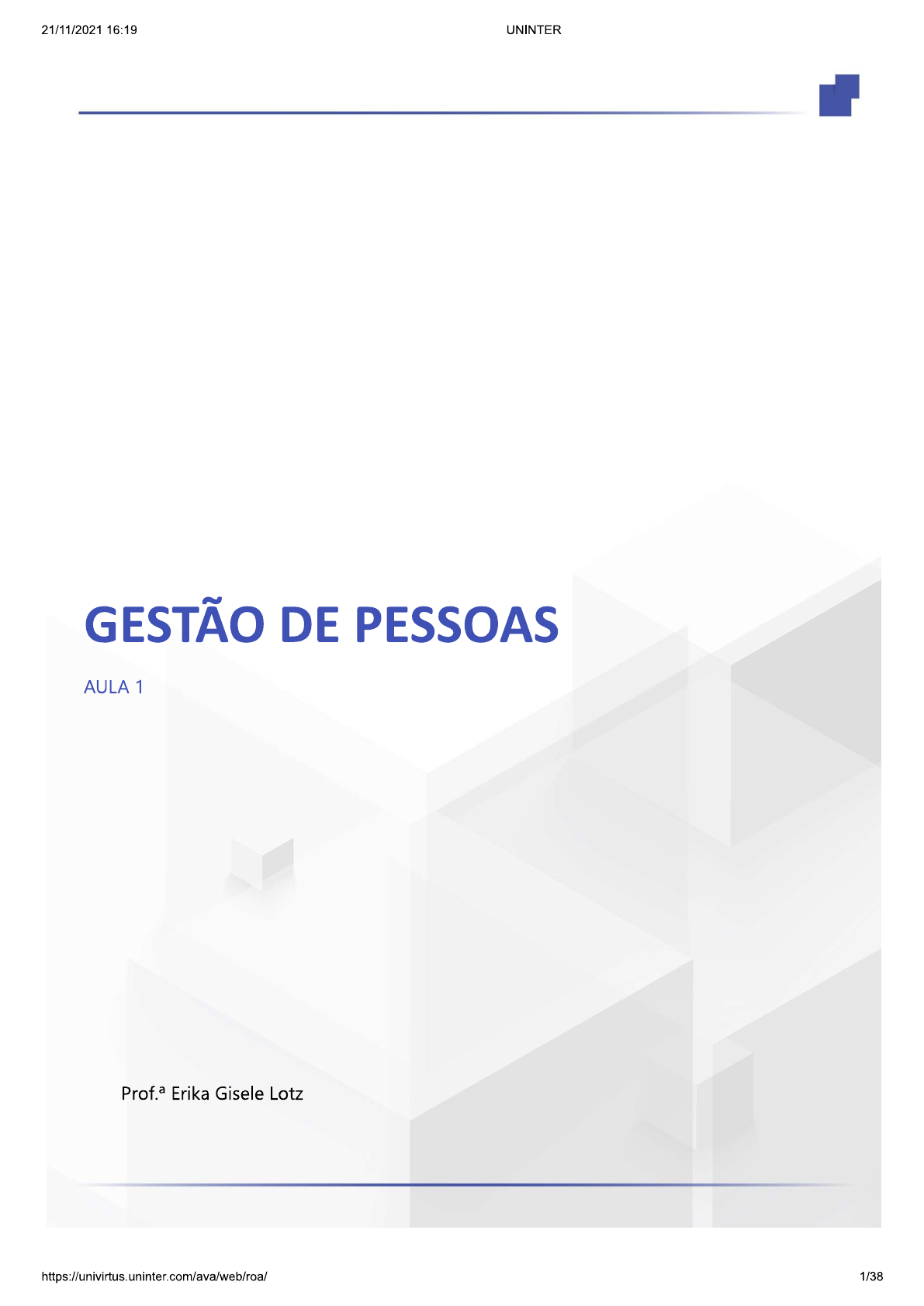 21/11/2021 16:19 UNINTER GESTÃO DE PESSOAS AULA 1 Erika Gisele Lotz 1/3821/11/2021 16:19 UNINTER CONVERSA INICIAL É possível que, ao se deparar com título desta disciplina, você tenha questionado motivo de estudar gestão de pessoas, sendo que não escolheu atuar na área de recursos humanos. Qual é a importância de conhecer os trâmites de gestão de pessoas, já que estes são de responsabilidade de um outro departamento e área de conhecimento da empresa? Eis o motivo fundamental desta disciplina fazer parte da sua grade curricular! Gerir pessoas não é ação de responsabilidade única da área de RH. Compete ao RH desenvolver e aplicar políticas de gestão de pessoas, planejar a área alinhada aos objetivos estratégicos da organização, entre outros. Contudo, mais marcante protagonismo da gestão de pessoas é do gestor da área. É ele que, no dia a dia da operação, dá tom do relacionamento interpessoal, oferece abertura e apoio à aprendizagem e à produtividade; vivencia os valores da organização; utiliza conflitos como fonte de desenvolvimento; articula as capacidades e talentos humanos. sem dúvida alguma, a forma como gestor faz isso é determinante na percepção de satisfação ou insatisfação da equipe; no engajamento ou no descomprometimento; na saúde ou no adoecimento do clima organizacional e das pessoas no trabalho. Em outras palavras, a forma como a gestão de pessoas é realizada, além das políticas do RH, é determinante na atração e retenção de talentos, na produtividade, na competitividade (haja vista a evasão dos talentos para a concorrência); na rentabilidade e na sustentabilidade da organização. Outro aspecto que assinala a relevância desta disciplina na sua grade curricular é a existência da indissociável relação entre pessoas e resultados. Lacombe (2009, p. 3) define gestão como "obter resultados por meio de pessoas, ou seja, é o ato de trabalhar com pessoas para realizar os objetivos da organização e de seus membros". Em outros termos, para que uma empresa possa atrair, gerir e, sobretudo, manter os melhores talentos, é essencial que os líderes estejam comprometidos com a gestão de pessoas. departamento de RH não tem poder de levar a termo esse objetivo sem protagonismo dos gestores de linha, pois "a chave para gerenciar pessoas em direção à produtividade e ao aprendizado está, em última instância, na perspectiva do gerente", explicam Pfeffer e Veigas (1999, citados por Silva, 2006, p. 78). 2/3821/11/2021 16:19 UNINTER Agora, resta-nos esclarecer quem é considerado gestor de pessoas ao longo da jornada desta disciplina. Consideramos gestor de pessoas todo aquele profissional que tem sobre si a responsabilidade de orientar e conduzir ações e resultados de outro profissional na organização. gestor de área, ou aquele que tenha apenas um outro profissional cuja produtividade está sob sua responsabilidade, é gestor de pessoas, dado que, suas ações, no exercício de suas atribuições, são determinadas pelo grau de suas competências técnicas e socioemocionais e impactam diretamente resultado do trabalho de outra pessoa. Queremos trazer aqui, para apoiar nossa reflexão, resultado de uma pesquisa que, embora possa parecer um tanto antiga, contribui para reflexões muito profundas acerca do protagonismo do gestor ou superior hierárquico no que tange ao employee experience (experiência do empregado); ao employer branding (marca empregadora); no clima organizacional; na retenção de talentos e na produtividade. Este estudo, conduzido ao longo de décadas pelas Organizações Gallup com 80.000 gerentes em 400 companhias, e validado pela Harvard Management Update (2000), constatou que a qualidade do relacionamento entre colaboradores e gestores imediatos é mais importante para a permanência do profissional talentoso na organização do que a substancial política de salários e benefícios (Silva, 2006). profissional pode até ingressar na organização fortemente atraído por generosos pacotes de benefícios ofertados aos funcionários ou por notáveis políticas de valorização. Contudo, é relacionamento com os gestores imediatos que determinará por quanto tempo esse colaborador talentoso permanecerá na empresa, dado que florescer do comprometimento e a retenção dos talentos está diretamente relacionada à capacidade de liderança dos supervisores imediatos (Silva, 2006). Assim, fica evidente que a tarefa do setor de Recursos Humanos da empresa é a de promover desenvolvimento das pessoas e a retenção dos talentos por meio dos gestores de linha. Organizações orientadas para as pessoas chegam até mesmo a estabelecer responsabilidades, metas claras e recompensas aos gestores para que mantenham a baixos patamares os níveis de evasão de pessoas. Os gestores são peça-chave na empresa por compreenderem claramente impacto devastador da perda de um talento para a concorrência. https://univirtus.uninter.com/ava/web/roa/ 3/3821/11/2021 16:19 UNINTER Dada a notoriedade do tema, esta disciplina tem por propósito municiar você de conhecimentos e técnicas, para que possa compreender a atuação do RH na organização. Mas, especialmente, nosso objetivo é permitir que você desenvolva a acurácia do olhar sobre as práticas do exercício da liderança e sobre os profundos impactos desta na saúde, na produtividade, no clima e ambiente de trabalho, assim como no desempenho da organização. 1 GESTÃO Nenhuma empresa é melhor do que o seu administrador permite. (Peter Drucker) que especificamente significa gestão? Quais são as ações e atividades que compõem este processo? Gerir é, por essência, o processo de planejar, organizar, coordenar, liderar, dirigir, acompanhar, aferir resultados e controlar os esforços de um grupo de pessoas para atingir um resultado comum (Lacombe; Heilborn, 2003, p. 48). Vamos olhar agora para cada uma dessas funções essenciais. 1.1 PLANEJAMENTO melhor maneira d