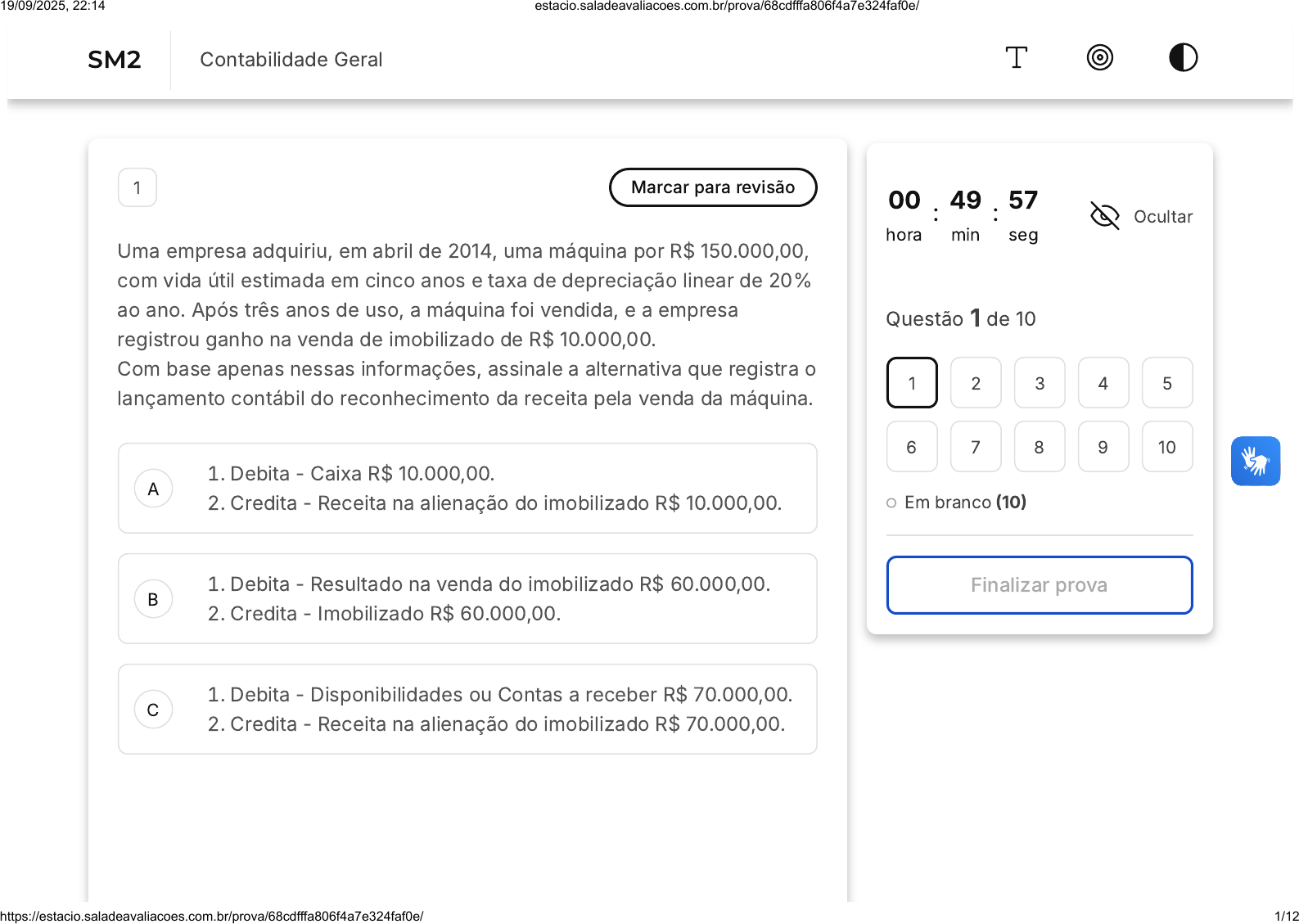 A B C 1 Marcar para revisão Uma empresa adquiriu, em abril de 2014, uma máquina por R$ 150.000,00, com vida útil estimada em cinco anos e taxa de depreciação linear de 20% ao ano. Após três anos de uso, a máquina foi vendida, e a empresa registrou ganho na venda de imobilizado de R$ 10.000,00. Com base apenas nessas informações, assinale a alternativa que registra o lançamento contábil do reconhecimento da receita pela venda da máquina. 1. Debita - Caixa R$ 10.000,00. 2. Credita - Receita na alienação do imobilizado R$ 10.000,00. 1. Debita - Resultado na venda do imobilizado R$ 60.000,00. 2. Credita - Imobilizado R$ 60.000,00. 1. Debita - Disponibilidades ou Contas a receber R$ 70.000,00. 2. Credita - Receita na alienação do imobilizado R$ 70.000,00. 00 hora : 49 min : 57 seg Ocultar Questão 1 de 10 Em branco (10) Finalizar prova 1 2 3 4 5 6 7 8 9 10 SM2 Contabilidade Geral 19/09/2025, 22:14 estacio.saladeavaliacoes.com.br/prova/68cdfffa806f4a7e324faf0e/ https://estacio.saladeavaliacoes.com.br/prova/68cdfffa806f4a7e324faf0e/ 1/12 D E A B C 1. Debita - Receita na venda do imobilizado R$ 60.000,00. 2. Credita - Imobilizado R$ 60.000,00. 1. Debita - Máquinas e equipamentos R$ 150.000,00. 2. Credita - Depreciação acumulada R$ 90.000,00. 3. Credita - Despesas de depreciação R$ 60.000,00. 2 Marcar para revisão Uma sociedade empresarial consiste na união de duas ou mais pessoas com um interesse em comum para exercer uma atividade, podendo existir em modelos como a sociedade simples, sociedade limitada, sociedade em nome coletivo, dentre outras. Antes da lei 10.406/2002, era chamada de: Sociedade Comercial. Sociedade Material. Compatibilidade Anônima. 19/09/2025, 22:14 estacio.saladeavaliacoes.com.br/prova/68cdfffa806f4a7e324faf0e/ https://estacio.saladeavaliacoes.com.br/prova/68cdfffa806f4a7e324faf0e/ 2/12 D E A B C Tramutação Comercial. Modelo Empresaria. 3 Marcar para revisão O principal objetivo das demonstrações contábeis é revelar informações valiosas sobre o desempenho econômico e financeiro de sua empresa, servindo de apoio para a tomada de decisão dos gestores, sócios e investidores. São consideradas Empresas de Grande Porte aquelas que apresentam um Porte da Entidade de: Ativo Total maior que R$ 240 milhões. Receita inferior a R$ 300 milhões. Ativo Total menor que R$ 240 milhões. 19/09/2025, 22:14 estacio.saladeavaliacoes.com.br/prova/68cdfffa806f4a7e324faf0e/ https://estacio.saladeavaliacoes.com.br/prova/68cdfffa806f4a7e324faf0e/ 3/12 D E A B C Receita entre R$ 3,6 milhões e R$ 300 milhões. Receita menor que R$ 3,6 milhões. 4 Marcar para revisão FGV 2022 Banca Além de apresentar informações sobre a posição patrimonial e financeira e sobre o desempenho das entidades, as demonstrações contábeis também podem fornecer informações úteis para o processo de planejamento e execução do orçamento, tanto por determinação legal quanto por decisões de gestão. A apuração do superávit financeiro que pode servir como fonte de recursos para suplementar dotações orçamentárias deve ter por base o(a): Balanço financeiro. Balanço orçamentário. Balanço patrimonial. 19/09/2025, 22:14 estacio.saladeavaliacoes.com.br/prova/68cdfffa806f4a7e324faf0e/ https://estacio.saladeavaliacoes.com.br/prova/68cdfffa806f4a7e324faf0e/ 4/12 D E A B C Demonstração das variações patrimoniais. Demonstração dos fluxos de caixa. 5 Marcar para revisão As demonstrações contábeis são relatórios de desempenho que expõem a performance financeira e econômica de uma empresa. O objetivo é proporcionar transparência das informações entre a empresa, os acionistas e os sócios. De acordo com a Lei 6.404/76, as demonstrações são obrigatórias para empresas que possuem acionistas. São consideradas Empresas de Pequeno Porte ou Microempresas aquelas que apresentam um Porte da Entidade de: Ativo Total maior que R$ 240 milhões. Receita superior a R$ 300 milhões. Ativo Total menor que R$ 240 milhões. 19/09/2025, 22:14 estacio.saladeavaliacoes.com.br/prova/68cdfffa806f4a7e324faf0e/ https://estacio.saladeavaliacoes.com.br/prova/68cdfffa806f4a7e324faf0e/ 5/12 D E A B C D E Receita entre R$ 3,6 milhões e R$ 300 milhões. Receita menor que R$ 3,6 milhões. 6 Marcar para revisão O registro da venda à vista de um estoque provoca Um aumento do passivo circulante. A diminuição do patrimônio líquido. Um crédito em conta de ativo. Uma diminuição de um passivo circulante. Alteração na situação líquida da empresa. 19/09/2025, 22:14 estacio.saladeavaliacoes.com.br/prova/68cdfffa806f4a7e324faf0e/ https://estacio.saladeavaliacoes.com.br/prova/68cdfffa806f4a7e324faf0e/ 6/12 A B C D E 7 Marcar para revisão Uma determinada empresa contratou, em 1/10/2009, um seguro anual para cobertura de incêndio, do seu imobilizado avaliado em R$ 600.000. Na ocasião, o prêmio cobrado pela seguradora foi de R$ 18.000, com uma entrada de 20% e o restante a ser pago em 10 prestações iguais, a vencer a cada dia 30. Por ocasião da elaboração do balanço patrimonial, em 31/12/2009, o montante da conta Seguros a Vencer era de: R$ 10.080 R$ 12.600 R$ 13.500 R$ 13.680 R$ 14.400 19/09/2025, 22:14 estacio.saladeavaliacoes.com.br/prova/68cdfffa806f4a7e324faf0e/ https://estacio.saladeavaliacoes.com.br/prova/68cdfffa806f4a7e324faf0e/ 7/12 A B C D E 8 Marcar para revisão Identifique o valor que deverá constar registrado, a título de estoque de mercadorias, para venda oriunda de uma transação realizada com os seguintes valores: Camisas R$ 200.000,00 Desconto comercial (R$ 20.000,00) Desconto financeiro (R$ 2.000,00) Frete R$ 5.000,00 R$ 200.000,00 R$ 180.000,00 R$ 185.000,00 R$ 183.000,00 R$ 205.000,00 19/09/2025, 22:14 estacio.saladeavaliacoes.com.br/prova/68cdfffa806f4a7e324faf0e/ https://estacio.saladeavaliacoes.com.br/prova/68cdfffa806f4a7e324faf0e/ 8/12 9 Marcar para revisão Com base no balancete de verificação da empresa Cristais Transparentes Indústria e Com