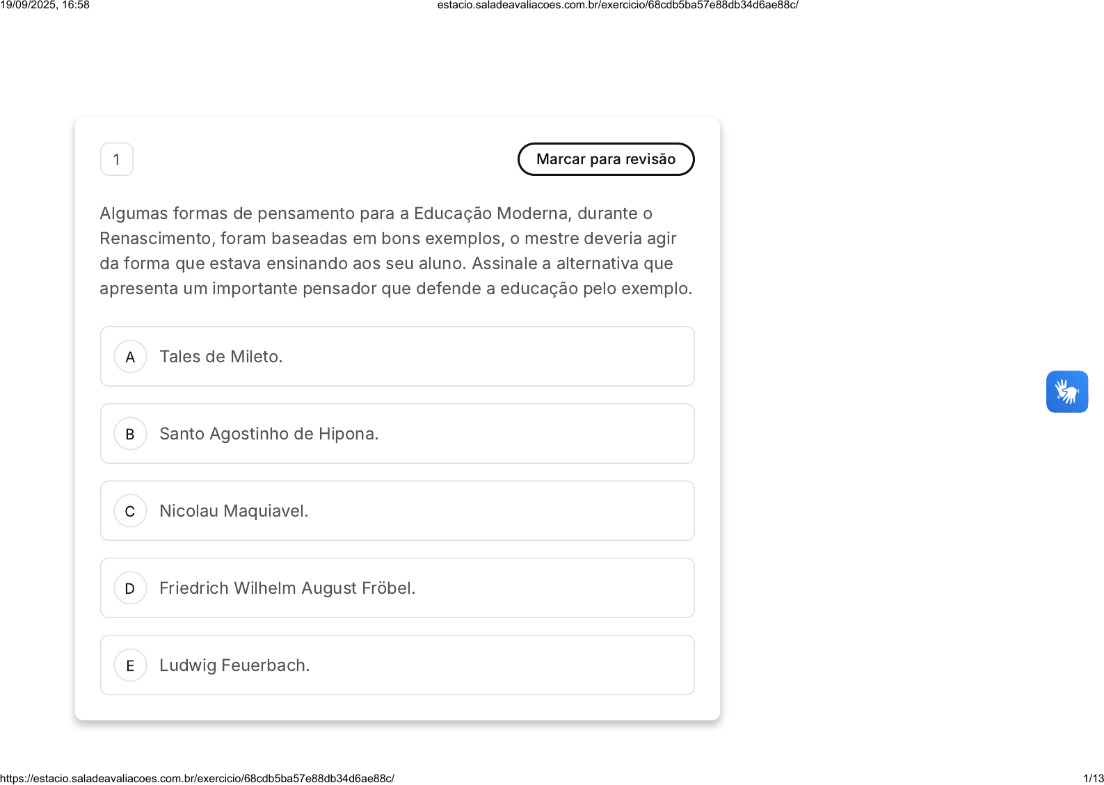 A B C D E 1 Marcar para revisão Algumas formas de pensamento para a Educação Moderna, durante o Renascimento, foram baseadas em bons exemplos, o mestre deveria agir da forma que estava ensinando aos seu aluno. Assinale a alternativa que apresenta um importante pensador que defende a educação pelo exemplo. Tales de Mileto. Santo Agostinho de Hipona. Nicolau Maquiavel. Friedrich Wilhelm August Fröbel. Ludwig Feuerbach. 19/09/2025, 16:58 estacio.saladeavaliacoes.com.br/exercicio/68cdb5ba57e88db34d6ae88c/ https://estacio.saladeavaliacoes.com.br/exercicio/68cdb5ba57e88db34d6ae88c/ 1/13 A B C D E 2 Marcar para revisão Os historiadores costumam dividir o tempo em eras, de modo a estudá-lo melhor. Dentre as alternativas abaixo, assinale a que se refere ao período entre a tomada de Constantinopla pelos turcos otomanos e a Revolução Francesa: Idade Antiga Idade Média Idade Contemporânea Pré-História Idade Moderna 3 Marcar para revisão 19/09/2025, 16:58 estacio.saladeavaliacoes.com.br/exercicio/68cdb5ba57e88db34d6ae88c/ https://estacio.saladeavaliacoes.com.br/exercicio/68cdb5ba57e88db34d6ae88c/ 2/13 A B C D E A Reforma e a Contrarreforma da Igreja Cristã não eram sobre não acreditar em Deus e sim na forma como era mais considerada mais coerente a prática religiosa. A partir dessa premissa avalie as asserções a seguir e a relação proposta entre elas I. A Reforma proposta por Martinho Lutero foi importante para a educação PORQUE II. Um de seus ideais era defender que a educação não fosse restrita ao clero e a nobreza. A respeito dessas asserções, assinale a opção correta. As asserções I e II são proposições verdadeiras, e a II complementa corretamente a I. As asserções I e II são proposições verdadeiras, mas a II não complementa corretamente a I. A asserção I é uma proposição falsa, e a II é uma proposição verdadeira. A asserção I é uma proposição verdadeira, e a II é uma proposição falsa. As asserções I e II são proposições falsas. Questão 4 de 10 Em branco (10) 1 2 3 4 5 6 7 8 9 10 Finalizar exercícios Lista de exercícios Conteúdo Sair e finalizar depois 19/09/2025, 16:58 estacio.saladeavaliacoes.com.br/exercicio/68cdb5ba57e88db34d6ae88c/ https://estacio.saladeavaliacoes.com.br/exercicio/68cdb5ba57e88db34d6ae88c/ 3/13 A B C D E 4 Marcar para revisão Com as guerras napoleônicas, houve o crescimento do número de crianças órfãs, especialmente na França. Pestalozzi buscou reunir essas crianças para que fossem cuidadas e educadas, desenvolvendo algumas de suas ideias mais significativas a partir de então. Segundo as ideias pedagógicas de Pestalozzi, qual dos elementos apresentados nas alternativas abaixo é fundamental para o processo educativo? A alfabetização bilíngue. A aprendizagem a partir do contexto social do educando. A disciplina. O afeto. O desenvolvimento sensório-motor. 19/09/2025, 16:58 estacio.saladeavaliacoes.com.br/exercicio/68cdb5ba57e88db34d6ae88c/ https://estacio.saladeavaliacoes.com.br/exercicio/68cdb5ba57e88db34d6ae88c/ 4/13 A B C D E 5 Marcar para revisão Marque a alternativa que explica o conceito de burguesia: A burguesia é uma corrente aristocrática veneziana do século XIV conhecida por seus extravagantes e elaborados trajes de festa, os quais deram origem ao Carnaval. A burguesia era um grupo de pessoas descendentes de Marc Burgos, Duque de Castilla, especialistas em transações comerciais na Península Arábica. A burguesia surge como classe social formada por comerciantes que ascendia financeira e socialmente, ao passo que enfraquecia o sistema feudal. O termo "burguesia" se refere a cidadãos abastados da Zona Sul do Rio de Janeiro, os quais trabalham como artesãos. Os burgueses são pessoas que apresentam ascendência inglesa, mas têm suas propriedades no sul da Índia, produzindo chá. 19/09/2025, 16:58 estacio.saladeavaliacoes.com.br/exercicio/68cdb5ba57e88db34d6ae88c/ https://estacio.saladeavaliacoes.com.br/exercicio/68cdb5ba57e88db34d6ae88c/ 5/13 A B C 6 Marcar para revisão Johann Friedrich Herbart compartilhava com a Locke a crença de que nascemos sem conhecimento e vamos adquirindo com o passar do tempo, em nossa vida. Sua abordagem de ensino/aprendizagem via a educação como ciência, com métodos e formas de avaliação, visando não apenas o acúmulo de conteúdos, mas também a formação moral do indivíduo. São as bases de sua abordagem: I. Instrução, o processo de ensino deveria ter como base as aptidões e interesses do educando, formando não apenas sua intelectualidade, mas também transmitindo moralidade. II. Governo, os primeiros a educarem uma criança são os pais, ensinando-a a controlar seu comportamento, depois viriam os professores. III. Disciplina, o educando é responsável por manter os conhecimentos adquiridos e buscar mais conhecimento. É correto o que se afirma em: I, apenas. II, apenas. I e III, apenas. 19/09/2025, 16:58 estacio.saladeavaliacoes.com.br/exercicio/68cdb5ba57e88db34d6ae88c/ https://estacio.saladeavaliacoes.com.br/exercicio/68cdb5ba57e88db34d6ae88c/ 6/13 D E II e III, apenas. I, II e III. 7 Marcar para revisão O pensamento moderno focou em sistematizar a educação de forma que esta pudesse ser mais produtiva. Com isso diversos autores surgiram propondo suas formas de ensino e aprendizagem. Sobre as propostas de Johann Heinrich Pestalozzi analise as afirmações: I. A pedagogia de Pestalozzi, pode ser definida como a pedagogia do afeto II. Pestalozzi não tinha formação religiosa e era agricultor, por isso entendia as crianças como sementes que precisam de cuidado para florescer. III. Em sua busca de ajudar ao próximo voltou seus esforços para a educação, teorizando formas completas e eficientes de educação. IV. Em sua teoria a escola era comparada a uma casa, que precisa de amor, organização e disciplina para funcionar. É correto o que se afirma em: 19/09/2025, 16:58 estacio.saladeavaliacoes.com.br/exercicio/68cdb5ba57e88