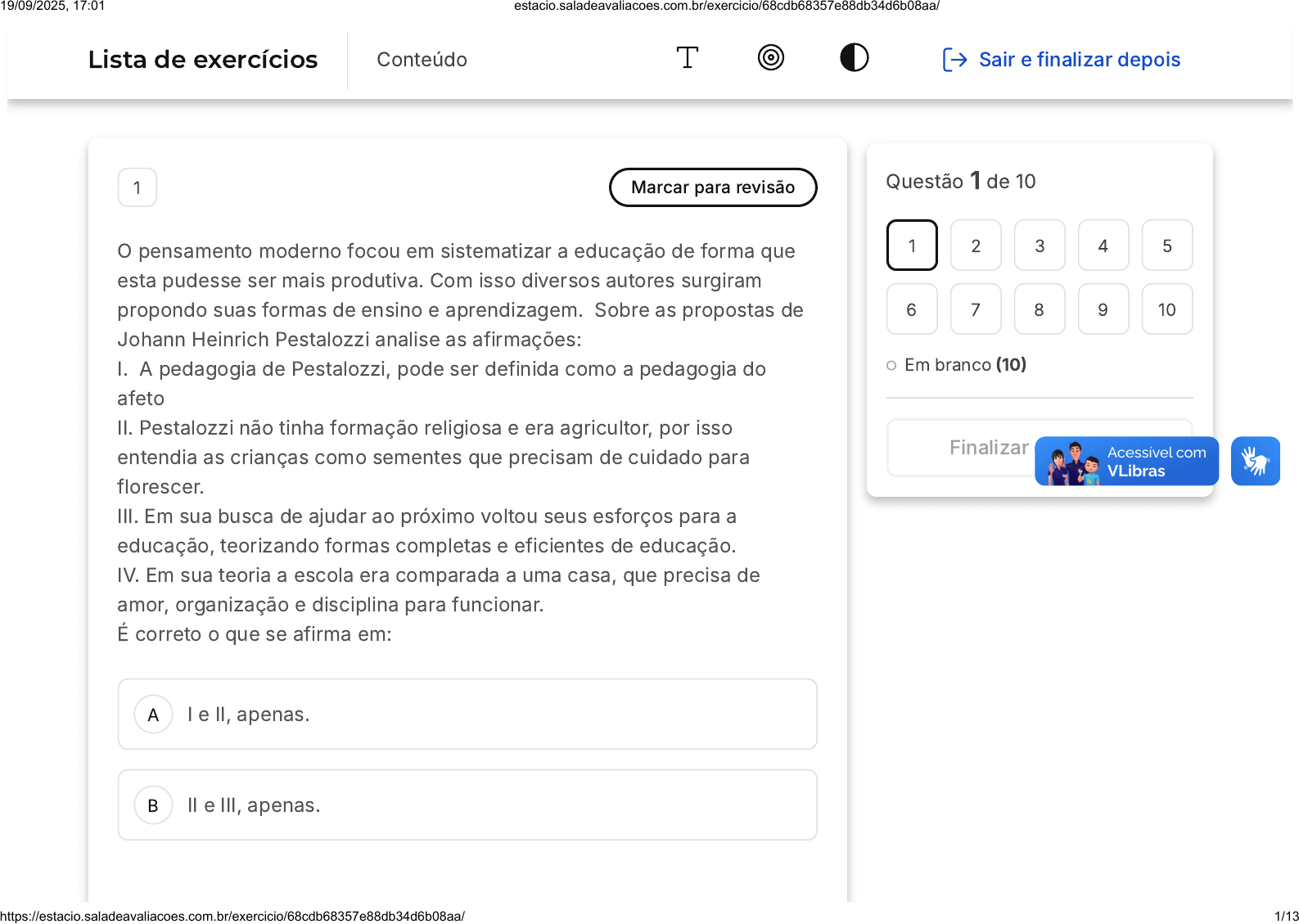 A B 1 Marcar para revisão O pensamento moderno focou em sistematizar a educação de forma que esta pudesse ser mais produtiva. Com isso diversos autores surgiram propondo suas formas de ensino e aprendizagem. Sobre as propostas de Johann Heinrich Pestalozzi analise as afirmações: I. A pedagogia de Pestalozzi, pode ser definida como a pedagogia do afeto II. Pestalozzi não tinha formação religiosa e era agricultor, por isso entendia as crianças como sementes que precisam de cuidado para florescer. III. Em sua busca de ajudar ao próximo voltou seus esforços para a educação, teorizando formas completas e eficientes de educação. IV. Em sua teoria a escola era comparada a uma casa, que precisa de amor, organização e disciplina para funcionar. É correto o que se afirma em: I e II, apenas. II e III, apenas. Questão 1 de 10 Em branco (10) 1 2 3 4 5 6 7 8 9 10 Finalizar exercícios Lista de exercícios Conteúdo Sair e finalizar depois 19/09/2025, 17:01 estacio.saladeavaliacoes.com.br/exercicio/68cdb68357e88db34d6b08aa/ https://estacio.saladeavaliacoes.com.br/exercicio/68cdb68357e88db34d6b08aa/ 1/13 C D E III e IV, apenas. I, II e III, apenas. I, III e IV, apenas. 2 Marcar para revisão Analise a charge a seguir e responda o que se pede 19/09/2025, 17:01 estacio.saladeavaliacoes.com.br/exercicio/68cdb68357e88db34d6b08aa/ https://estacio.saladeavaliacoes.com.br/exercicio/68cdb68357e88db34d6b08aa/ 2/13 19/09/2025, 17:01 estacio.saladeavaliacoes.com.br/exercicio/68cdb68357e88db34d6b08aa/ https://estacio.saladeavaliacoes.com.br/exercicio/68cdb68357e88db34d6b08aa/ 3/13 A B (Charge de Carlos Ruas, disponível em https://www.umsabadoqualquer.com/cada-um-com-o-seu/) Durante a Idade Média, houve franca expansão do cristianismo na Europa passando de religiões politeístas para uma monoteísta, apresentada como universal. Até esta época, a explicação divina/mitológica para os fenômenos era comum. Contudo, com o passar do tempo, essa configuração passa a mudar e a Ciência passa a ser utilizada para compreender os eventos observados pelos seres humanos. Esse movimento de validação do movimento científico ganha ênfase em qual período da História? Assinale a alternativa correta: Idade Antiga Idade Contemporânea 19/09/2025, 17:01 estacio.saladeavaliacoes.com.br/exercicio/68cdb68357e88db34d6b08aa/ https://estacio.saladeavaliacoes.com.br/exercicio/68cdb68357e88db34d6b08aa/ 4/13 C D E A B C Idade Média Idade Moderna Pré-História 3 Marcar para revisão John Locke defendia a existência de um contrato entre cada indivíduo e o Estado para manter a vida em sociedade e do bem comum. Essa abordagem o faz ser considerado um autor: Escolástico. Empirista. Epicurista. 19/09/2025, 17:01 estacio.saladeavaliacoes.com.br/exercicio/68cdb68357e88db34d6b08aa/ https://estacio.saladeavaliacoes.com.br/exercicio/68cdb68357e88db34d6b08aa/ 5/13 D E Contratualista. Liberalista. 4 Marcar para revisão Johann Friedrich Herbart compartilhava com a Locke a crença de que nascemos sem conhecimento e vamos adquirindo com o passar do tempo, em nossa vida. Sua abordagem de ensino/aprendizagem via a educação como ciência, com métodos e formas de avaliação, visando não apenas o acúmulo de conteúdos, mas também a formação moral do indivíduo. São as bases de sua abordagem: I. Instrução, o processo de ensino deveria ter como base as aptidões e interesses do educando, formando não apenas sua intelectualidade, mas também transmitindo moralidade. II. Governo, os primeiros a educarem uma criança são os pais, ensinando-a a controlar seu comportamento, depois viriam os professores. III. Disciplina, o educando é responsável por manter os conhecimentos adquiridos e buscar mais conhecimento. É correto o que se afirma em: 19/09/2025, 17:01 estacio.saladeavaliacoes.com.br/exercicio/68cdb68357e88db34d6b08aa/ https://estacio.saladeavaliacoes.com.br/exercicio/68cdb68357e88db34d6b08aa/ 6/13 A B C D E I, apenas. II, apenas. I e III, apenas. II e III, apenas. I, II e III. 5 Marcar para revisão Em 1517, Martinho Lutero, que até então era um monge agostiniano, afixou nas portas da igreja de Wittenberg as 95 teses que produziu sobre o exercício do cristianismo, criticando a Igreja Católica da época. Dentre as alternativas abaixo, qual não era uma das críticas realizadas pelos movimentos protestantes contra a Igreja Católica? 19/09/2025, 17:01 estacio.saladeavaliacoes.com.br/exercicio/68cdb68357e88db34d6b08aa/ https://estacio.saladeavaliacoes.com.br/exercicio/68cdb68357e88db34d6b08aa/ 7/13 A B C D E A venda de indulgências. Acumulação de riqueza pela Igreja. Adoração a imagens. Construção de igrejas. Salvação pelos atos. 6 Marcar para revisão A Reforma e a Contrarreforma da Igreja Cristã não eram sobre não acreditar em Deus e sim na forma como era mais considerada mais coerente a prática religiosa. A partir dessa premissa avalie as asserções a seguir e a relação proposta entre elas I. A Reforma proposta por Martinho Lutero foi importante para a educação PORQUE II. Um de seus ideais era defender que a educação não fosse restrita ao clero e a nobreza. 19/09/2025, 17:01 estacio.saladeavaliacoes.com.br/exercicio/68cdb68357e88db34d6b08aa/ https://estacio.saladeavaliacoes.com.br/exercicio/68cdb68357e88db34d6b08aa/ 8/13 A B C D E A respeito dessas asserções, assinale a opção correta. As asserções I e II são proposições verdadeiras, e a II complementa corretamente a I. As asserções I e II são proposições verdadeiras, mas a II não complementa corretamente a I. A asserção I é uma proposição falsa, e a II é uma proposição verdadeira. A asserção I é uma proposição verdadeira, e a II é uma proposição falsa. As asserções I e II são proposições falsas. 7 Marcar para revisão Com as guerras napoleônicas, houve o crescimento do número de crianças órfãs, especialmente na França. Pestalozzi buscou reunir essas crianças para que fossem cuidadas e educad