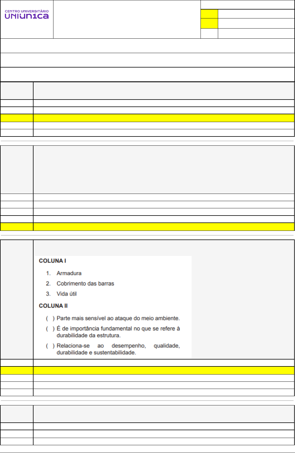 Pincel Atômico - 15/10/2025 16:37:55 1/2 KALITA FERREIRA SANTOS Avaliação Online (SALA EAD) - Capitulos/Referencias 4,5,6 Atividade finalizada em 20/08/2025 08:14:00 (4379607 / 1) LEGENDA Resposta correta na questão # Resposta correta - Questão Anulada X Resposta selecionada pelo Aluno Disciplina: CONCRETO ARMADO II [240481] - Avaliação com 5 questões, com o peso total de 15,00 pontos [capítulos - 4,5,6] Turma: Graduação: Engenharia Civil - Grupo: AGOSTO/2021 - EC/AGO/21 [24493] Aluno(a): 91344610 - KALITA FERREIRA SANTOS - Respondeu 4 questões corretas, obtendo um total de 12,00 pontos como nota [357182_92006] Questão 001 Os elementos estruturais classificados como elementos de superfície, possuem duas dimensões da mesma ordem de grandeza e a terceira acentuadamente menor. Entre as alternativas a seguir, assinale aquela que representa um elemento de superfície: Arcos Cabos X Lajes Vigas Pilares [357182_92032] Questão 002 Em relação à análise da arquitetura, concepção estrutural, lançamento estrutural e pré-dimensionamento das estruturas, considere as afirmações a seguir e assinale com V para verdadeiro e com F para falso. ( ) O pré-dimensionamento das estruturas independe do material a ser adotado, pois nesta etapa o modo de ruptura do material não é avaliado. ( ) As vigas metálicas tendem a possuir menores seções que as vigas de concreto armado. ( ) Durante a etapa de análise da arquitetura e concepção estrutural, o projetista estrutural utiliza atualmente avançados softwares que podem realizar essas atividades mais rapidamente. ( ) A área mínima da seção transversal dos pilares em concreto armado é de 360 cm².Assinale a alternativa que apresenta a sequência correta. V – F – V - F. V – V – V - F. V – F – V - V V – F – F - V. X F – V – F - V. [357182_80870] Questão 003 A durabilidade das estruturas de concreto armado depende de vários fatores. A esse respeito, numere a COLUNA II de acordo com a COLUNA I, relacionando os fatores apresentados a seus efeitos sobre a durabilidade das estruturas de concreto armado. 3 2 1 X 1 2 3 1 3 2 2 1 3 2 3 1 [357182_92039] Questão 004 As cargas caminham pelas estrutura até chegarem ao solo pela fundação. Nesse caminho, diversos elementos são utilizados. Considerando a forma como as cargas são transmitidas, assinale a alternativa correta: As lajes recebem as cargas das vigas e depois as distribuem aos pilares. X Os pilares descarregam suas cargas nas vigas e lajes dos pavimentos, andar a andar, e as levam para as fundações. As cargas são acumuladas nas lajes e descem andar a andar até à fundação. Pincel Atômico - 15/10/2025 16:37:55 2/2 As vigas recebem as cargas dos pilares e as levam até a fundação. Os pilares recebem as cargas das vigas e lajes nos pavimentos, andar a andar, e as descarregam nas fundações. [357182_80868] Questão 005 Sobre o detalhamento de pilares de concreto armado, assinale a afirmativa correta. Entre outros critérios, o espaçamento longitudinal entre estribos não deve ser superior a 150 mm. Entre outros critérios, o diâmetro das barras longitudinais não deve ser inferior a 12,5 mm. X Pilares cuja maior dimensão da seção transversal excede cinco vezes a menor dimensão devem ser tratados como pilares-parede. Entre outros critérios, o espaçamento mínimo entre as faces das barras longitudinais não deve ser inferior a 30 mm. Não se permite pilar com seção transversal de área inferior a 400 cm².