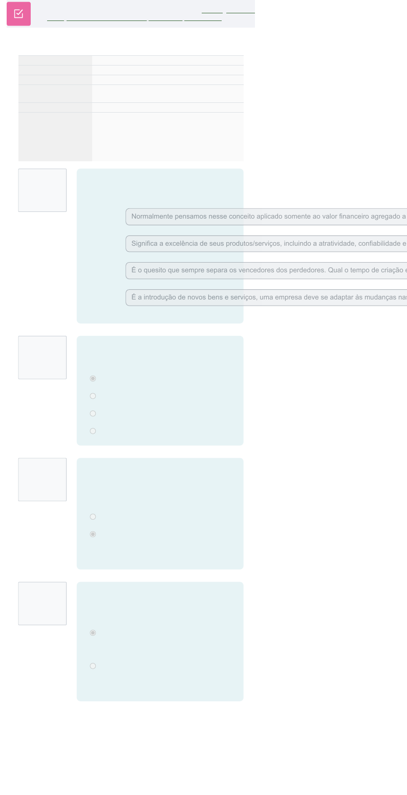 Questão 1 Correto Atingiu 1,00 de 1,00 Questão 2 Incorreto Atingiu 0,00 de 1,00 Questão 3 Incorreto Atingiu 0,00 de 1,00 Questão 4 Incorreto Atingiu 0,00 de 1,00 Outros Extensão Planejamento de carreira - Enfoque em alta performance Avaliação Iniciado em quarta-feira, 17 set. 2025, 16:29 Estado Finalizada Concluída em quarta-feira, 17 set. 2025, 17:07 Tempo empregado 37 minutos 32 segundos Avaliar 7,00 de um máximo de 10,00(70%) Comentários Parabéns, você obteve o aproveitamento necessário para a conclusão do curso. Você já pode emitir o seu Certificado de conclusão. Em relação aos elementos que dão base à vantagem competitiva das organizações, ligue as colunas Custos Qualidade Velocidade Inovação Normalmente pensamos nesse conceito aplicado somente ao valor financeiro agregado a Significa a excelência de seus produtos/serviços, incluindo a atratividade, confiabilidade e É o quesito que sempre separa os vencedores dos perdedores. Qual o tempo de criação e É a introdução de novos bens e serviços, uma empresa deve se adaptar às mudanças nas a) Em que situação pode ocorrer a interação? Escolha uma opção: a. Entre indivíduos através de uma videoconferência. b. Entre pessoas numa sala de bate-papo na Internet. c. Entre computadores numa rede pessoal. d. Somente no ambiente humano. Assinale a alternativa que identifique o conceito de carreira entendido como mobilidade ocupacional: Escolha uma opção: a. O caminho que fazemos. Uma carreira de negócios, por exemplo. b. Um caminho estruturado e organizado no tempo e no espaço e que pode ser seguido por alguém. É definição de uma escolha de carreira baseada na compatibilidade: Escolha uma opção: a. Afirma que ao longo de sua trajetória de vida vamos gradualmente chegando à escolha de nossa real ocupação. b. Dará maior ênfase a explicações sobre O QUE influencia a escolha de uma carreira e menos ênfase ao COMO se processa essa escolha ou POR QUE. 24/09/2025, 14:20 Avaliação: Revisão da tentativa | Graduação EAD https://ava.graduacaoead.unicv.edu.br/mod/quiz/review.php?attempt=6567834&cmid=104 1/3 https://ava.graduacaoead.unicv.edu.br/course/index.php?categoryid=2 https://ava.graduacaoead.unicv.edu.br/course/index.php?categoryid=4 https://ava.graduacaoead.unicv.edu.br/course/view.php?id=20#section-2 Questão 5 Correto Atingiu 1,00 de 1,00 Questão 6 Correto Atingiu 1,00 de 1,00 Questão 7 Correto Atingiu 1,00 de 1,00 Questão 8 Correto Atingiu 1,00 de 1,00 Questão 9 Correto Atingiu 1,00 de 1,00 Está relacionada a habilidades tais como motivar a si mesmo e persistir mediante frustrações; controlar impulsos, canalizando emoções para situações apropriadas; praticar gratificação prorrogada; motivar pessoas, ajudando-as a liberarem seus melhores talentos, e conseguir seu engajamento a objetivos de interesses comuns. Essa é a definição de um elemento importante no processo de escolha e manutenção de uma carreira de sucesso: Escolha uma opção: a. Inteligência verbal b. Inteligência matemática c. Inteligência emocional d. Relação humana O que são âncoras de carreiras? Escolha uma opção: a. Elementos que fundamentam e alicerçam nossas escolhas: interesses, valores, crenças, etc. b. Pessoas que nos orientam na trajetória profissional. c. Elementos externos a nossa escolha individual. Observe a sua volta e tente perceber quais oportunidades podem representar uma oportunidade estratégica na sua carreira. Que insumo do planejamento de carreira é esse? Escolha uma opção: a. Estabelecimento de objetivos b. Auto avaliação c. Plano de ação d. Identificação de oportunidades Qual o nome do princípio de gestão empresarial que tem como escopo: proibir a discriminação, o assédio e toda e qualquer outra forma de opressão exercida sobre os funcionários das empresas com base em diferenças de origem étnico-racial, deficiência, idade, orientação sexual e fé ou religião. Todas as empresas devem, pois, definir métodos de combate à discriminação exercida com base nestes fundamentos. Escolha uma opção: a. Administração clássica b. Gestão da Diversidade c. Gestão da qualidade d. Reengenharia São alguns dos elementos que fazem parte do perfil do Novo Executivo: Escolha uma opção: a. Aumento da diversificação de oportunidades. b. Baixa da busca pela flexibilidade. c. Alto nível de especialização em apenas uma competência. d. Trabalho direcionado. 24/09/2025, 14:20 Avaliação: Revisão da tentativa | Graduação EAD https://ava.graduacaoead.unicv.edu.br/mod/quiz/review.php?attempt=6567834&cmid=104 2/3 Questão 10 Correto Atingiu 1,00 de 1,00 São necessidades básicas propostas por Maslow: Escolha uma opção: a. Autoestima b. Moradia c. Alimentação d. Sucesso 24/09/2025, 14:20 Avaliação: Revisão da tentativa | Graduação EAD https://ava.graduacaoead.unicv.edu.br/mod/quiz/review.php?attempt=6567834&cmid=104 3/3