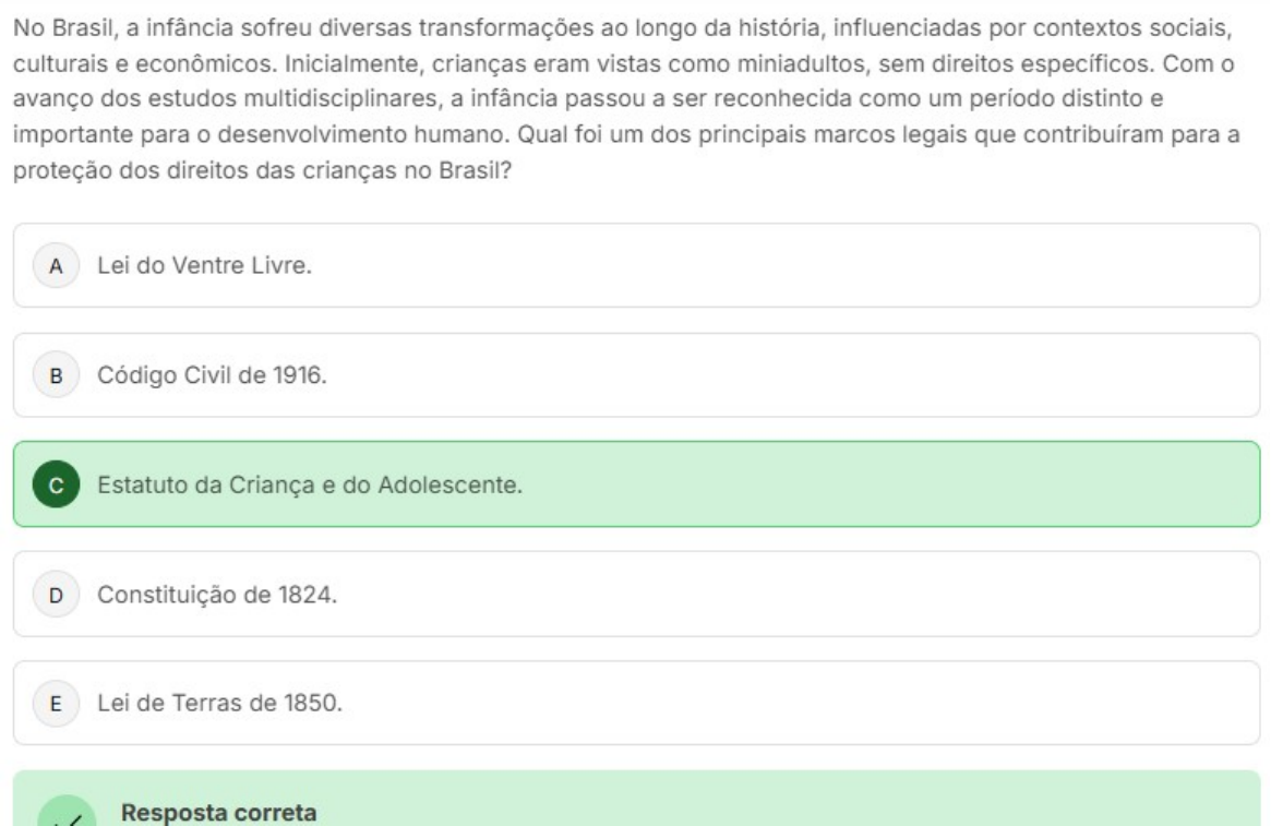 No Brasil, a infância sofreu diversas transformações ao longo da história, influenciadas por contextos sociais, culturais e econômicos. Inicialmente, crianças eram vistas como miniadultos, sem direitos específicos. Com avanço dos estudos multidisciplinares, a infância passou a ser reconhecida como um período distinto e importante, para o desenvolvimento humano. Qual foi um dos principais marcos legais que contribuíram para a proteção dos direitos das crianças no Brasil? A Lei do Ventre Livre. Código Civil de 1916. Estatuto da Criança e do Adolescente. D Constituição de 1824. E Lei de Terras de 1850. Resposta correta