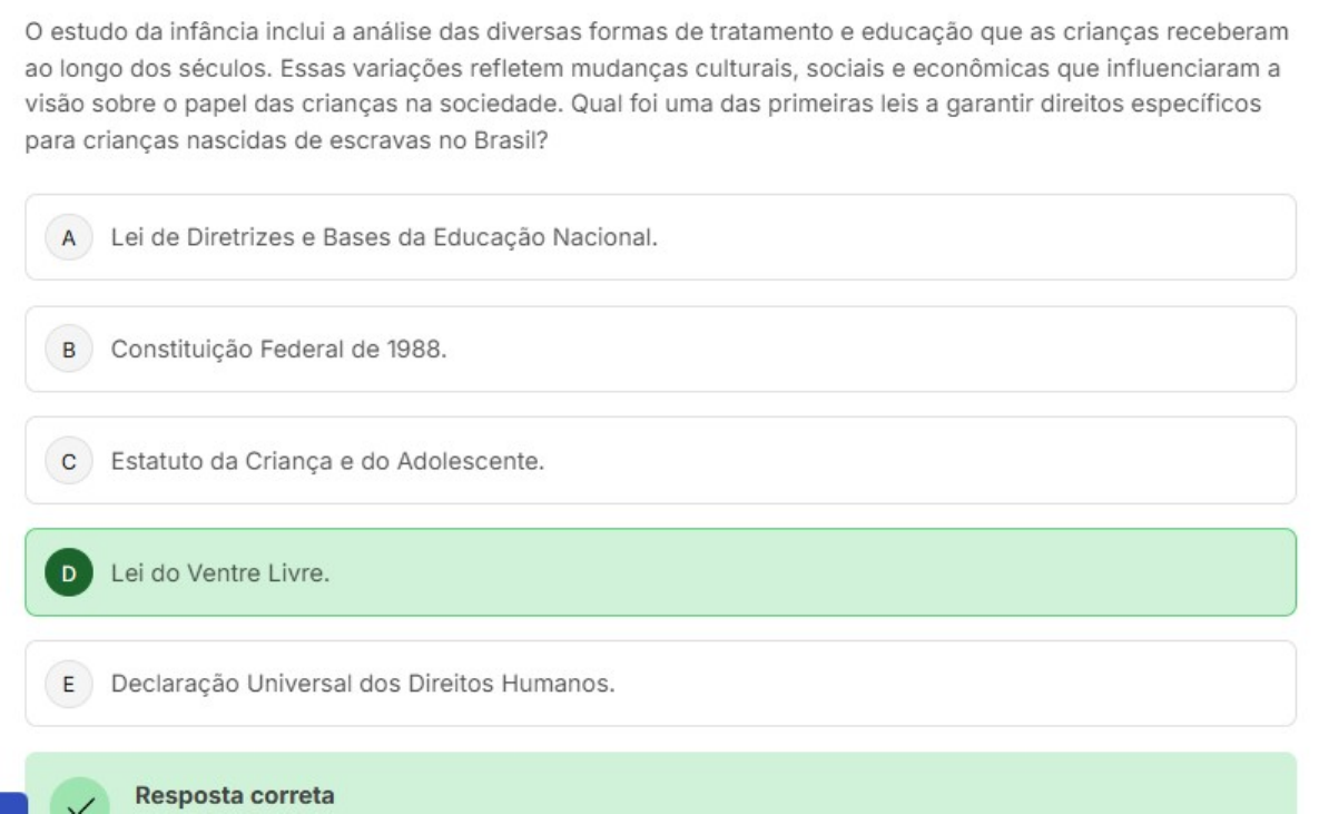 estudo da infância inclui a análise das diversas formas de tratamento e educação que as crianças receberam ao longo dos séculos. Essas variações refletem mudanças culturais, sociais e econômicas que influenciaram a visão sobre o papel das crianças na sociedade. Qual foi uma das primeiras leis a garantir direitos específicos para crianças nascidas de escravas no Brasil? A Lei de Diretrizes e Bases da Educação Nacional. Constituição Federal de 1988. C Estatuto da Criança e do Adolescente. D Lei do Ventre Livre. E Declaração Universal dos Direitos Humanos. Resposta correta