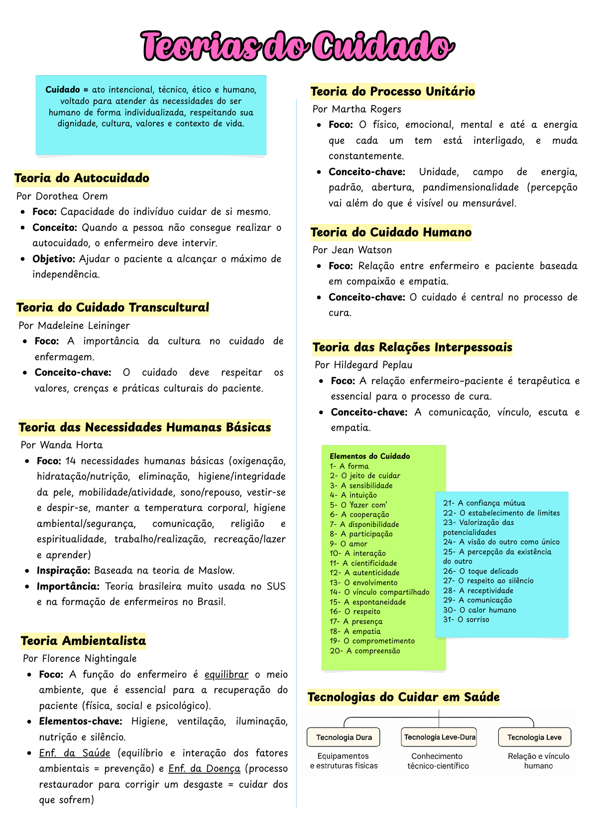 Cuidado = ato intencional, técnico, ético e humano, voltado para atender às necessidades do ser humano de forma individualizada, respeitando sua dignidade, cultura, valores e contexto de vida. Elementos do Cuidado 1- A forma 2- O jeito de cuidar 3- A sensibilidade 4- A intuição 5- O ‘fazer com’ 6- A cooperação 7- A disponibilidade 8- A participação 9- O amor 10- A interação 11- A cientificidade 12- A autenticidade 13- O envolvimento 14- O vínculo compartilhado 15- A espontaneidade 16- O respeito 17- A presença 18- A empatia 19- O comprometimento 20- A compreensão 21- A confiança mútua 22- O estabelecimento de limites 23- Valorização das potencialidades 24- A visão do outro como único 25- A percepção da existência do outro 26- O toque delicado 27- O respeito ao silêncio 28- A receptividade 29- A comunicação 30- O calor humano 31- O sorriso Teorias do CuidadoTeorias do Cuidado Teoria do Autocuidado Por Dorothea Orem Foco: Capacidade do indivíduo cuidar de si mesmo. Conceito: Quando a pessoa não consegue realizar o autocuidado, o enfermeiro deve intervir. Objetivo: Ajudar o paciente a alcançar o máximo de independência. Teoria das Necessidades Humanas Básicas Por Wanda Horta Foco: 14 necessidades humanas básicas (oxigenação, hidratação/nutrição, eliminação, higiene/integridade da pele, mobilidade/atividade, sono/repouso, vestir-se e despir-se, manter a temperatura corporal, higiene ambiental/segurança, comunicação, religião e espiritualidade, trabalho/realização, recreação/lazer e aprender) Inspiração: Baseada na teoria de Maslow. Importância: Teoria brasileira muito usada no SUS e na formação de enfermeiros no Brasil. Teoria do Cuidado Transcultural Por Madeleine Leininger Foco: A importância da cultura no cuidado de enfermagem. Conceito-chave: O cuidado deve respeitar os valores, crenças e práticas culturais do paciente. Teoria Ambientalista Por Florence Nightingale Foco: A função do enfermeiro é equilibrar o meio ambiente, que é essencial para a recuperação do paciente (física, social e psicológico). Elementos-chave: Higiene, ventilação, iluminação, nutrição e silêncio. Enf. da Saúde (equilíbrio e interação dos fatores ambientais = prevenção) e Enf. da Doença (processo restaurador para corrigir um desgaste = cuidar dos que sofrem) Teoria do Processo Unitário Por Martha Rogers Foco: O físico, emocional, mental e até a energia que cada um tem está interligado, e muda constantemente. Conceito-chave: Unidade, campo de energia, padrão, abertura, pandimensionalidade (percepção vai além do que é visível ou mensurável. Teoria do Cuidado Humano Por Jean Watson Foco: Relação entre enfermeiro e paciente baseada em compaixão e empatia. Conceito-chave: O cuidado é central no processo de cura. Tecnologias do Cuidar em Saúde Teoria das Relações Interpessoais Por Hildegard Peplau Foco: A relação enfermeiro–paciente é terapêutica e essencial para o processo de cura. Conceito-chave: A comunicação, vínculo, escuta e empatia. Tipos de conhecimento se complementam e garantem uma atuação completa, segura, ética e humanizada. A teórica Bárbara Carper (1978) foi uma das primeiras a sistematizar esses saberes. Conhecimento em EnfermagemConhecimento em Enfermagem Conhecimento Empírico (Ciência da Enfermagem) Base: Pesquisa, evidências científicas, teoria. Foco: Fatos observáveis, mensuráveis, objetivos. Exemplo: Protocolos clínicos, evidências sobre curativos. Conhecimento Estético (A Arte de Cuidar) Base: Intuição, sensibilidade, percepção subjetiva. Foco: A individualidade do paciente e o "sentir" do cuidado. Exemplo: Perceber que um paciente está triste mesmo sem ele dizer nada. Conhecimento E� tico (Moral Profissional) Base: Princípios éticos, leis, respeito à dignidade humana. Foco: O que é certo ou errado no cuidado. Exemplo: Respeitar a autonomia do paciente, mesmo que ele recuse um tratamento. Conhecimento Pessoal (Autoconhecimento e Relação com o Outro) Base: Reflexão, empatia, autoconhecimento. Foco: Relação interpessoal, autenticidade e presença do profissional. Exemplo: Reconhecer seus próprios limites emocionais e como isso afeta o cuidado. Sistematização da Assistência de Enfermagem (SAE)Sistematização da Assistência de Enfermagem (SAE) Regulamentada pela Resolução COFEN nº 358/2009. Método para planejar, executar e documentar o cuidado de enfermagem, garantindo qualidade, segurança e individualização. Etapas 1. Coleta de Dados / Histórico de Enfermagem Objetivo: Levantar informações sobre o paciente (físicas, emocionais, sociais, espirituais, etc.). Ferramentas: Entrevista, exame físico, prontuário. Métodos: Utiliza teorias como Horta (necessidades humanas básicas), Roy, Orem, etc. 2. Diagnóstico de Enfermagem Análise e interpretação dos dados coletados. Formula diagnósticos com base na NANDA-I (North American Nursing Diagnosis Association). Ex: “Padrão respiratório ineficaz relacionado à secreção brônquica evidenciado por dispneia”. 3. Planejamento de Enfermagem Definição de resultados esperados (ex: "Paciente apresentará padrão respiratório eficaz em 24h"). Escolha de intervenções de enfermagem. Pode usar taxonomias como: NOC (Nursing Outcomes Classification – resultados) NIC (Nursing Interventions Classification – intervenções) 4. Implementação Colocação em prática do plano. Realizada principalmente pela equipe de enfermagem, sob supervisão do enfermeiro. Pode envolver administração de medicamentos, higiene, curativos, orientações etc. 5. Avaliação Verifica se os objetivos foram atingidos. Se não atingidos: Reavalia-se o processo, ajusta o plano e reimplementa. E� um processo cíclico. Informações Deve ser registrada no prontuário do paciente. Pode ser manual ou eletrônica. Deve conter dados claros, objetivos, organizados e atualizados. Objetivos Garantir qualidade do cuidado. Promover seg