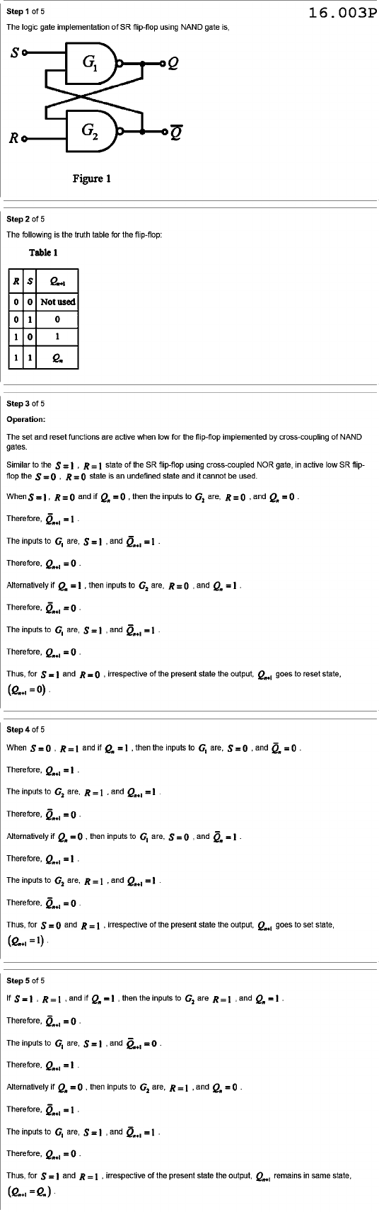 Step of 5 16.003P The logic gate implementation of SR flip-flop using NAND gate is, So G₁ Q Ro G₂ Figure 1 Step of 5 The following is the truth table for the flip-flop: Table 1 R 0 0 Not used 0 1 0 1 0 1 1 1 Step of 5 Operation: The set and reset functions are active when low for the flip-flop implemented by cross-coupling of NAND gates. Similar to the state of the SR flip-flop using cross-coupled NOR gate, in active low SR flip- flop the = R = 0 state is an undefined state and it cannot be used. When R=0 = and if = then the inputs to 2 are, R = and = Therefore, The inputs to are, and Therefore, = Alternatively if = then inputs to are, R and = Therefore, The inputs to are, and Therefore, = Thus, for S=1 = and = irrespective of the present state the output, goes to reset state, Step of 5 When = R=1 and if = then the inputs to are, = and = Therefore, =1. The inputs to are, and Therefore, Alternatively if then inputs to are, and = Therefore, The inputs to are, = and =1. Therefore, Thus, for S=0 and R=1 irrespective of the present state the output, goes to set state, Step 5 of 5 If = = and if = then the inputs to are R=1 and Therefore, = The inputs to are, and = Therefore, Alternatively if then inputs to are, and = Therefore, The inputs to are, = and =1. Therefore, Thus, for S=1 and R = irrespective of the present state the output, remains in same state,