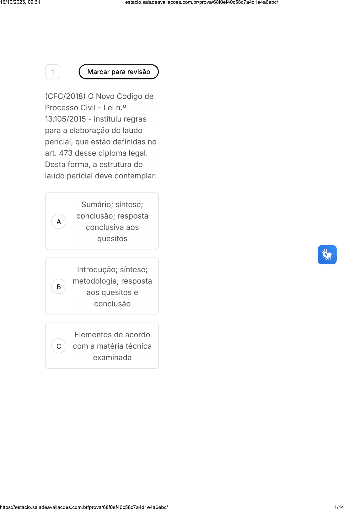 16/10/2025, 09:31 estacio.saladeavaliacoes.com.br/prova/68f0ef40c58c7a4d1e4a6ebc/ 1 Marcar para revisão (CFC/2018) Novo Código de Processo Civil - Lei 13.105/2015 - instituiu regras para a elaboração do laudo pericial, que estão definidas no art. 473 desse diploma legal. Desta forma, a estrutura do laudo pericial deve contemplar: Sumário; síntese; conclusão; resposta A conclusiva aos quesitos Introdução; síntese; metodologia; resposta aos quesitos e conclusão Elementos de acordo c com a matéria técnica examinada 1/1416/10/2025, 09:31 A exposição do objeto da perícia; a análise técnica ou científica realizada pelo perito; D indicação do método utilizado; resposta conclusiva a todos os quesitos Não tem uma E estrutura pré- determinada 2 Marcar para revisão (Instituto AOCP/2018) Informe se é verdadeiro (V) ou falso (F) que se afirma a seguir e assinale a alternativa com a sequência correta. No desempenho da função de Perito Contador, profissional deve ter zelo. termo zelo, refere-se ao cuidado que ele deve dispensar na execução de suas tarefas, em relação à sua conduta, documentos, tratamento dispensado às autoridades, de forma que seu trabalho seja levado a bom termo e, consequentemente, laudo pericial contábil e parecer técnico-contábil sejam dignos de fé pública. zelo profissional do perito na realização dos trabalhos periciais compreende: 2/1416/10/2025, 09:31 estacio.saladeavaliacoes.com.br/prova/68f0ef40c58c7a4d1e4a6ebc/ Cumprir os prazos fixados pelo juiz em perícia judicial e nos termos contratados em perícia extrajudicial, inclusive arbitral. Prestar os esclarecimentos determinados pela autoridade competente, respeitados os prazos legais ou contratuais. Ser receptivo aos argumentos e críticas, mas manter firme seu posicionamento anterior, sem ratificar ou retificar. Ser prudente, no limite dos aspectos técnico-científicos, e atento às consequências advindas dos seus atos. A V-F-F-V F-V-F-F c V-V-F-V D V-F-V-V E F-V-V-V 3 Marcar para revisão Os peritos devem seguir as regulamentações que regem a perícia contábil. Sobre isso, analise as afirmações a seguir. 3/1416/10/2025, 09:31 I. Os peritos devem consignar, no final do laudo pericial contábil ou do parecer pericial contábil, de forma clara e precisa, as suas conclusões. II. laudo e parecer devem contemplar resultado final alcançado por meio de elementos de prova inclusos nos autos ou arrecadados em diligências que perito tenha efetuado, por intermédio de peças contábeis e quaisquer outros documentos, tipos e formas. III. Quando se tratar de laudo pericial contábil, assinado em conjunto pelos peritos, há responsabilidade individual do perito principal sobre referido documento. Diante das afirmativas, assinale a opção correta. A I B c III D e III E lell 4/1416/10/2025, 09:31 4 Marcar para revisão O perito contábil tem um papel essencial na produção do laudo pericial. Sobre isso, analise as afirmações a seguir. I. Quando não for possível concluir laudo pericial contábil no prazo fixado pela autoridade competente, deve perito nomeado requerer a sua dilação antes de vencido aquele, apresentando os motivos que ensejaram a solicitação. II. perito não deve prestar esclarecimentos sobre conteúdo do laudo pericial contábil ou do parecer pericial contábil, em atendimento à determinação da autoridade competente. III. perito deve comprovar sua habilitação por intermédio de Certidão de Regularidade Profissional emitida pelos Conselhos Regionais de Contabilidade ou do Cadastro Nacional de Peritos Contábeis do CFC. perito pode anexá- las no primeiro ato de sua manifestação e na apresentação do laudo ou parecer. Diante das afirmativas, assinale a opção correta: A I B 5/1416/10/2025, 09:31 c III D e III E 5 Marcar para revisão (FUNDATEC/2019) As Normas Brasileiras de Contabilidade (NBC) definem os conceitos e normas acerca da Auditoria Contábil e da Perícia Contábil, restando claro do exame das referidas normas a distinção entre uma coisa e outra. Em relação a tais diferenças, analise as assertivas abaixo: I. A auditoria contábil é uma técnica contábil que consiste na verificação e fidedignidade dos dados contidos nas demonstrações contábeis por meio do exame minucioso dos registros da contabilidade e dos documentos que a eles deram origem. II. A perícia contábil constitui conjunto de procedimentos técnico-científicos destinados a levar à instância decisória elementos de prova necessários a subsidiar a justa solução do litígio ou constatação de fato. 6/1416/10/2025, 09:31 III. Enquanto a auditoria apresenta seu resultado expressando uma opinião por meio do relatório de auditoria, perito apresenta resultado da perícia com um laudo pericial contábil ou parecer técnico- contábil. Quais estão corretas? A I c III D lell E I, e III 6 Marcar para revisão A Norma Brasileira de Contabilidade regulamenta diversos pontos da atividade contábil. Em relação à NBC 01, analise as afirmações a seguir. I. Elaborado plano de trabalho pericial, perito não pode convidar os assistentes técnicos para uma reunião de trabalho presencial SM2 Perícia Contábil e Arbitragem T 7/1416/10/2025, 09:31 da execução do trabalho pericial. II. Ao identificar na etapa de elaboração do planejamento, 00 32 : 27 Ocultar as diligências necessárias hora min seg desde que não haja preclusão de prova documental, é necessário considerar a Questão 10 de 10 legislação aplicável, documentos, registros, livros 1 2 3 4 5 contábeis, fiscais e societários, laudos e pareceres já 6 7 8 9 10 realizados e outras informações pertinentes para Respondidas (10) Em branco (0) determinar a natureza do trabalho a ser executado. III. planejamento deve ser Finalizar prova realizado pelo perito nomeado, ainda que trabalho venha a ser realizado de forma conjunta. Diante das afirmações, assinale a alternativa correta. Apenas a afirmação A está co