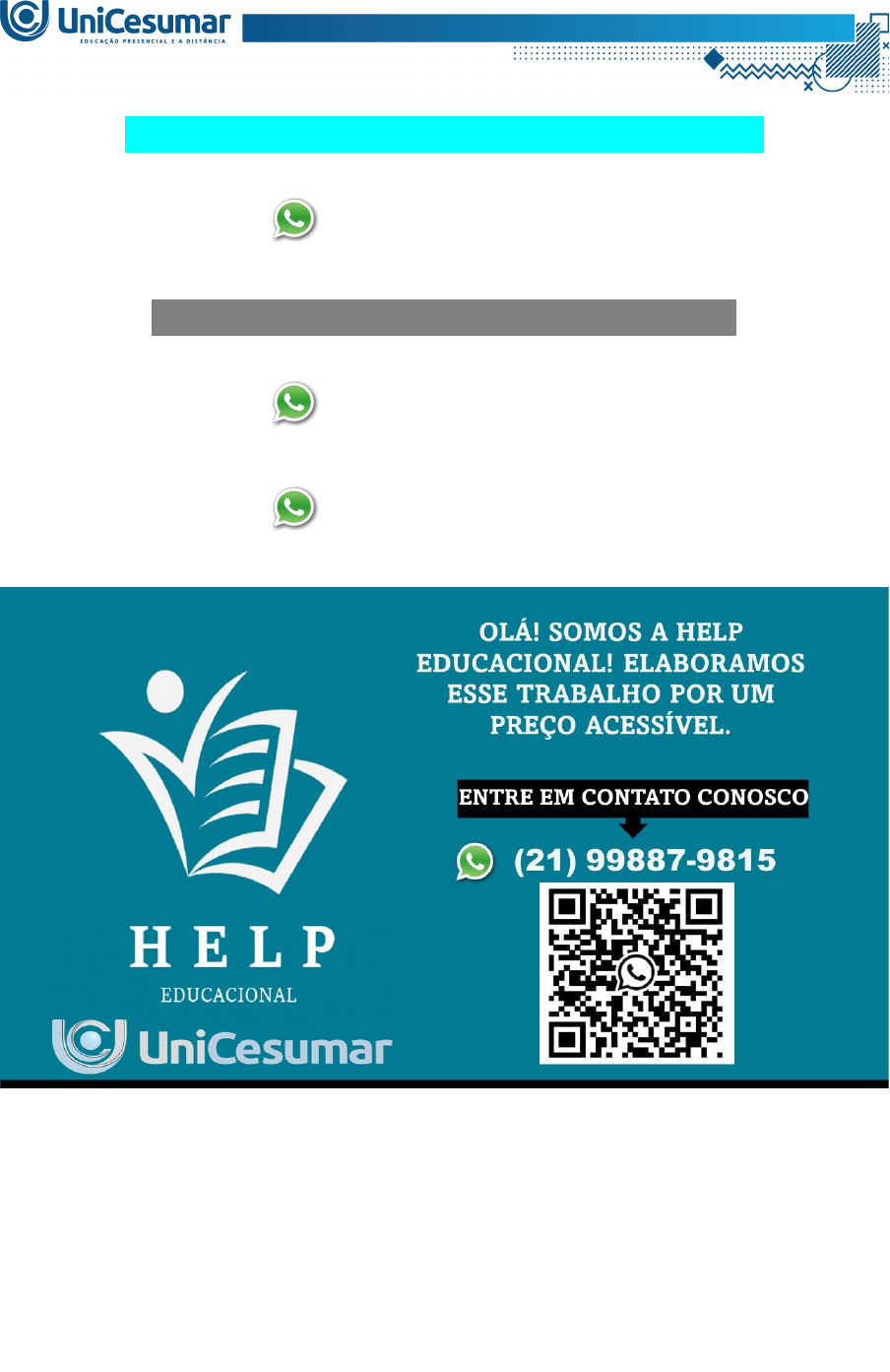 MAPA – ENF – PARASITOLOGIA - 54_2025 (21) 99887-9815 ASSESSORIA NOS SEUS TRABALHOS (21) 99887-9815 (21) 99887-9815 Olá aluno (a), seja bem-vindo a atividade MAPA (Material de Avaliação Prática de Aprendizagem) desta disciplina! CONTEXTUALIZAÇÃO: “Uma pesquisa da Universidade Federal da Paraíba (UFPB) identificou contaminação do solo com presença de parasitos em 04 praças públicas da cidade de João Pessoa (...) Os pesquisadores retiraram amostras dos solos que foram analisadas no Laboratório de Parasitologia do Departamento de Fisiologia e Patologia da UFPB, por meio da utilização de três métodos laboratoriais para investigação e identificação microscópica (Método de Hoffman, Pons e Janer; Método de Rugai, Mattos e Brisola e Método de Faust). Nas 04 praças públicas de João Pessoa foram encontrados ovos de helmintos Ancilostomídeos, (parasitos do intestino delgado, ou parasitas como mais popularmente são conhecidos) e Toxocara canis (parasitos de cães que podem infectar humanos), que representaram 57,1% e 21,4%, respectivamente, do total de amostras de solo contaminadas. Já as espécies de larvas encontradas foram o equivalente a 50% de Ancilostomídeos (causadores da ancilostomíase) e 71,4% de Strongyloides stercoralis (causador da estrongiloidíase). Os pesquisadores esclarecem que a presença de formas evolutivas parasitárias de protozoários e helmintos no solo de ambientes públicos resulta em um grave problema de saúde pública. As espécies parasitárias encontradas podem ocasionar a incidência de zoonoses que são doenças infecciosas transmitidas entre os animais e seres humanos, tais como a Estrongiloidíase, Larva migrans cutânea (Bicho geográfico) e Toxocaríase. Essas parasitoses podem ocasionar dor abdominal, náuseas, vômitos, diarreia, anemia, febre, perda de peso, cansaço, bem como coceira e lesões na pele (...). “ Fonte: https://www.ufpb.br/ufpb/contents/noticias/risco-a-saude-pesquisa-da-ufpb-identifica-presenca-de-parasitos-em-solos-de-pracas-publicas-de-joao-pessoa O QUE DEVO FAZER NESTA ATIVIDADE? Com base nessas informações, você deve elaborar um post para o instagram destacando informações importantes sobre UMA das patologias mencionadas na reportagem acima. Não é necessário fazer a postagem, somente elaborar o post. Siga os comandos abaixo para criar seu post: 1- ESCOLHA uma das patologias: Estrongiloidíase, Larva migrans cutânea (Bicho geográfico) OU Toxocaríase. 2- ESCREVA um texto com no máximo 800 caracteres destacando a importância da parasitose escolhida. 3- INSIRA, de 4 a 6 imagens. 4- INCLUA: - O nome do parasito da patologia escolhida; - As principais formas de transmissão e o ciclo biológico; - Sinais e sintomas relacionados; - Medidas de prevenção; - O que a população deve fazer caso apresentar os sintomas dessa patologia. Instruções: - Use e abuse da criatividade! - Você pode utilizar ferramentas como PowerPoint e Canva para elaborar as imagens a serem postadas no instagram. - Utilize o Formulário Padrão MAPA para realizar esta atividade. Ele se encontra na pasta "Material da Disciplina". Siga todas as instruções constantes nesse modelo. - Além do material da disciplina, você pode utilizar as referências abaixo para auxiliar na sua resposta: FEREIRA, M. U. Parasitologia Contemporânea. 2. ed. [S. l.]: Grupo GEN, 2020. NEVES, D. P. et al. Parasitologia Humana. 14. ed. [S. l.]: Atheneu, 2022. REY, L. Bases da Parasitologia Médica. 3. ed. Rio de Janeiro: Guanabara Koogan, 2009. REY, L. Parasitologia. 4. ed. [S. l.]: Grupo GEN, 2008. ZEIBIG, E. Parasitologia Clínica: uma abordagem clínico-laboratorial. 2. ed. [S. l.]: Grupo GEN, 2014. BOM TRABALHO! OLÁ! SOMOS A HELP EDUCACIONAL! ELABORAMOS ESSE TRABALHO POR UM PREÇO ACESSÍVEL. ENTRE EM CONTATO CONOSCO (21) 99887-9815 image1.png image2.png image3.png