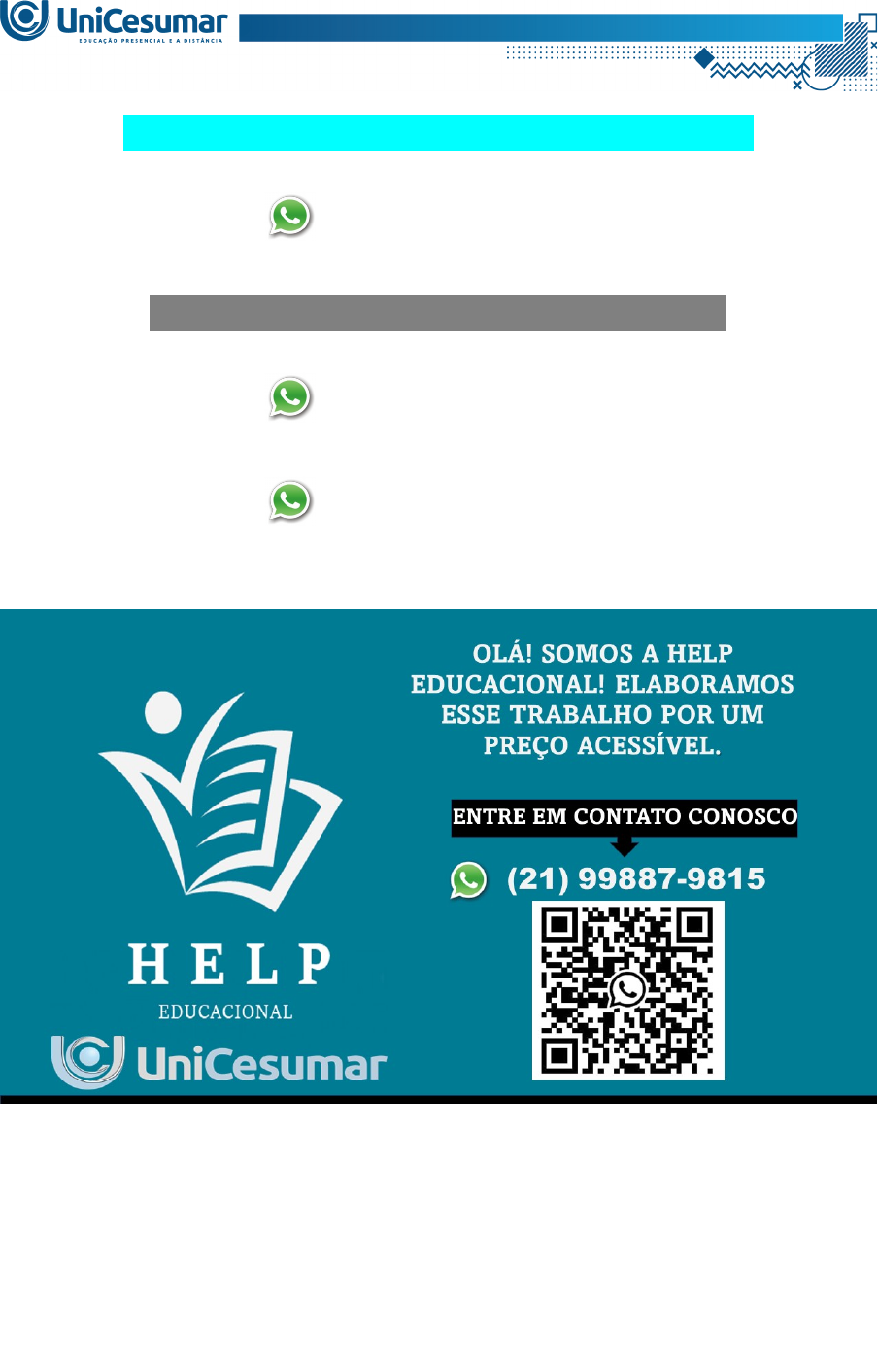 MAPA – ENF – PARASITOLOGIA - 54_2025 (21) 99887-9815 ASSESSORIA NOS SEUS TRABALHOS (21) 99887-9815 (21) 99887-9815 Olá aluno (a), seja bem-vindo a atividade MAPA (Material de Avaliação Prática de Aprendizagem) desta disciplina! CONTEXTUALIZAÇÃO: “Uma pesquisa da Universidade Federal da Paraíba (UFPB) identificou contaminação do solo com presença de parasitos em 04 praças públicas da cidade de João Pessoa (...) Os pesquisadores retiraram amostras dos solos que foram analisadas no Laboratório de Parasitologia do Departamento de Fisiologia e Patologia da UFPB, por meio da utilização de três métodos laboratoriais para investigação e identificação microscópica (Método de Hoffman, Pons e Janer; Método de Rugai, Mattos e Brisola e Método de Faust). Nas 04 praças públicas de João Pessoa foram encontrados ovos de helmintos Ancilostomídeos, (parasitos do intestino delgado, ou parasitas como mais popularmente são conhecidos) e Toxocara canis (parasitos de cães que podem infectar humanos), que representaram 57,1% e 21,4%, respectivamente, do total de amostras de solo contaminadas. Já as espécies de larvas encontradas foram o equivalente a 50% de Ancilostomídeos (causadores da ancilostomíase) e 71,4% de Strongyloides stercoralis (causador da estrongiloidíase). Os pesquisadores esclarecem que a presença de formas evolutivas parasitárias de protozoários e helmintos no solo de ambientes públicos resulta em um grave problema de saúde pública. As espécies parasitárias encontradas podem ocasionar a incidência de zoonoses que são doenças infecciosas transmitidas entre os animais e seres humanos, tais como a Estrongiloidíase, Larva migrans cutânea (Bicho geográfico) e Toxocaríase. Essas parasitoses podem ocasionar dor abdominal, náuseas, vômitos, diarreia, anemia, febre, perda de peso, cansaço, bem como coceira e lesões na pele (...). “ Fonte: https://www.ufpb.br/ufpb/contents/noticias/risco-a-saude-pesquisa-da-ufpb-identifica-presenca-de-parasitos-em-solos-de-pracas-publicas-de-joao-pessoa O QUE DEVO FAZER NESTA ATIVIDADE? Com base nessas informações, você deve elaborar um post para o instagram destacando informações importantes sobre UMA das patologias mencionadas na reportagem acima. Não é necessário fazer a postagem, somente elaborar o post. Siga os comandos abaixo para criar seu post: 1- ESCOLHA uma das patologias: Estrongiloidíase, Larva migrans cutânea (Bicho geográfico) OU Toxocaríase. 2- ESCREVA um texto com no máximo 800 caracteres destacando a importância da parasitose escolhida 3- INSIRA, de 4 a 6 imagens. 4- INCLUA: - O nome do parasito da patologia escolhida; - As principais formas de transmissão e o ciclo biológico; - Sinais e sintomas relacionados; - Medidas de prevenção; - O que a população deve fazer caso apresentar os sintomas dessa patologia. Instruções: - Use e abuse da criatividade! - Você pode utilizar ferramentas como PowerPoint e Canva para elaborar as imagens a serem postadas no instagram. - Utilize o Formulário Padrão MAPA para realizar esta atividade. Ele se encontra na pasta "Material da Disciplina". Siga todas as instruções constantes nesse modelo. - Além do material da disciplina, você pode utilizar as referências abaixo para auxiliar na sua resposta: FEREIRA, M. U. Parasitologia Contemporânea. 2. ed. [S. l.]: Grupo GEN, 2020. NEVES, D. P. et al. Parasitologia Humana. 14. ed. [S. l.]: Atheneu, 2022. REY, L. Bases da Parasitologia Médica. 3. ed. Rio de Janeiro: Guanabara Koogan, 2009. REY, L. Parasitologia. 4. ed. [S. l.]: Grupo GEN, 2008. ZEIBIG, E. Parasitologia Clínica: uma abordagem clínico-laboratorial. 2. ed. [S. l.]: Grupo GEN, 2014. BOM TRABALHO! OLÁ! SOMOS A HELP EDUCACIONAL! ELABORAMOS ESSE TRABALHO POR UM PREÇO ACESSÍVEL. ENTRE EM CONTATO CONOSCO (21) 99887-9815 image1.png image2.png image3.png