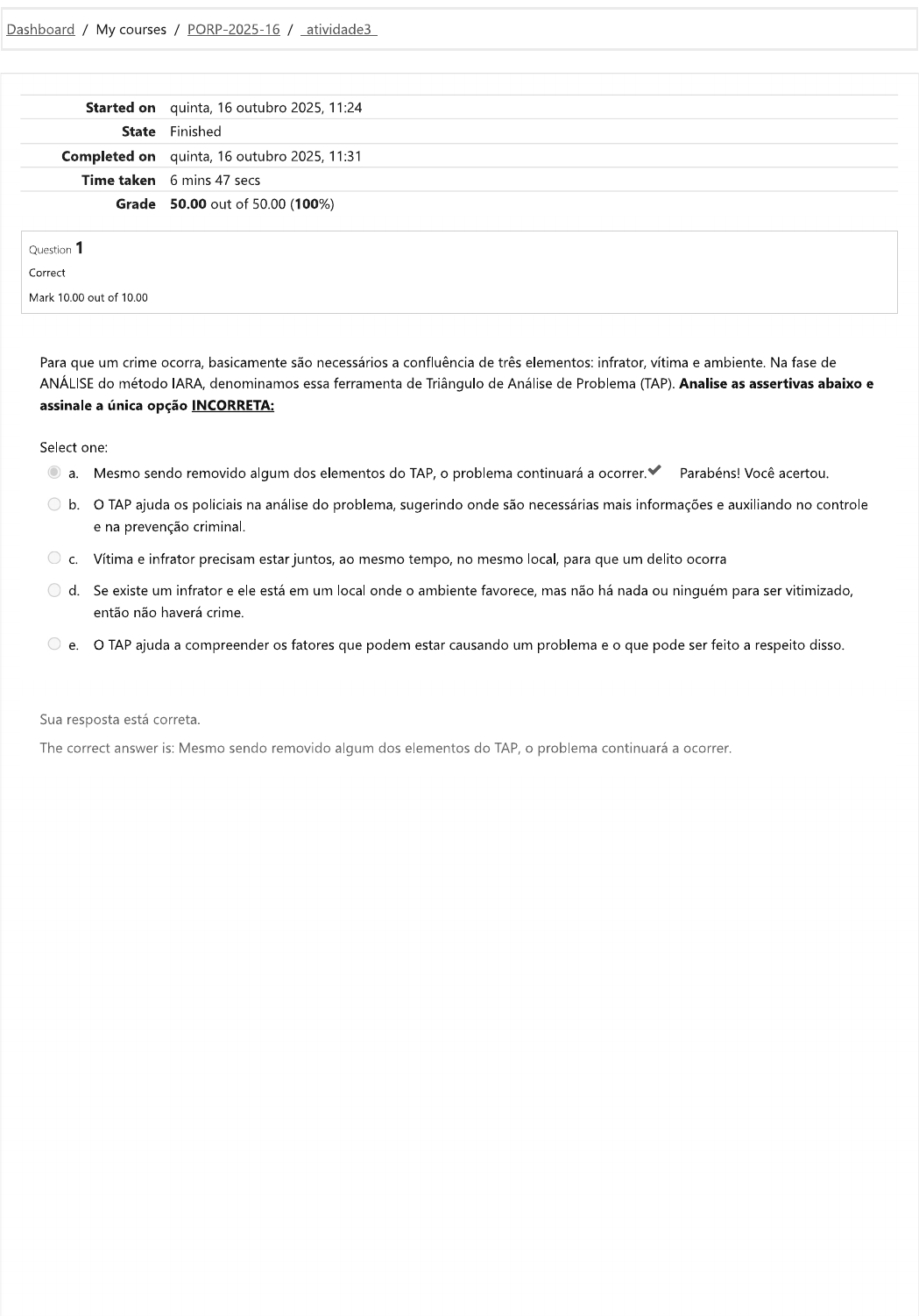 Dashboard / My courses / PORP-2025-16 / atividade3 Started on quinta, 16 outubro 2025, 11:24 State Finished Completed on quinta, 16 outubro 2025, 11:31 Time taken 6 mins 47 secs Grade 50.00 out of 50.00 (100%) Question 1 Correct Mark 10.00 out of 10.00 Para que um crime ocorra, basicamente são necessários a confluência de três elementos: infrator, vítima e ambiente. Na fase de ANÁLISE do método IARA, denominamos essa ferramenta de Triângulo de Análise de Problema (TAP). Analise as assertivas abaixo e assinale a única opção INCORRETA: Select one: a. Mesmo sendo removido algum dos elementos do o problema continuará a ocorrer. Parabéns! Você acertou. b. TAP ajuda os policiais na análise do problema, sugerindo onde são necessárias mais informações e auxiliando no controle e na prevenção criminal. C. Vítima e infrator precisam estar juntos, ao mesmo tempo, no mesmo local, para que um delito ocorra d. Se existe um infrator e ele está em um local onde o ambiente favorece, mas não há nada ou ninguém para ser vitimizado, então não haverá crime. e. TAP ajuda a compreender os fatores que podem estar causando um problema e o que pode ser feito a respeito disso. Sua resposta está correta. The correct answer is: Mesmo sendo removido algum dos elementos do o problema continuará a ocorrer.Question 2 Correct Mark 10.00 out of 10.00 Analise as assertivas abaixo sobre a fase do Método IARA AVALIAÇÃO e assinale a única opção INCORRETA: Select one: a. A avaliação é processo científico usado para determinar se um problema declinou e se a solução foi a causa do declínio. b. A precisão com que os problemas são definidos e a qualidade de sua análise permitirão estabelecer a melhor forma de medir os resultados alcançados. C. A avaliação dos resultados alcançados a partir da implantação de determinadas ações está vinculada à necessidade de se ampliar a efetividade do trabalho policial. d. A avaliação permite que a polícia aprenda sobre as estratégias desenvolvidas e que são efetivas para lidar com determinados problemas. e. A avaliação impede que a sociedade acompanhe o desempenho da polícia e o emprego dos Parabéns! Você recursos públicos. acertou. Sua resposta está correta. The correct answer is: A avaliação impede que a sociedade acompanhe o desempenho da polícia e emprego dos recursos públicos. Question 3 Correct Mark 10.00 out of 10.00 "Este é indicador mais comum e demonstra como as pessoas atuam. Consomem álcool? Usam drogas ilícitas? Ocorre a venda de drogas? As pichações são constantes? Como praticam o delito?" Analise as questões abaixo e assinale a opção que melhor corresponde com a característica de similitude apresentada: Select one: a. Tempo. b. Evento. C. Pessoas. d. Localização. e. Tipo de infração. Parabéns! Você acertou. Sua resposta está correta. The correct answer is: Tipo de infração.Question 4 Correct Mark 10.00 out of 10.00 Analise as assertivas abaixo sobre a fase do Método IARA AVALIAÇÃO e assinale a única opção INCORRETA: Select one: a. O emprego de termos ambíguos ou genéricos para definir um problema, dificultará a determinação do desempenho esperado do grupo envolvido com sua resolução. b. Número de prisões, apreensões e crimes reportados são alguns dos indicadores de desempenho tradicionais. C. processo de avaliação não se mistura com as demais etapas do método IARA, devendo acontecer Parabéns! apenas na fase antes de retornar para as readequações da Etapa. Você acertou. d. Essa fase pode ser dividida em dois tipos: avaliação de processo, que acompanha e tenta garantir a integridade da resposta, e a avaliação de impacto, que busca verificar a efetividade das respostas aplicados ao problema. e. Quando os resultados alcançados diferirem com os indicadores propostos caberão ações corretivas, que servirão de parâmetro para identificação de falhas, correção de ações ou redimensionamento dos indicadores de avaliação. Sua resposta está correta. The correct answer is: processo de avaliação não se mistura com as demais etapas do método IARA, devendo acontecer apenas na fase antes de retornar para as readequações da Etapa. Question 5 Correct Mark 10.00 out of 10.00 "Problemas ocorrem em Zonas Quentes de Criminalidade (Hot spot), tais como centro da cidade, parques onde gangues cometem crimes, complexos residenciais infestados por assaltantes, etc. Ou seja, um grupo de incidentes que acontecem em um mesmo local." Analise as questões abaixo e assinale a opção que melhor corresponde com a característica de similitude apresentada: Select one: a. Pessoas. b. Tempo. C. Tipo de infração. d. Localização. Parabéns! Você acertou. e. Evento. Sua resposta está correta. The correct answer is: Localização.