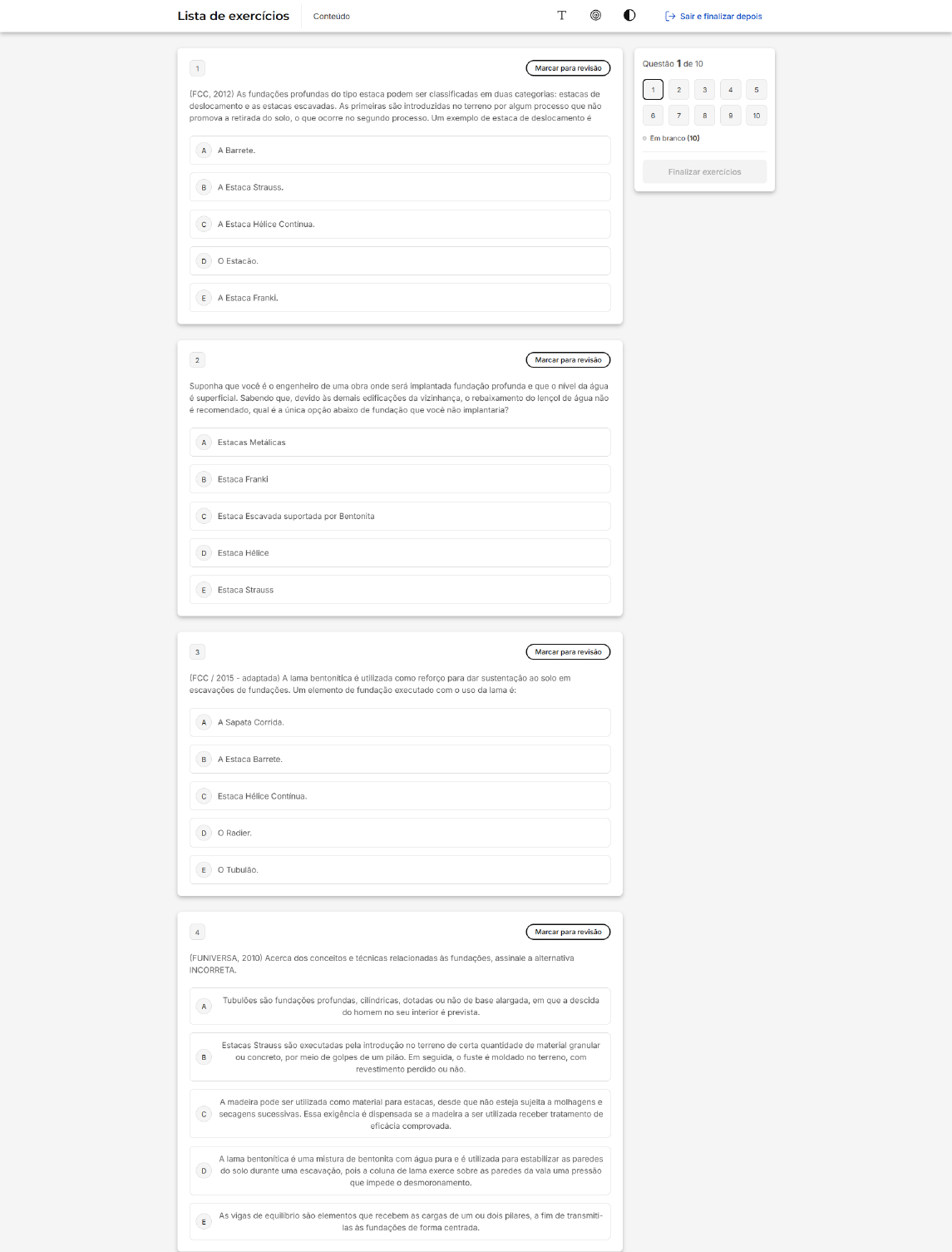 Lista de exercícios Conteúdo T Sair e finalizar depois Questão de 10 1 Marcar para revisão 1 2 3 4 5 (FCC, 2012) As fundações profundas do tipo estaca podem ser classificadas em duas categorias: estacas de deslocamento e as estacas escavadas. As primeiras são introduzidas no terreno por algum processo que não promova a retirada do solo, que ocorre no segundo processo. Um exemplo de estaca de deslocamento é 6 7 8 9 10 Em branco (10) A A Barrete. Finalizar exercícios A Estaca Strauss. A Estaca Hélice Contínua. D Estação. E A Estaca Franki. 2 Marcar para revisão Suponha que você é engenheiro de uma obra onde será implantada fundação profunda e que nível da água é superficial. Sabendo que, devido às demais edificações da vizinhança, rebaixamento do lençol de água não é recomendado, qual é a única opção abaixo de fundação que você não implantaria? A Estacas Metálicas Estaca Franki Estaca Escavada suportada por Bentonita D Estaca Hélice E Estaca Strauss 3 Marcar para revisão (FCC / 2015 adaptada) A lama bentonítica é utilizada como reforço para dar sustentação ao solo em escavações de fundações. Um elemento de fundação executado com uso da lama é: A A Sapata Corrida. A Estaca Barrete. Estaca Hélice Contínua. D Radier. E Tubulão. 4 Marcar para revisão (FUNIVERSA, 2010) Acerca dos conceitos e técnicas relacionadas às fundações, assinale a alternativa INCORRETA. Tubulões são fundações profundas, cilíndricas, dotadas ou não de base alargada, em que a descida A do homem no seu interior é prevista. Estacas Strauss são executadas pela introdução no terreno de certa quantidade de material granular ou concreto, por meio de golpes de um pilão. Em seguida, fuste é moldado no terreno, com revestimento perdido ou não. A madeira pode ser utilizada como material para estacas, desde que não esteja sujeita a molhagens e secagens sucessivas. Essa exigência é dispensada se a madeira a ser utilizada receber tratamento de eficácia comprovada. A lama bentonítica é uma mistura de bentonita com água pura e é utilizada para estabilizar as paredes D do solo durante uma escavação, pois a coluna de lama exerce sobre as paredes da vala uma pressão que impede As vigas de equilíbrio são elementos que recebem as cargas de um ou dois pilares, a fim de transmiti- E las às fundações de forma centrada.5 Marcar para revisão (IESES, 2015) As fundações profundas caracterizam-se por transferir carregamento da edificação para regiões profundas do terreno utilizando para isto estacas pré-moldadas ou moldadas in loco. Assinale a única alternativa INCORRETA associada às estacas pré-moldadas de concreto. A Despreza-se para seu dimensionamento atrito lateral ao longo de seu fuste. método de cravação mais empregado é o da percussão. C Podem ser construídas de concreto armado ou protendido. D A estaca pode ser emendada para atingir regiões mais profundas. E Possui grande resistência de ponta. 6 Marcar para revisão (CETRO / 2014) Na área de projetos e execução de fundações na construção civil, é correto afirmar que equipamento utilizado na cravação de estacas, em torre ou tripé, mecânico de vibração ou de gravidade, é denominado: A Bate-Estaca. Bloco de Coroamento. Estaca de Teste. D Nega da Estaca. E Recalque. 7 Marcar para revisão (FCC / 2007 - adaptada) Com relação às vantagens dos tubulões sobre outros tipos de fundações, é INCORRETO afirmar que: Os tubulões podem ser executados, sem nenhum cuidado especial, em terrenos com níveis de água A superficiais. As vibrações e ruídos produzidos são de muito baixa intensidade. C Os custos de mobilização e desmobilização são menores que bate estaca e outros equipamentos. Os engenheiros de fundações podem observar e classificar solo retirado durante a escavação e D compará-lo com as condições previstas no projeto. Em geral, é possível apoiar cada pilar em um único fuste, eliminando a necessidade de uso de E grandes blocos. 8 Marcar para revisão Considere seguintes procedimentos executivos de projeto de fundações em estacas de um edifício: é uma estaca moldada in loco, em que a perfuração é revestida integralmente, em solo, por meio de segmentos de tubos rotativos à medida que a perfuração é executada. revestimento é recuperado. A estaca é armada em todo seu comprimento e a perfuração é preenchida por argamassa. Esse descritivo se refere às características da estaca: A Franki. Hélice. Raiz. D Strauss. E Escavadas. 9 Marcar para revisão(Guimarães / 2018 adaptada) Trata-se da execução de elementos estruturais de fundação em concreto armado, na qual a perfuração ocorre com auxílio de um trado e a moldagem ocorre in loco. A Estaca Broca. B Estaca Raiz. C Estaca Strauss. D Estaca Escavada. E Estaca Franki. 10 Marcar para revisão (Guimarães, 2018 adaptada) Fundação que é utilizada quando existe água e exige-se grandes profundidades, além do perigo de desmoronamento das paredes. A Tubulão a ar comprimido. B Estaca Strauss. C Estaca Broca. D Estaca de Madeira. E Tubulão a céu aberto.