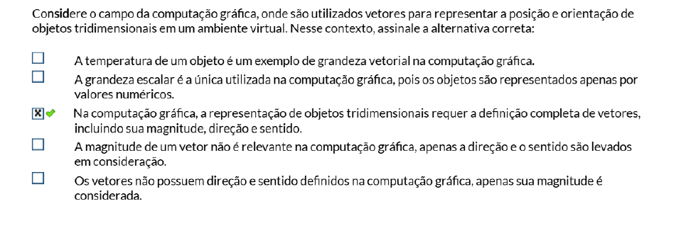Considere o campo da computação gráfica, onde são utilizados vetores para representar a posição e orientação de objetos tridimensionais em um ambiente virtual. Nesse contexto, assinale a alternativa correta: A temperatura de um objeto é um exemplo de grandeza vetorial na computação gráfica. A grandeza escalar é a única utilizada na computação gráfica, pois os objetos são representados apenas por valores numéricos. Na computação gráfica, a representação de objetos tridimensionais requer a definição completa de vetores, incluindo sua magnitude, direção e sentido. A magnitude de um vetor não é relevante na computação gráfica, apenas a direção e o sentido são levados em consideração. Os vetores não possuem direção e sentido definidos na computação gráfica, apenas sua magnitude é considerada.