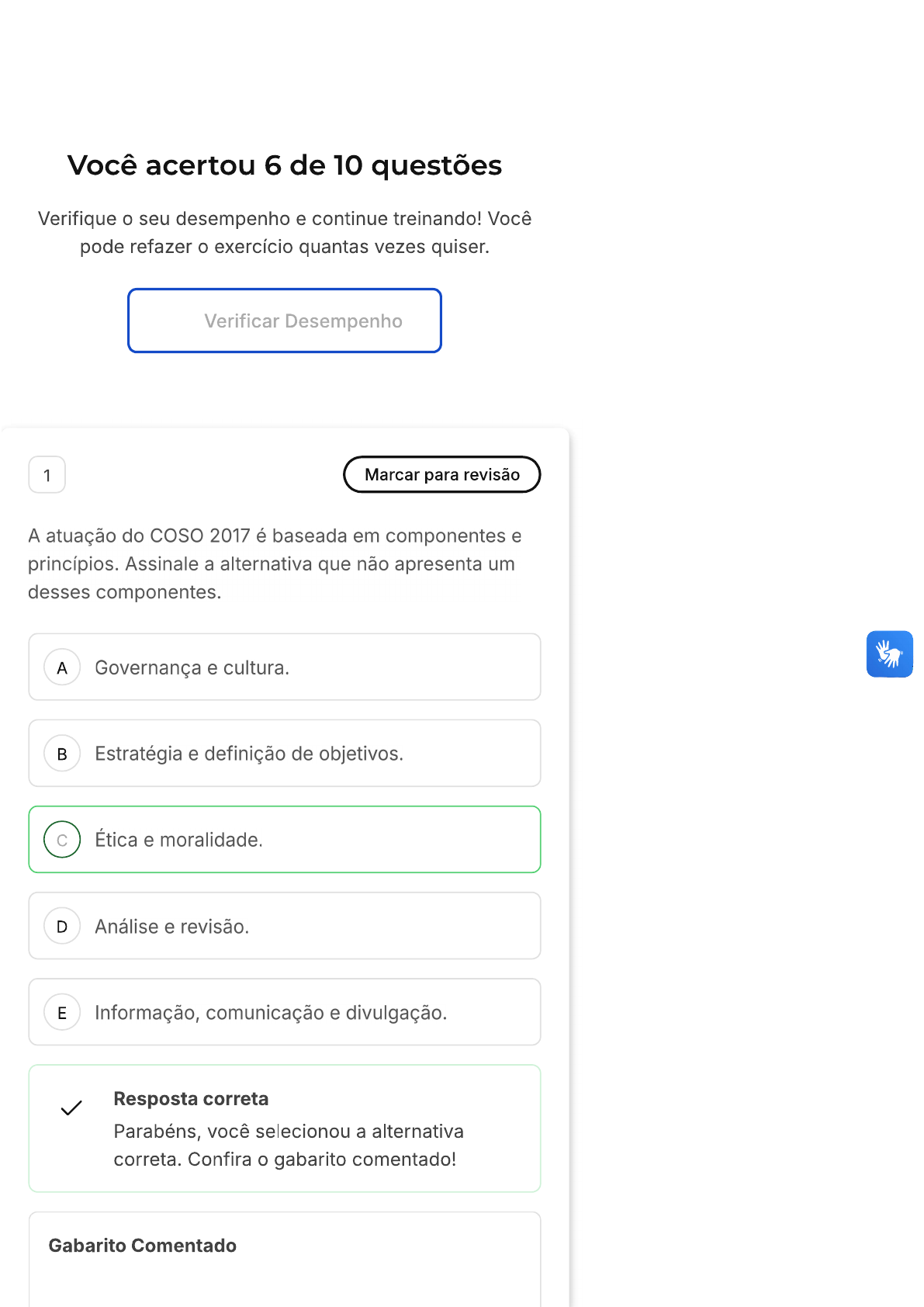 Você acertou 6 de 10 questões Verifique o seu desempenho e continue treinando! Você pode refazer exercício quantas vezes quiser. Verificar Desempenho 1 Marcar para revisão A atuação do 2017 é baseada em componentes e princípios. Assinale a alternativa que não apresenta um desses componentes. A Governança e cultura. Estratégia e definição de objetivos. c Ética e moralidade. D Análise e revisão. E Informação, comunicação e divulgação. Resposta correta Parabéns, você selecionou a alternativa correta. Confira gabarito comentado! Gabarito Comentado2017 é baseado em cinco componentes: ambiente de controle, avaliação de riscos, atividades de controle, informação e comunicação e monitoramento. Ética e moralidade não são componentes do 2017. 2 Marcar para revisão Complete texto a seguir: "os objetivos organizacionais do 2013 são controlados e monitorados por avaliação de riscos, informação e comunicação e em todos os níveis hierárquicos da organização". Gestor, indicadores de governança, atividades A críticas. Balanço patrimonial, relatório financeiro, metas. c Presidente, auditores, supervisores. Ambiente de controle, atividade de controle, D atividade de monitoramento. Plano de auditoria de conformidade, itens de E segurança, indicadores. Resposta correta Parabéns, você selecionou a alternativa correta. Confira gabarito comentado! Gabarito Comentado A resposta correta é: Ambiente de controle, atividade de controle, atividade de monitoramento. 2013 é um modelo de governança corporativa que define cinco componentes para o gerenciamento de riscos: ambiente de controle,avaliação de riscos, atividade de controle, informação e comunicação e atividade de monitoramento. ambiente de controle é conjunto de políticas e procedimentos que criam uma estrutura para a gestão de riscos. A avaliação de riscos é processo de identificar, analisar e avaliar os riscos que afetam a organização. A atividade de controle é conjunto de políticas e procedimentos que são implementados para mitigar os riscos identificados. A informação e comunicação é processo de coleta, distribuição e uso de informações para apoiar a gestão de riscos. A atividade de monitoramento é processo de revisão e avaliação contínua da eficácia do gerenciamento de riscos. 2013 é um modelo abrangente que pode ser usado por organizações de todos os tamanhos e setores. Ele fornece uma estrutura para a gestão de riscos que pode ajudar as organizações a identificar, analisar e mitigar os riscos que afetam suas operações. 3 Marcar para revisão Qual foi um dos grandes diferenciais do 2017 em relação ao 2004? A Integração com a estratégia. Foco nas operações de auditoria. Auditoria com base nos mecanismos de c governança.Eficácia na implementação de gestores por D competências. E Economicidade na alocação de recursos. Resposta correta Parabéns, você selecionou a alternativa correta. Confira gabarito comentado! Gabarito Comentado diferencial marcante do 2017 em relação ao 2004 é a "Integração com a Isso significa que 2017 enfatiza a importância de alinhar os objetivos de controle interno com a estratégia da organização. Essa abordagem permite que a organização gerencie melhor os riscos e alcance seus objetivos de maneira mais eficaz. Portanto, a alternativa correta é a "Integração com a 4 Marcar para revisão De acordo com IIA, modelo de três linhas ajuda as organizações a identificar estruturas e processos que auxiliam da melhor forma no atingimento dos objetivos e facilitam uma forte governança e gerenciamento de riscos. Nesse contexto, aponte a alternativa correta quanto aos papéis da linha. A Gerenciamento de riscos. Auditoria independente. c Monitoramento da alta administração.D Definição de riscos de uma auditoria. E Definição de mecanismos de governança. Resposta correta Parabéns, você selecionou a alternativa correta. Confira gabarito comentado! Gabarito Comentado gerenciamento de riscos é um dos papéis da linha, pois é responsável por identificar, avaliar e tratar os riscos que podem afetar a organização. 5 Marcar para revisão De acordo com a norma NBC 330(R1) do Conselho Federal de Contabilidade, procedimento substantivo é procedimento de auditoria planejado para detectar distorções relevantes no nível de afirmações. Assinale a alternativa que não indica um tipo válido de procedimento substantivo. A Planificação Inspeção c Observação D Recálculo E Nenhuma das alternativasX Resposta incorreta A alternativa correta é a letra Confira gabarito comentado! Gabarito Comentado De acordo com a norma NBC TA 330(R1) do Conselho Federal de Contabilidade, os procedimentos substantivos são aqueles planejados para detectar distorções relevantes no nível de afirmações. Entre as opções apresentadas, a "Planificação" não é considerada um procedimento substantivo válido. Os procedimentos substantivos geralmente incluem inspeção, observação e recálculo, mas não a planificação, que é mais um aspecto do planejamento da auditoria do que um procedimento substantivo em si. 6 Marcar para revisão gerenciamento de riscos corporativos pode trazer benefícios para a organização. Indique a alternativa incorreta em relação ao benefício decorrente de sua implementação. Ampliação do leque de oportunidades em função de identificação e priorização de riscos A positivos. Visão sistêmica do gerenciamento de riscos, que coopera para a melhoria do desempenho. Incremento de resultados positivos a partir de identificação e tratamento de riscos negativos. Desempenho organizacional previsível, sem sobressaltos na produtividade e na qualidade de produtos e serviços.Maior eficiência e eficácia das áreas de D auditoria. E Nenhuma das alternativas X Resposta incorreta A alternativa correta é a letra D. Confira gabarito comentado! Gabarito Comentado A alternativa D é a incorreta. gerenc