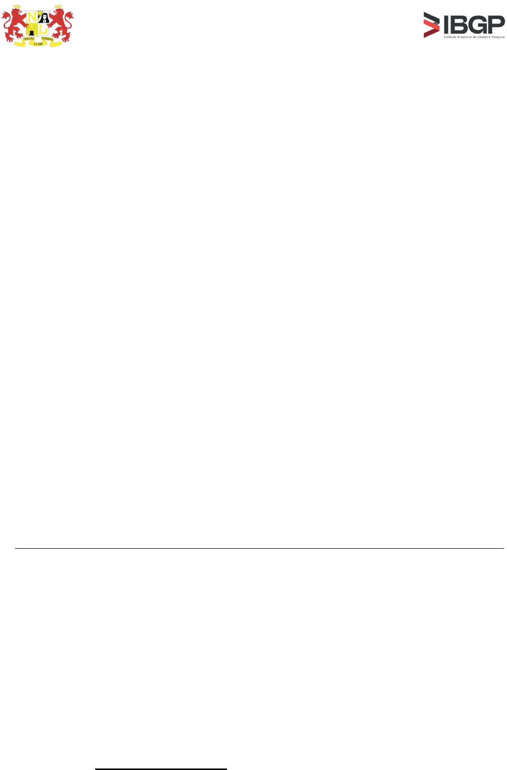 CONCURSO PÚBLICO DA GUARDA CIVIL MUNICIPAL DE NOVA LIMA/MG - EDITAL Nº 01/2024 Página 1 de 57 CONCURSO PÚBLICO PARA PROVIMENTO DE CARGO PÚBLICO EFETIVO DE GUARDA CIVIL MUNICIPAL (MASCULINO E FEMININO) DO QUADRO GERAL DE PESSOAL DO MUNICÍPIO NOVA LIMA/MG EDITAL Nº 01/2024 O Município de Nova Lima/MG e o Instituto Brasileiro de Gestão e Pesquisa (IBGP) tornam público e estabelecem normas para a realização de Concurso Público, destinado a selecionar candidatos para o provimento de cargos e cadastro de reserva para Quadro Permanente de Pessoal para a Guarda Civil Municipal de Nova Lima/MG, criada pela Lei Municipal nº 3.088, de 22 de dezembro de 2023, que “Institui o Estatuto da Guarda Civil Municipal de Nova Lima e dá outras providências.”, que reger-se-ão pelas disposições contidas na Constituição da República Federativa do Brasil; na Lei Federal nº 13.022, de 08 de agosto de 2014, que “Dispõe sobre o Estatuto Geral das Guardas Municipais.”; no Decreto Federal nº 11.841, de 21 de dezembro de 2023, que “Regulamenta os incisos IV, XIII e XIV do caput e o parágrafo único do art. 5º da Lei nº 13.022, de 8 de agosto de 2014, para dispor sobre a cooperação das guardas municipais com os órgãos de segurança pública da União, dos Estados e do Distrito Federal.”; na Lei Orgânica do Município de Nova Lima, de 17 de março de 1990, e alterações posteriores; na Lei Municipal nº 1.765, de 27 de agosto de 2003, que “Dispõe sobre percentual mínimo de vagas destinadas aos portadores de limitações física, mental, auditiva, visual ou múltipla, em concurso público para investidura em cargo ou emprego público, nos termos do inciso VIII do artigo 37 da Constituição da República e dá outras providências.”; na Lei Municipal nº 1.768, de 09 de setembro de 2003, que “Dispõe sobre a devolução de taxa de inscrição em concurso público não realizado.”; na Lei Municipal nº 2.912, de 21 de junho de 2022, que “Dispõe sobre a isenção de taxa de inscrição em concursos públicos municipais aos candidatos doadores de sangue e medula óssea.”; na Lei Municipal nº 3.087, de 22 de dezembro de 2023, que “Institui o Plano de Cargos, Carreiras e Remunerações dos Servidores Públicos da Guarda Civil Municipal de Nova Lima e dá outras providências.”; no Decreto Municipal nº 13.942, de 15 de janeiro de 2024, que “Regulamenta o Curso de Formação previsto nas leis municipais nº 3.087 e nº 3.088, ambas de 22 de dezembro de 2023.”; e na Lei Municipal nº 3.113, de 01 de abril de 2024, que “Dispõe sobre a reserva à população negra de vagas oferecidas em concursos públicos no Município de Nova Lima e dá outras providências.”; e disposições constitucionais referentes ao assunto, legislação complementar e de acordo com a distribuição de vagas especificadas na Tabela I deste Edital, sob a supervisão da Comissão do Concurso Público, instituída pela Portaria Municipal no 1.790, de 25 de janeiro de 2023. 1. DAS DISPOSIÇÕES PRELIMINARES 1.1. A Guarda Civil Municipal de Nova Lima/MG, conforme preconiza o art. 1 da Lei Complementar nº 3.088/2023, é um órgão integrante da Administração Direta do Poder Executivo do Município de Nova Lima, organizada com base na hierarquia e na disciplina, sob a autoridade suprema do Prefeito, com a finalidade de garantir segurança aos órgãos, entidades, agentes, usuários, serviços e ao patrimônio municipal. 1.2. O Concurso Público será regido por este Edital, respectivos anexos e eventuais retificações. 1.3. O Concurso Público será realizado pelo Instituto Brasileiro de Gestão e Pesquisa (IBGP), em todas as respectivas etapas, visando-se o preenchimento das vagas dispostas na Tabela I deste Edital, durante o prazo de validade, estabelecido no item 1.7. deste Edital. 1.4. A Comissão do Concurso Público, instituída pela Portaria Municipal no 1.790, de 25 de janeiro de 2023, e alterações posteriores, publicada no endereço eletrônico da Prefeitura Municipal de Nova Lima www.novalima.mg.gov.br, acompanhará toda a execução do certame. CONCURSO PÚBLICO DA GUARDA CIVIL MUNICIPAL DE NOVA LIMA/MG - EDITAL Nº 01/2024 Página 2 de 57 1.5. O certame de que trata este Edital constará das seguintes etapas: ETAPAS TIPO DE AVALIAÇÃO CRITÉRIO DE AVALIAÇÃO OBSERVAÇÃO RESPONSÁVEL PELA REALIZAÇÃO FASE I 1ª ETAPA PROVA OBJETIVA ELIMINATÓRIO E CLASSIFICATÓRIO 40 QUESTÕES, COM APROVEITAMENTO MÍNIMO DE 50%. INSTITUTO BRASILEIRO DE GESTÃO E PESQUISA (IBGP) 2ª ETAPA PROVA DISCURSIVA (REDAÇÃO) ELIMINATÓRIO E CLASSIFICATÓRIO SERÃO CORRIGIDAS AS REDAÇÕES DOS APROVADOS NAS PROVAS OBJETIVAS LIMITANDO-SE A 10 VEZES O NÚMERO DE VAGAS, COM APROVEITAMENTO MÍNIMO DE 50%. 3ª ETAPA PROVA DE CAPACIDADE FÍSICA E AVALIAÇÃO DE ALTURA ELIMINATÓRIO 05 VEZES O Nº DE VAGAS DOS CLASSIFICADOS NA 2ª ETAPA. OBRIGATORIEDADE DE ATESTADO MÉDICO E AQUECIMENTO FÍSICO DE RESPONSABILIDADE DO CANDIDATO. 4ª ETAPA AVALIAÇÃO PSICOLÓGICA ELIMINATÓRIO 04 VEZES O Nº DE VAGAS DOS APTOS NA 3ª ETAPA (PROVA DE CAPACIDADE FÍSICA). REALIZAÇÃO INDIVIDUAL E/OU INDIVIDUAL E COLETIVA. 5ª ETAPA AVALIAÇÃO DE COTA RACIAL ELIMINATÓRIO TODOS OS CANDIDATOS APTOS NA 4ª ETAPA. AVALIAÇÃO POR COMISSÃO CONSTITUÍDA POR 3 MEMBROS. 6ª ETAPA AVALIAÇÃO MÉDICA ELIMINATÓRIO TODOS OS CANDIDATOS APTOS NA 4ª ETAPA. APRESENTAÇÃO DE EXAMES ESTABELECIDOS NO EDITAL. 7ª ETAPA SINDICÂNCIA SOCIAL ELIMINATÓRIO TODOS OS CANDIDATOS APTOS NA 6ª ETAPA. APRESENTAÇÃO DOS DOCUMENTOS/CERTIDÕES ESTABELECIDOS EM EDITAL. COMISSÃO DE PROFISSIONAIS CONSTITUÍDOS EM PORTARIA PRÉVIA. FASE II 8ª ETAPA CURSO DE FORMAÇÃO ELIMINATÓRIO OS 100 PRIMEIROS CANDIDATOS CLASSIFICADOS NA 7ª ETAPA INSTITUTO BRASILEIRO DE GESTÃO E PESQUISA (IBGP) 1.6. A legislação e as alterações em dispositivos legais e normativos, com entrada em vigor após a data de publicação deste Edital, não serão objeto de avali