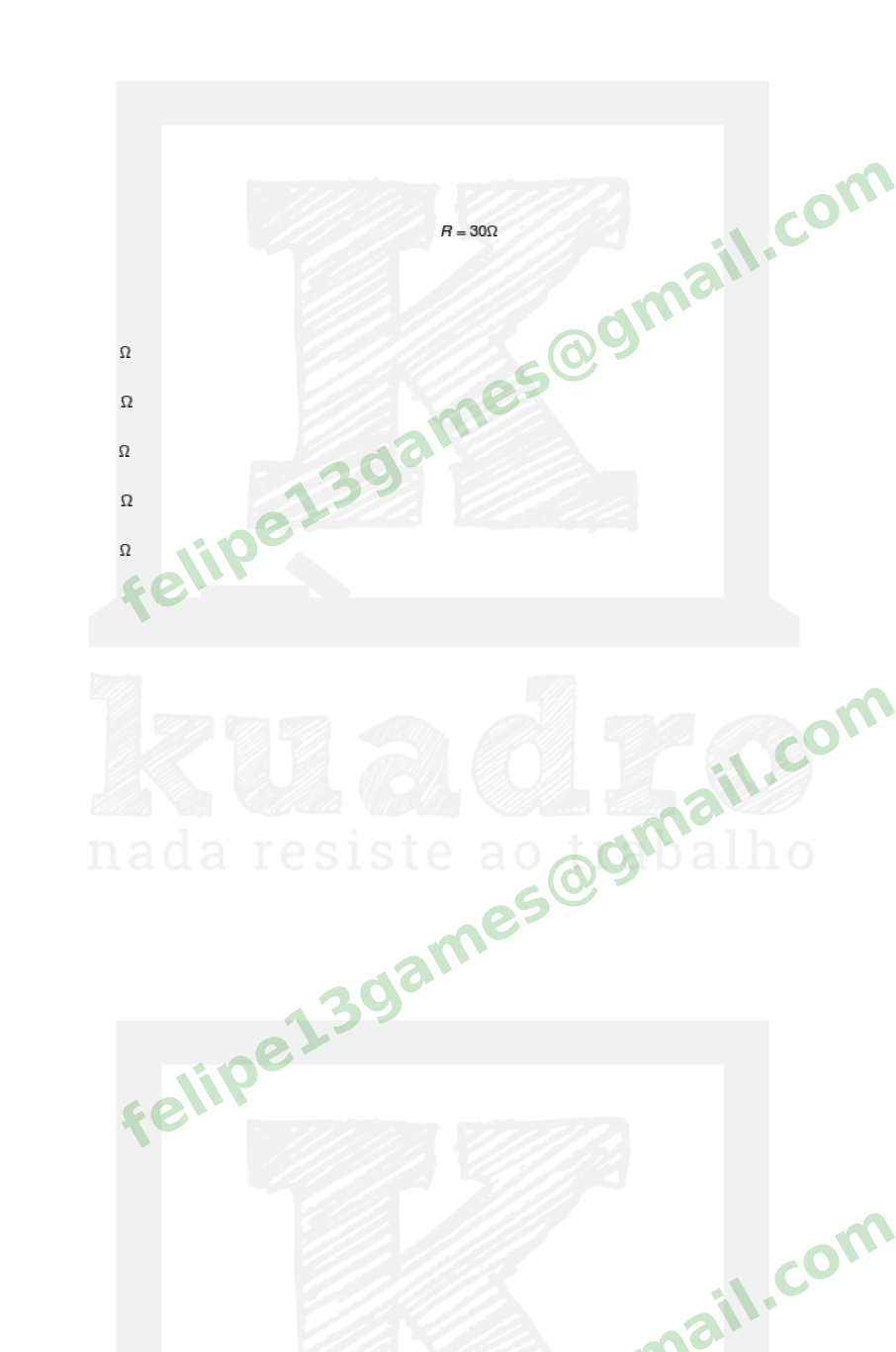18 - Reforço FIS1A2-1 - Associação de resistores e Ponte de Wheatstone Questão 1 (PUC - RJ-2008) Três resistores idênticos de estão l igados em paralelo com uma bateria de 12 V. Pode-se afirmar que a resistência equivalente do circuito é de a) Req = 10 , e a corrente é 1,2 A. b) Req = 20 , e a corrente é 0,6 A. c) Req = 30 , e a corrente é 0,4 A. d) Req = 40 , e a corrente é 0,3 A. e) Req = 60 , e a corrente é 0,2 A. f) não sei felipe13games@gmail.c om Questão 2 (Vunesp-1994) Num circuito elétrico, dois resistores, cujas resistências são R1 e R2, com R1 > R2 , estão l igados em série. Chamando de i1 e i2 as correntes que os atravessam e de V1 e V2 as tensões a que estão submetidos, respectivamente, pode-se afirmar que: a) i1 =i2 e V1 = V2. b) i1 =i2 e V1 > V2. c) i1 >i2 e V1= V2. d) i1 >i2 e V1 V2. f) não sei felipe13games@gmail.c om Questão 3 (Mack-1997) Na associação de resistores da figura a seguir, os valores de i e R são, respectivamente: felipe13games@gmail.c om a) 8 A e 5 b) 16 A e 5 c) 4 A e 2,5 d) 2 A e 2,5 e) 1 A e 10 felipe13games@gmail.c om Questão 4 (Mack-1997) No trecho de circuito elétrico a seguir, a ddp entre A e B é 60V e a corrente i tem intensidade de 1A. O valor da resistência do resistor R é: a) 10 ohm b) 8 ohm c) 6 ohm d) 4 ohm e) 2 ohm felipe13games@gmail.c om Questão 5 (Mack-1997) Na associação a seguir, a intensidade de corrente i que passa pelo resistor de 14 é felipe13games@gmail.c om (Mack-1997) Na associação a seguir, a intensidade de corrente i que passa pelo resistor de 14 é 3A. O amperímetro A e o voltímetro V, ambos ideais, assinalam, respectivamente: a) 2 A e 1 V b) 2 A e 7 V c) 7 A e 2 V d) 7 A e 1 V e) 10 A e 20 V felipe13games@gmail.c om Questão 6 Quando as resistências R1 e R2 são colocadas em série, elas possuem uma resistência equivalente de 6 . Quando R1 e R2 são colocadas em paralelo, a resistência equivalente cai para 4/3 . Os valores das resistências R1 e R2 em , respectivamente, são: a) b) c) d) e) felipe13games@gmail.c om Questão 7 (Fuvest-1996 - MODIFICADA) Considere um circuito formado por 4 resistores iguais, interl igados por fios perfeitamente condutores. Cada resistor tem resistência R e ocupa uma das arestas de um cubo, como mostra a figura a seguir. Aplicando entre os pontos A e B uma diferença de potencial V, a corrente que circulará entre A e B valerá: felipe13games@gmail.c om DICA: Pontos que estão l igados por fio sem resistência têm o mesmo potencial. a) 4V/R b) 2V/R c) V/R d) V/2R e) V/4R felipe13games@gmail.c om Questão 8 (Unesp 2008 - MODIFICADA) Um circuito contendo quatro resistores é alimentado por uma fonte de tensão, conforme figura. Calcule o valor da resistência R, sabendo-se que o potencial eletrostático em A é igual ao potencial em B. a) b) c) d) felipe13games@gmail.c om e) Questão 9 (Ufrj 2002 -MODIFICADA) Cinco lâmpadas idênticas, que podem ser consideradas como resistores ideais de 10 ohms cada uma, estão l igadas a uma bateria ideal de 10 volts, como se mostra na figura a seguir. O circuito possui também uma chave C que, quando fechada, estabelece um curto circuito entre os pontos A e B. Determine a corrente que passa pela lâmpada central quando a chave C está aberta. a) 10 A. b) 8 A. c) 0 A. d) 12 A. e) 11 A. felipe13games@gmail.c om Questão 10 Determine a resistência equivalente entre os pontos A e F, sabendo-se que os terminais de uma bateria estão l igados nesses pontos. felipe13games@gmail.c om a) 3R. b) 2R. c) 4R. d) R. e) 0,5R. felipe13games@gmail.c om 18 - Reforço FIS1A2-1 - Associação de resistores e Ponte de Wheatstone