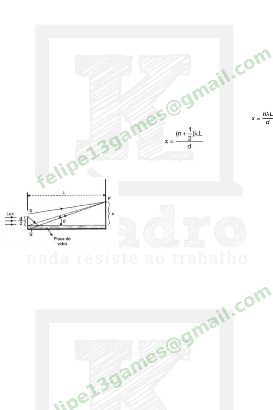 ITA18 - Física LFIS8-3 Listas extras Questão 1 ESPELHO DE LLOYD O espelho de Lloyd: pode-se produzir um padrão análogo ao padrão de fenda dupla, uti l izando-se um espelho de Lloyd (figura a seguir). Em ângulos rasantes, quase 100% da luz que incide no vidro é refletida, de modo que o feixe refletido tem quase a mesma amplitude em P que o feixe que passa diretamente da fenda S até P. A fenda S e sua imagem virtual S' se comportam como fontes coerentes. Mostre que , para os máximos, isto é, as posições das franjas bri lhantes, e para as posições de franjas escuras no anteparo. felipe13games@gmail.c om Questão 2 MAIS CASOS DO EXPERIMENTO DE YOUNG Considere um experimento de Young, onde as fendas são i luminadas por uma frente de onda plana que incide com um ângulo de 30º em relação à normal, conforme mostra a figura. Sabendo-se que a distância entre as fendas é a = 1mm, assinale a alternativa que corresponde à posição em que deve ser colocada uma lâmina de vidro, de índice de refração igual a 1,5, bem como sua espessura, para que a franja central continue exatamente onde ela estaria se a frente de onde incidisse perpendicularmente às fendas, sem nada colocado nas aberturas. Para efeito de cálculos, despreze a obliquidade de incidência na lâmina de vidro. felipe13games@gmail.c om a) 0,5mm, na fenda de cima b) 1mm, na fenda de baixo c) 0,5mm, na fenda de baixo d) 1,5mm, na fenda de cima e) 1mm, na fenda de cima felipe13games@gmail.c om Questão 3 MAIS CASOS DO EXPERIMENTO DE YOUNG Num experimento de Young cuja distância das fendas vale d foi incidido paralelamente uma luz policromática composta por duas componentes de comprimentos de ondas com comprimentos de onda respectivamente iguais a 480nm e 600nm. Qual a distância entre 2 pontos de interferência construtiva consecutivos se o anteparo está fixado a uma distância D das fendas? Considere D >> d felipe13games@gmail.c om Questão 4 LÂMINA DE FACES PARALELAS Uma luz branca incide em um fi lme fino de sabão fazendo um ângulo com a normal. A luz refletida é predominantemente verde de comprimento de onda de . a) Qual é o mínimo valor da espessura do fi lme de sabão para que o fenômeno descrito acima ocorra? b) Que comprimento de onda é visto se o fi lme for observado com luz que incide perpendicularmente à película? Dado: índice de refração do sabão = 4/3 c) Qual seria a resposta do item b) se o observador estivesse atrás da película (Interferência da luz transmitida)? felipe13games@gmail.c om felipe13games@gmail.c om Questão 5 INTERFERÊNCIA EM PLANOS INCLINADOS Luz com comprimento de onda de 600nm é usada para i luminar duas placas de vidro com incidência normal. As placas têm 22cm de comprimento, se encostam em uma extremidade e estão separadas na outra extremidade por um fio que tem raio igual a 0,0025nm. Quantas franjas bri lhantes aparecem ao longo do comprimento total de placas? a) 155 b) 160 c) 167 d) 154 e) 169 felipe13games@gmail.c om Questão 6 INTERFERFERÔMETRO DE MICHELSON-MORLEY Um interferômetro de Michelson, diagramado simplificadamente abaixo, é ajustado até que se possa observar franjas de interferência produzidas com luz monocromática. felipe13games@gmail.c om A luz sai da fonte e atinge a lâmina semiespelhada, parte dela prossegue em direção ao espelho E2 e parte é refletida em direção ao espelho E1. Ambos os feixes são refletidos pelos espelhos e retornam à lâmina semiespelhada. Parte da luz proveniente de E1 atravessa a lâmina em ao observador e parte da luz oriunda de E2 é refletida, também em direção ao observador. Da superposição dos dois feixes de luz é que se originam as franjas de interferência, como ilustrado no diagrama abaixo: Movendo-se o espelho E1, observa-se uma sucessão de deslocamento das franjas (cada deslocamento correspondendo a um ciclo claro-escuro-claro, por exemplo). Se o espelho móvel moveu-se 0,01mm e observaram-se 40 deslocamentos das franjas, qual é o comprimento de onda de luz? felipe13games@gmail.c om Questão 7 DIFRAÇÃO EM FENDA SIMPLES Um feixe de luz branca incide ortogonalmente sobre uma fenda de largura a. a) Qual deve ser a relação entre os dois comprimentos de onda dessa luz para que o primeiro mínimo de uma das cores coincida com a primeira máxima da outra cor? (Depois do máximo central) b) Qual a posição do primeiro ponto escuro nesse experimento? felipe13games@gmail.c om Questão 8 NÚMERO DE FRANJAS ESCURAS felipe13games@gmail.c om felipe13games@gmail.c om Uma fenda é i luminada com luz monocromática cujo comprimento de onda é igual a 510nm. Em um grande anteparo, capaz de refletir toda a luz que atravessa a fenda, são observados apenas cinco mínimos de intensidade de cada lado do máximo central. Sabendo que um dos mínimos encontra-se em , tal que e , determine a largura da fenda. felipe13games@gmail.c om Questão 9 POLARIZAÇÃO E LEI DE MALUS Suponha que o ângulo entre os eixos de transmissão dos polarizadores 1 e 3 na figura abaixo seja mantido fico em , enquanto o ângulo entre os eixos de 1 e 2 pode variar. Mostre que a intensidade no detector é dada por onde é a intensidade do feixe não polarizado que incide sobre o polarizador 1. felipe13games@gmail.c om Questão 10 felipe13games@gmail.c om POLARIZAÇÃO POR REFLEXÃO Responda: a) Mostre que, se o feixe incidente está no meio com menor índice de refração, o ângulo de polarização deve estar entre e . b) Mostre que, se o feixe incidente está no meio com maior índice de refração, o ângulo de polarização deve estar entre e . felipe13games@gmail.c om Questão 11 UM MÉTODO ALTERNATIVO DE SE CALCULAR O PERÍODO DE UM MHS Um bloco de 10,0kg está suspenso por uma corda enrolada em torno de um disco de 5,00kg. Como na figura seguinte. Se a mola tem uma rigidez , determine o período natural de vibração do sistema. felipe13games@gmail.c om Questão 12 UM MÉTODO ALTERNATIVO DE SE CALCULAR O PERÍODO DE UM MHS Ca