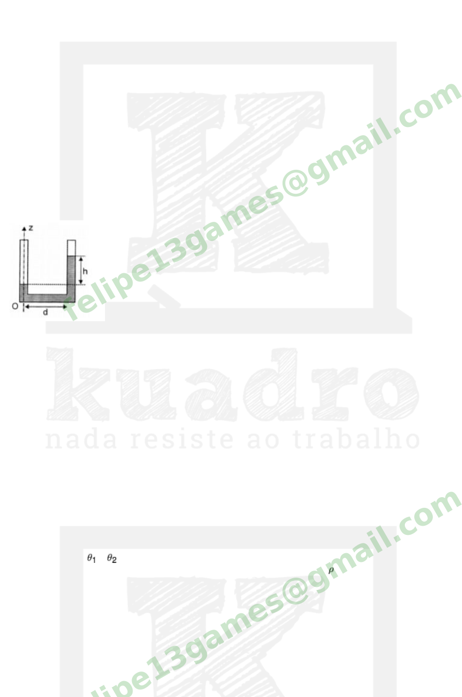 ITA18 - Física LFIS8-2 Listas extras Questão 1 Pressão Dinâmica Um tubo em U contendo um líquido gira em torno do eixo Oz (fig.), com velocidade de 10 rad/s. A distância d entre os dois ramos do tubo é de 30 cm, e ambos são abertos na parte superior. Calcule a diferença de altura h entre os níveis atingidos pelo líquido nos dois ramos do tubo. Use g = 10 m/s2. a) 30 cm b) 35 cm c) 40 cm d) 42 cm e) 45 cm felipe13games@gmail.c om Questão 2 MHS EM LÍQUIDOS Determine o período de oscilações do mercúrio de massa m no interior de um tubo curvo cujos ramos formam ângulos e com a vertical, conforme a figura. A área de seção transversal do tubo é S, a aceleração da gravidade é g e a massa específica do mercúrio é . Despreze a viscosidade do mercúrio. felipe13games@gmail.c om felipe13games@gmail.c om Questão 3 HIDRODINÂMICA Dois cilindros iguais de área transversal A são fixados verticalmente sobre uma plataforma móvel, a qual estava inicialmente em repouso. Os dois recipientes estão conectados a um fino tubo horizontal equipado com uma torneira. A distância entre os eixos dos vasos é L. O vaso do lado esquerdo está preenchido com líquido de densidade e, nesse instante, a massa total do sistema em repouso é M. Após abrir a torneira, determine a velocidade da plataforma no instante que a velocidade da água (nível) é V. (Despreze todos os tipos de atrito) felipe13games@gmail.c om Questão 4 ESTÁTICA Uma prancha homogênea de massa M e comprimento está em um círculo l iso, de raio 1m. Em uma das extremidades da prancha há um corpo de massa M/2. Calcule o ângulo mostrado na figura, se a prancha está em equil íbrio. felipe13games@gmail.c om felipe13games@gmail.c om Questão 5 PRISMA ÓPTICO Considere um prisma óptico transparente e de índice de refração n, conforme a figura abaixo. a) Demonstre que o índice de refração do prisma pode ser dado pelos ângulos de abertura α e ângulo de desvio mínimo δ, dado pela expressão b) Demonstre que para ângulos pequenos de abertura e incidência quase normal, vale que: felipe13games@gmail.c om felipe13games@gmail.c om Questão 6 EXPERIMENTO DE YOUNG COM PRISMA Uma fonte pontual S de comprimento de onda é colocada a uma distância "a" de um duplo prisma chamado biprisma de Fresnel de índice de refração n. O ângulo de abertura do prisma vale, com boa aproximação, a relação . O efeito do prisma é provocar o aparecimento de duas fontes virtuais que geram um padrão de interferência em um anteparo. Se a distância do biprisma ao anteparo é "b", quantas franjas de interferência são vistas no anteparo? Considere o tamanho de uma franja como a distância entre dois máximos de interferência consecutivos. a) b) c) d) e) felipe13games@gmail.c om Questão 7 CAMINHO ÓPTICO Um refratômetro Jamin é um dispositivo para medida ou comparação dos índices de refração dos gases. Um feixe de luz monocrática é dividido em duas partes, cada uma direcionada ao longo do eixo de um tubo cil índrico separado, antes de serem combinadas em um único feixe que é visto através de um telescópio. Suponha que cada tubo tenha comprimento de 0,4m e que seja usada a luz de sódio com comprimento de onda de 589nm. Ambos os tubos inicialmente estão no vácuo, e interferência construtiva é observada no centro do campo de visão. Conforme o ar é l iberado para felipe13games@gmail.c om entrar vagarosamente em um dos tubos, o campo central de visão varia do escuro e de volta para o claro em um total de 198 vezes. O valor aproximado do índice de refração do ar é: a) 1,00025 b) 1,00029 c) 1,00034 d) 1,00042 e) 1,00048 felipe13games@gmail.c om Questão 8 EXPERIMENTO DE YOUNG/ CAMINHO ÓPTICO Duas lâminas transparentes de espessuras e1 e e2 e índices de refração n1 e n2, respectivamente, são colocadas em frente às fendas, conforme figura abaixo. Seja D>>d do sistema de fendas ao anteparo. Determine: a) o descolamento y0 do máximo de ordem zero. b) a condição para que o máximo de ordem zero é formado no centro 0. felipe13games@gmail.c om Questão 9 EXPERIMENTO DE YOUNG COM A FONTE EM MOVIMENTO No arranjo mostrado na figura, duas pequenas fendas se encontram separadas de uma distância d. Numa distância h, se encontra uma fonte pontual de luz S se movendo a uma velocidade constante, de intensidade v. Um receptor A localizado atrás das fendas, e a uma distância d da parede que contém as fendas, verifica que a intensidade da luz varia com uma frequência f = 15Hz. Determine: Dados: e felipe13games@gmail.c om a) A velocidade com que a fonte se move para o caso representado na figura b) A velocidade para o caso em que o receptor A está na mesma vertical de uma das fendas felipe13games@gmail.c om Questão 10 REDE DE DIFRAÇÃO Uma rede de difração é utilizada para se fazer a análise espectral (composição em frequência) de um feixe de luz composto por duas cores. A rede possui 8.000 linhas por centímetro e observa-se que há um primeiro máximo de uma cor em e o segundo máximo da outra cor em . Utilizando as informações abaixo, assinale a alternativa que corresponde à composição cromática do feixe: Vermelho — 700nm Laranja — 620 nm Amarelo — 580 nm Verde — 530 nm Azul — 460 nm Violeta — 400 nm a) laranja e azul b) amarelo e verde c) violeta e vermelho d) azul e vermelho e) laranja e verde felipe13games@gmail.c om felipe13games@gmail.c om Questão 11 ANÉIS DE NEWTON a) Duplo Newton: duas lentes plano-convexas têm raios R1 e R2. As lentes são postas em contato, projetando-se sobre elas luz de comprimento de onda . Em função das interferências das reflexões nas superfícies curvas das lentes, temos a formação dos anéis de Newton. Determine o raio da n- ésima franja bri lhante. b) Resolva o item a) para o caso em que adicionamos um líquido entre as lentes com índice de refração n, tal que felipe13games@gmail.c om Questão 12 MHS EM CIRCUITOS No circuito abaixo, a h