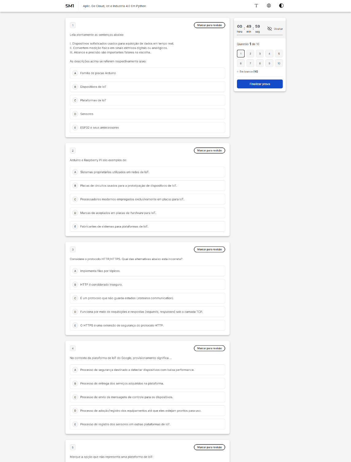 SM1 Aplic. De Cloud, lot e Industria 4.0 Em Python T 1 Marcar para revisão 00 49 59 Ocultar hora min seg Leia atentamente as sentenças abaixo: I. Dispositivos sofisticados usados para aquisição de dados em tempo real. Questão de 10 II. Convertem medição física em sinais elétricos digitais ou analógicos. III. Alcance e precisão são importantes fatores na escolha. 1 2 3 4 5 As descrições acima se referem respectivamente à/ao: 6 7 8 9 10 Em branco (10) A Família de placas Arduino Finalizar prova Dispositivos de loT Plataformas de loT D Sensores E ESP32 e seus antecessores 2 Marcar para revisão Arduino e Raspberry Pi são exemplos de: A Sistemas proprietários utilizados em redes de loT. Placas de circuitos usados para a prototipação de dispositivos de loT. Processadores modernos empregados exclusivamente em placas para loT. D Marcas de acoplados em placas de hardware para loT. E Fabricantes de sistemas para plataformas de loT. 3 Marcar para revisão Considere protocolo HTTP/HTTPS. Qual das alternativas abaixo está incorreta? A Implementa filas por tópicos. HTTP é considerado inseguro. É um protocolo que não guarda estados (stateless communication). D Funciona por meio de requisições e respostas (requests, responses) sob a camada TCP. E HTTPS é uma extensão de segurança do protocolo HTTP. 4 Marcar para revisão No contexto da plataforma de loT do Google, provisionamento significa A Processo de segurança destinado a detectar dispositivos com baixa performance. Processo de entrega dos serviços adquiridos na plataforma. Processo de envio de mensagens de controle para dispositivos. D Processo de adoção/registro dos equipamentos até que eles estejam prontos para uso. E Processo de registro dos sensores em outras plataformas de 5 Marcar para revisão Marque a opção que não representa uma plataforma de loT:A Salesforce loT Cloud Arduino NANO 33 loT Arduino Cloud loT D IBM Watson loT platform E Cisco loT Cloud Connect 6 Marcar para revisão Existem diversas plataformas para desenvolvimento de projetos de loT. Cada uma dessas plataformas possui características que vão desde tempo de resposta a eventos, gerenciamento de dados, segurança e custos, que devem ser consideradas para a escolha de uma plataforma específica. A ThingsBoard é uma dessas plataformas que, entre outras características, possui código aberto. Em relação à plataforma ThingsBoard, selecione a opção CORRETA: A É gratuita para uso pessoal, mas deve ser paga quando uso for comercial. É disponível para a maioria das distribuições do Linux, mas não para Windows. É uma plataforma do lado do servidor de código aberto que permite monitorar e controlar seus dispositivos loT. D Utiliza os protocolos CoAP, XMPP, HTTP. E Ela precisa de aplicações de terceiros para fazer a integração entre dispositivos e aplicações WEB. 7 Marcar para revisão A plataforma ThingsSpeak possui diversas características que a tornam uma escolha muito interessante para projetos de loT. No entanto, todas as plataformas possuem algum ponto fraco e, no caso do ThingsSpeak, infelizmente, não é diferente. Selecione item que apresenta uma desvantagem do ThingsSpeak. A Acesso à nuvem pública. API para armazenamento e análise de dados. Suporte às operações matemáticas. D Pouco suporte para conexão simultânea de dispositivos. E Integração exclusiva com Matlab. 8 Marcar para revisão Um dos protocolos mais utilizados para desenvolver projetos de loT é MQTT. Cada protocolo tem uma orientação que é a base para seu desenvolvimento. A respeito do protocolo MQTT, selecione a opção CORRETA. A É orientado para dados, pois gerencia fluxo entre servidor e os dispositivos da rede. É orientado para Mensagem, pois trata cada mensagem como um bloco de dados que vai ser operado pelo broker. É orientado para Rede, uma vez que considera aspectos específicos da internet. orientado para dispositivo, dado que trata a heterogeneidade dos diversos componentes que podem D se integrar no sistema. É orientado para comunicação segura, uma vez que utiliza de protocolos que reduzem riscos de E comunicação na rede. 9 Marcar para revisão Em uma arquitetura de Internet das Coisas (loT), a camada de dispositivos é composta por elementos capazes de coletar dados e comunicá-los a plataformas de gerenciamento, como WSO2 loT Server. Para que um dispositivo seja considerado capaz de se conectar diretamente à internet, ele deve possuir capacidade de gerenciamento da pilha de protocolos de rede (como TCP/IP), além de interfaces físicas apropriadas (Ethernet, WiFi, 4G etc.). Com base nisso, assinale a alternativa que apresenta apenas dispositivos que possuem capacidade deconexão direta à internet, sem a necessidade de gateways intermediários: A Arduino Uno com módulo Ethernet, sensores ZigBee e Raspberry Pi 4 com WiFi. B Dispositivos Bluetooth Low Energy (BLE), sensores LoRa e ESP8266 com WiFi. C Raspberry Pi 3 com WiFi, Arduino Yun com WiFi e Intel Galileo com E Ethernet. D ESP32 com WiFi, sensores ZigBee e Arduino Mega com módulo de rádio frequência. E Arduino Uno com módulo WiFi, sensores LoRaWAN e dispositivos Bluetooth. 10 Marcar para revisão Os protocolos viabilizam a comunicação dos dispositivos na rede através da disponibilização e especificação de funcionalidades. A respeito do protocolo CoAP, selecione a opção CORRETA sobre a camada que ele atua. A Camada de controle, pois gerencia modo como dispositivos e aplicações WEB se comunicam. B Camada de transporte, uma vez que trata da forma como dados serão transmitidos. C Camada de serviço, pois provê recursos para que dispositivos e aplicações WEB se comuniquem. Camada de aplicação, pois viabiliza desenvolvimento de aplicações WEB que vão interagir com D dispositivos. E Camada de rede, pois trata da heterogeneidade das tecnologias envolvidas na rede.