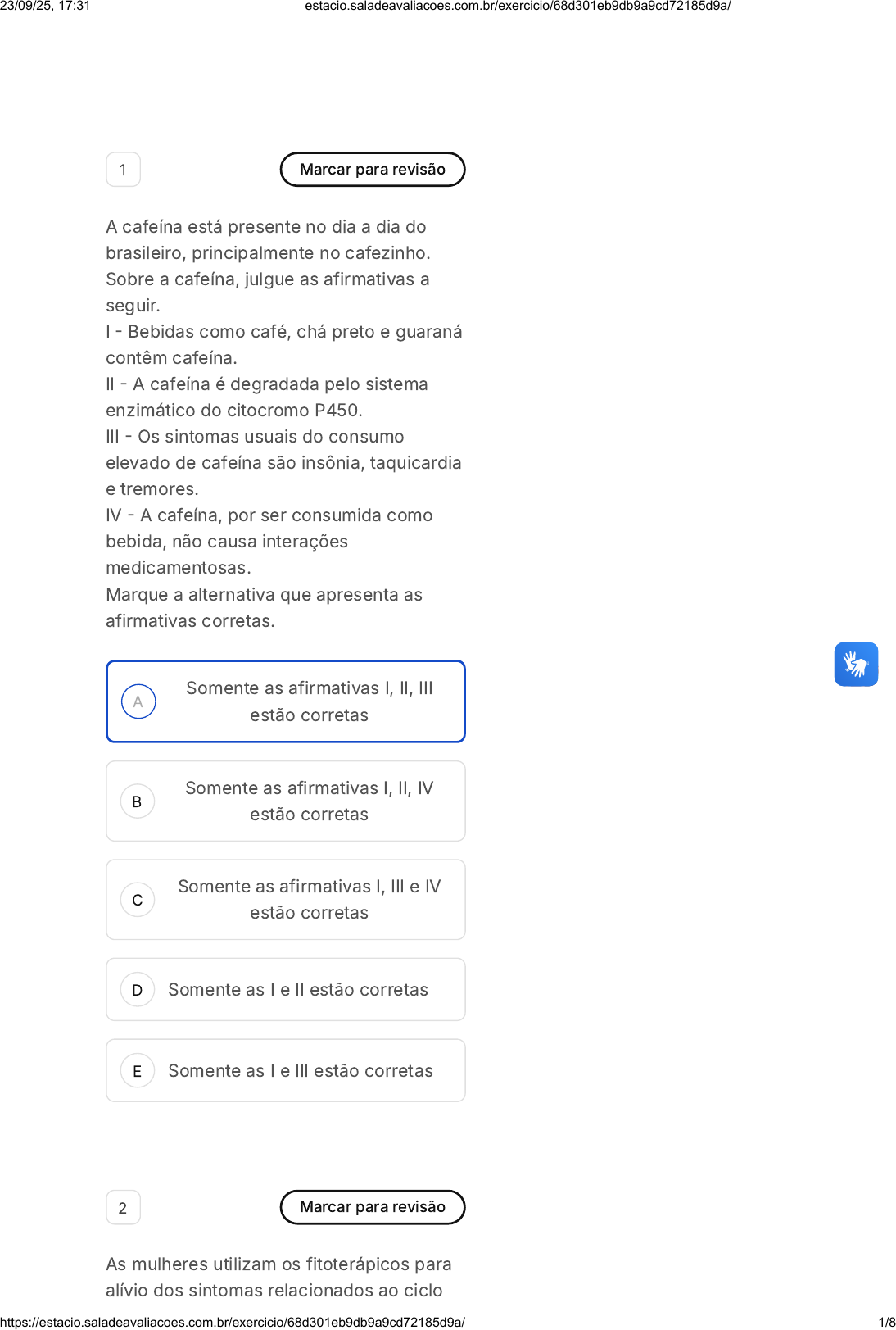 A B C D E 1 Marcar para revisão A cafeína está presente no dia a dia do brasileiro, principalmente no cafezinho. Sobre a cafeína, julgue as afirmativas a seguir. I - Bebidas como café, chá preto e guaraná contêm cafeína. II - A cafeína é degradada pelo sistema enzimático do citocromo P450. III - Os sintomas usuais do consumo elevado de cafeína são insônia, taquicardia e tremores. IV - A cafeína, por ser consumida como bebida, não causa interações medicamentosas. Marque a alternativa que apresenta as afirmativas corretas. Somente as afirmativas I, II, III estão corretas Somente as afirmativas I, II, IV estão corretas Somente as afirmativas I, III e IV estão corretas Somente as I e II estão corretas Somente as I e III estão corretas 2 Marcar para revisão As mulheres utilizam os fitoterápicos para alívio dos sintomas relacionados ao ciclo 23/09/25, 17:31 estacio.saladeavaliacoes.com.br/exercicio/68d301eb9db9a9cd72185d9a/ https://estacio.saladeavaliacoes.com.br/exercicio/68d301eb9db9a9cd72185d9a/ 1/8 A B C D E menstrual e da menopausa, que incluem cansaço, depressão, dores nas articulações e insônia. Considerando as indicações, marque a alternativa que apresenta essas plantas. Barbatimão e cimicífuga. Erva-de-são-joão e equisetum Soja e garra-do-diabo Camomila e erva-de-são-joão Cimicifuga e soja 3 Marcar para revisão A família Asteraceae tem espécies amplamente utilizadas como a camomila, a calêndula e a equinácea. Sobre essas espécies, julgue as afirmativas a seguir. I - A equinácea e a camomila devem ser administradas com cautela em pacientes que façam uso de medicamentos metabolizados pelo citocromo P450. II - A camomila é indicada como ansiolítico e sedativo leve. III - A equinácea pode ser prescrita para a prevenção e tratamento coadjuvante dos sintomas de resfriados. IV - As espécies (camomila, calêndula e equinácea) podem ser prescritas para problemas da cavidade oral. Marque a alternativa que apresenta as afirmativas corretas. 23/09/25, 17:31 estacio.saladeavaliacoes.com.br/exercicio/68d301eb9db9a9cd72185d9a/ https://estacio.saladeavaliacoes.com.br/exercicio/68d301eb9db9a9cd72185d9a/ 2/8 A B C D E A B Somente as I, II, III estão corretas Somente as I, II, IV estão corretas Somente as I, III e IV estão corretas Somente as I e II estão corretas Somente as I e III estão corretas 4 Marcar para revisão Alguns alimentos podem ser utilizados tanto como fitoterápicos quanto para a nutrição e desenvolvimento do organismo humano. Um exemplo é o agrião (Nasturtium officinale), amplamente utilizado em saladas verdes e cujo uso pela população, como xarope, pode ser considerado quase secular. Adaptada de: Buffon, M.; Miguel, M. Fitoterápicos: uma abordagem farmacotécnica. Revista Lecta, v. 21, n. 1/2, p. 7-13. 2003. Sobre a assertiva: Os alimentos podem interferir na absorção e ou ação de um fitoterápico. Marque a alternativa correta. Não, pois são de natureza diferente dos fitoterápicos. Não, porque alimentos estão livres de processos de interação. 23/09/25, 17:31 estacio.saladeavaliacoes.com.br/exercicio/68d301eb9db9a9cd72185d9a/ https://estacio.saladeavaliacoes.com.br/exercicio/68d301eb9db9a9cd72185d9a/ 3/8 C D E A B C Sim, pois fitoterápicos podem interagir com outros medicamentos, alimentos, bebidas e algum agente químico- ambiental. Talvez, pois ainda não temos número expressivo de trabalhos científicos publicados a este respeito. Sim, porque os fitoterápicos só interagem com fármacos. 5 Marcar para revisão Os fitoterápicos e alimentos podem interagir com medicamentos anticoagulantes, potencializando a sua ação, com risco de eventos hemorrágicos no paciente ou inibindo, interferindo com o efeito farmacológico esperado. Marque a alternativa que apresenta os alimentos e essas espécies. Suco de romã, balas de gengibre, alho, maracujá e castanha-da- índia Balas de gengibre, cápsulas de gingko, café, saw-plameto e chá de camomila Cáscara-sagrada, suco de soja, kava-kava, guaraná em pó e garra-do-diabo 23/09/25, 17:31 estacio.saladeavaliacoes.com.br/exercicio/68d301eb9db9a9cd72185d9a/ https://estacio.saladeavaliacoes.com.br/exercicio/68d301eb9db9a9cd72185d9a/ 4/8 D E A B C D E Chá de espinheira-santa, salada de agrião, suco de toranja, hipérico e equisetum Valeriana, farelo de aveia, canela em pó, cápsulas de gingko e cimicífuga 6 Marcar para revisão A ingestão de álcool pelo risco de exacerbação dos efeitos sedativos é contraindicada em associação a vários fitoterápicos. Considerando essa informação, marque a alternativa que apresenta duas plantas que não devem ser utilizadas concomitantemente ao álcool. Camomila e soja Valeriana e kava-kava Hipérico e soja Kava-kava e trevo-vermelho Trevo-vermelho e soja 7 Marcar para revisão Se uma pessoa estiver tomando digoxina para o tratamento da insuficiência cardíaca, deve evitar este alimento contendo glicirrizina. Questão 9 de 10 Respondidas (10) Em branco (0) Finalizar exercícios 1 2 3 4 5 6 7 8 9 10 Lista de exercícios Interações Entre Planta… Sair e finalizar depo 23/09/25, 17:31 estacio.saladeavaliacoes.com.br/exercicio/68d301eb9db9a9cd72185d9a/ https://estacio.saladeavaliacoes.com.br/exercicio/68d301eb9db9a9cd72185d9a/ 5/8 A B C D E Marque a alternativa que contém um exemplo de alimento que tenha este componente. Suco de laranja Carnes de churrasco Licor de alcaçuz orgânico Café Salada de agrião 8 Marcar para revisão No Formulário Terapêutico Nacional de 2010, o hipérico ou erva-de-são-joão aparece como uma planta com elevado número de interações medicamentosas. Sobre essa espécie, julgue as afirmativas a seguir. I - Dentre as interações medicamentosas, constam os anticoagulantes cumarínicos e os anticoncepcionais orais. II - Com medicamentos inibidores da protease e transcriptase reversa, pela redução significativa das concentrações plasmáticas dos fármacos. III - O hipérico atua na ind