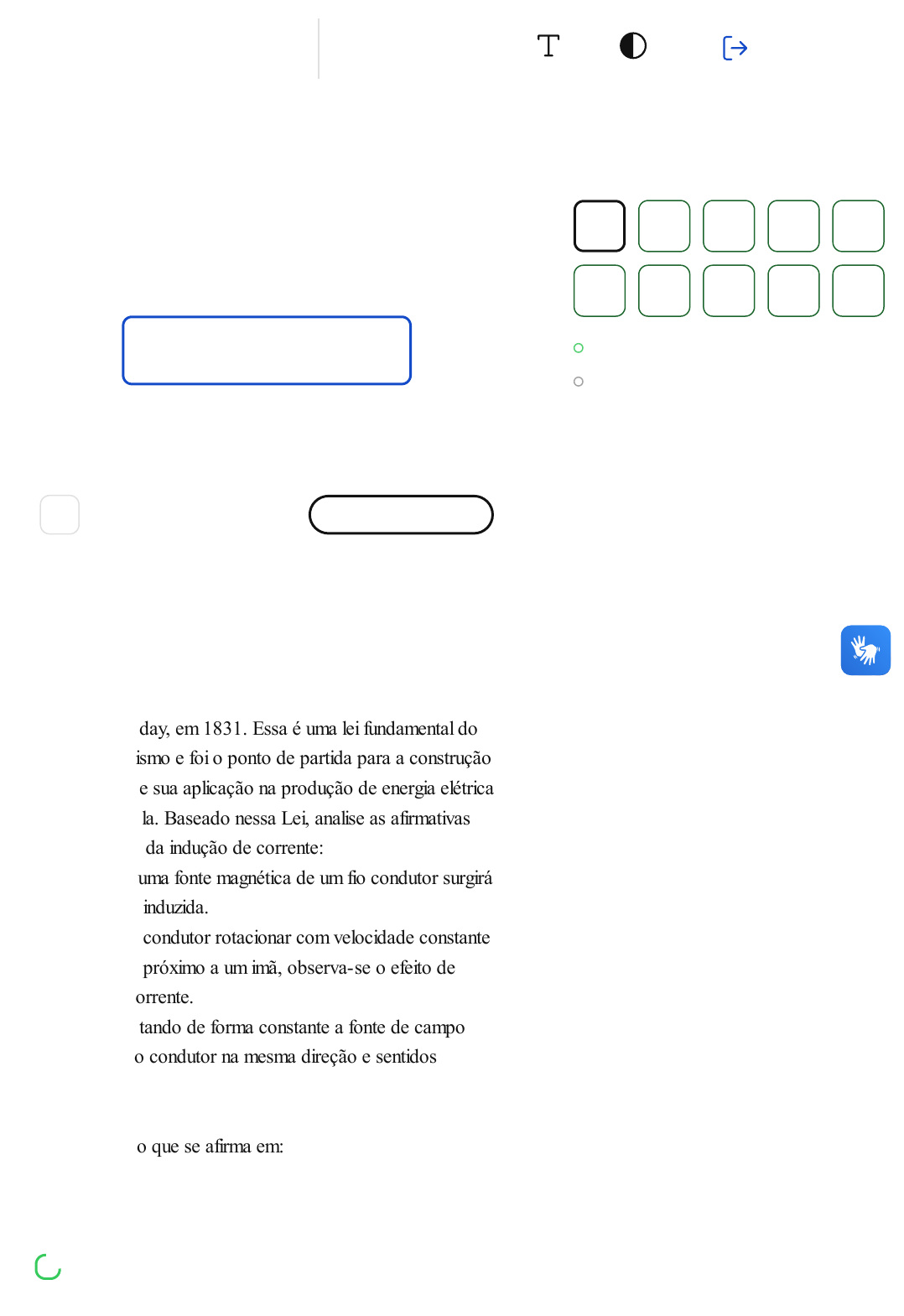 Você acertou 10 de 10 questões Verifique o seu desempenho e continue treinando! Você pode refazer o exercício quantas vezes quiser. Verificar Desempenho 1 Marcar para revisão (IDECAN - 2019 - Adaptada) A Lei de Indução Eletromagnética apresenta que, quando ocorrer uma variação do fluxo magnético através de um fio condutor ou de um enrolamento de fios condutores, surgirá neles uma força eletromotriz induzida. Essa Lei foi estabelecida por Michael Faraday, em 1831. Essa é uma lei fundamental do eletromagnetismo e foi o ponto de partida para a construção dos dínamos e sua aplicação na produção de energia elétrica em larga escala. Baseado nessa Lei, analise as afirmativas abaixo acerta da indução de corrente: I. Ao afastar uma fonte magnética de um fio condutor surgirá uma corrente induzida. II. Quando o condutor rotacionar com velocidade constante em um ponto próximo a um imã, observa-se o efeito de indução de corrente. III. Movimentando de forma constante a fonte de campo magnético e o condutor na mesma direção e sentidos opostos. Está correto o que se afirma em: Questão 1 de 10 Corretas (10) Em branco (0) 1 2 3 4 5 6 7 8 9 10 Lista de exercícios Geradores e Motor… Sair 1 06/10/2025, 19:26 1/12 A B C D E Apenas III. Apenas I e III. Apenas I. Apenas I e II. Apenas II e III. Resposta correta Parabéns, você selecionou a alternativa correta. Confira o gabarito comentado! Gabarito Comentado O surgimento de tensões e correntes induzidas depende da variação de campo magnético, a movimentação constante da fonte e do condutor faz com que não haja movimento relativo e, portanto, não haverá variação. 2 Marcar para revisão (Eletrobrás-AM - 2013 - Adaptada) O motor síncrono é aplicado em processos que demandam velocidade constante com carga variável; pode ser usado para fornecer compensação de potência reativa na indústria. A respeito de um motor síncrono, considere as afirmativas a seguir. I. O ângulo de torque varia em função da carga. II. A velocidade de rotação é sempre constante, independente da carga mecânica em seu eixo. III. O motor síncrono opera sempre como carga indutiva. 1 06/10/2025, 19:26 2/12 A B C D E Está correto o que se afirma em: Apenas I. Apenas II. Apenas III. Apenas I e III. Apenas I e II. Resposta correta Parabéns, você selecionou a alternativa correta. Confira o gabarito comentado! Gabarito Comentado O motor síncrono opera sempre em sincronismo com a velocidade de campo. Isso significa que a velocidade de rotação é sempre constante, independente da carga mecânica em seu eixo, conforme afirmado na proposição II. Além disso, quando a carga aumenta, há um maior esforço e, consequentemente, o ângulo de torque aumenta, como afirmado na proposição I. Portanto, as proposições I e II estão corretas, o que torna a alternativa E a resposta correta para esta questão. 3 Marcar para revisão (FUNDEP - 2018 - Adaptada) O surgimento de motores elétricos permitiu avanços significativos na produção industrial. As máquinas elétricas rotativas são conhecidas 1 06/10/2025, 19:26 3/12 A B C D E por diversos nomes. Analise as afirmativas abaixo sobre tipos de máquinas rotativas: I. Relutância variável. II. Imã permanente. III. Transformadores. Está correto o que se afirma em: Apenas I. Apenas II. Apenas I e II Apenas I e III. Apenas II e III Resposta correta Parabéns, você selecionou a alternativa correta. Confira o gabarito comentado! Gabarito Comentado Afirmativas I e II apresentam nomes corretos para tipos de máquinas elétricas rotativas. Afirmativa III está incorreta, pois transformadores são dispositivos usados para abaixar ou aumentar a tensão e a corrente elétricas. Não são máquinas elétricas. A resposta correta é C. 1 06/10/2025, 19:26 4/12 A B C D E 4 Marcar para revisão (IBFC - 2020 - Adaptada) Uma fábrica comprou um motor de indução de 220 V, 15 CV e quatro polos. A frequência de operação do equipamento é 60 Hz, com escorregamento de plena carga de 5%. Ao ser instalado, o motor foi ligado em Y. Assinale a alternativa que apresenta a velocidade do rotor desse motor, quando com carga nominal. 1800 rpm 1710 rpm 1890 rpm 1200 rpm 900 rpm Resposta correta Parabéns, você selecionou a alternativa correta. Confira o gabarito comentado! Gabarito Comentado 5 Marcar para revisão 1 06/10/2025, 19:26 5/12 A B C D E (FUNDATEC - 2015 - Adaptada) Motor de indução é um motor elétrico construído de tal maneira que se têm dois campos magnéticos girantes. Analisando o funcionamento e as características construtivas dos motores de indução, assinale a alternativa correta: I. O motor de indução de gaiola é assim chamado pelo fato de o enrolamento de seu rotor ser constituído de um conjunto de barras curto-circuitadas, assemelhando-se a uma gaiola de esquilo. II. Operando em vazio, o motor de indução trifásico apresenta escorregamento aproximadamente nulo. III. No motor de indução trifásico de anéis, as correntes que circulam pelo rotor são produzidas por fonte externa e conduzidas ao rotor através de um conjunto de escovas acopladas a anéis instalados no eixo. Está correto o que se afirma em: Apenas II e III. Apenas I e III. Apenas I e II. Apenas III. Apenas II. Resposta correta Parabéns, você selecionou a alternativa correta. Confira o gabarito comentado! Gabarito Comentado Um motor de indução funciona de forma que as correntes que circulam pelo rotor são geradas por indução e não por alimentação externa, um rotor 1 06/10/2025, 19:26 6/12 A B C D E bobinado permite acesso físico (através de contatos) direto à parte rotativa, mas não implica que este será alimentado diretamente ali, isso descaracterizaria a máquina. Em um rotor de gaiola a construção é feita a partir de uma espécie de gaiola cilíndrica curto- circuitada na extremidade. À vazio o MIT quase não possui escorregamento. 6 Marcar para revisão (IBADE - 2019 - Adaptada) Na fase de