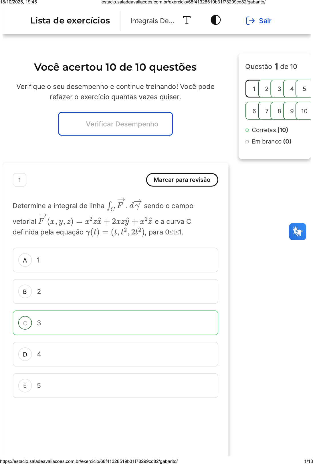 Você acertou 10 de 10 questões Verifique o seu desempenho e continue treinando! Você pode refazer o exercício quantas vezes quiser. Verificar Desempenho A B C D E 1 Marcar para revisão Determine a integral de linha sendo o campo vetorial e a curva C definida pela equação , para 0≤t≤1. ∫ C → F . d → γ → F (x, y, z) = x2zx̂ + 2xzŷ + x2ẑ γ(t) = (t, t2, 2t2) 1 2 3 4 5 Questão 1 de 10 Corretas (10) Em branco (0) 1 2 3 4 5 6 7 8 9 10 Lista de exercícios Integrais De… Sair 18/10/2025, 19:45 estacio.saladeavaliacoes.com.br/exercicio/68f41328519b31f78299cd82/gabarito/ https://estacio.saladeavaliacoes.com.br/exercicio/68f41328519b31f78299cd82/gabarito/ 1/13 A B C D E Resposta correta Parabéns, você selecionou a alternativa correta. Confira o gabarito comentado! Gabarito Comentado A integral de linha é uma ferramenta matemática usada para calcular a soma de infinitos produtos de um campo vetorial e um vetor diferencial ao longo de uma curva. Neste caso, o campo vetorial é dado por e a curva C é definida pela equação , para 0≤t≤1. Ao realizar a integral de linha, obtemos o valor 3, que corresponde à alternativa C. → F (x, y, z) = x2zx̂ + 2xzŷ + x2ẑ γ(t) = (t, t2, 2t2) 2 Marcar para revisão Uma ferramenta matemática muito importante é a integral de linha, pois permite trabalhar com um campo escalar, quando se depende de várias variáveis. Considerando o caminho definido por . O comprimento L(g) do caminho g é: g : [0, 1] → R 2 g(t) = (etcos(2πt), etsen(2πt)) √1 + 4π2(e + 1) √1 + 4π2(e − 1) √1 + 4π2(e − 2) √1 + 4π2(e + 2) √1 + 4π2(e − )1 2 18/10/2025, 19:45 estacio.saladeavaliacoes.com.br/exercicio/68f41328519b31f78299cd82/gabarito/ https://estacio.saladeavaliacoes.com.br/exercicio/68f41328519b31f78299cd82/gabarito/ 2/13 A B Resposta correta Parabéns, você selecionou a alternativa correta. Confira o gabarito comentado! Gabarito Comentado 3 Marcar para revisão Determine o momento de Inércia em relação ao eixo y de um objeto na forma de um quarto da circunferência no plano XZ, de raio 2, com centro na origem, e com x e z maiores ou iguais a zero. Sabe-se que a densidade linear de massa do objeto vale δ(x, y, z) = z 8 16 18/10/2025, 19:45 estacio.saladeavaliacoes.com.br/exercicio/68f41328519b31f78299cd82/gabarito/ https://estacio.saladeavaliacoes.com.br/exercicio/68f41328519b31f78299cd82/gabarito/ 3/13 C D E 32 64 128 Resposta correta Parabéns, você selecionou a alternativa correta. Confira o gabarito comentado! Gabarito Comentado O momento de inércia de um objeto em relação a um eixo é dado por: Onde: * é a densidade linear de massa do objeto; * é o volume de uma partícula infinitesimal do objeto. No caso do objeto em questão, a densidade linear de massa é constante, então podemos escrever: O volume do objeto é dado por: Substituindo na equação do momento de inércia, obtemos: Substituindo os valores de r, obtemos: Portanto, a resposta correta é C. Iy = ∫ V ρ(x, y, z)y2 dV ρ(x, y, z) dV Iy = ∫ V z2 dV V = r2π 4 Iy = r4π 4 Iy = (2)4 = 32 π 4 4 Marcar para revisão Uma ferramenta matemática muito importante é a integral de linha, pois permite trabalhar com um campo vetorial, quando se depende de várias variáveis. Considere o campo vetorial definido por . O trabalho de ao longo da espiral descrita pelo caminho é: f : R3 ↦ R 3 f(x, y, z) = (yzexyz,xzexyz,xyexyz) f g(t) = (5cos(t), 5sen(t), t2), tϵ[0, ]π 4 18/10/2025, 19:45 estacio.saladeavaliacoes.com.br/exercicio/68f41328519b31f78299cd82/gabarito/ https://estacio.saladeavaliacoes.com.br/exercicio/68f41328519b31f78299cd82/gabarito/ 4/13 A B C D E e − 4 25π2 32 e − 3 25π2 32 e − 2 25π2 32 e − 1 25π2 32 e 25π2 32 Resposta correta Parabéns, você selecionou a alternativa correta. Confira o gabarito comentado! Gabarito Comentado 5 Marcar para revisão Uma ferramenta matemática muito importante é a integral de linha, pois permite trabalhar com um campo vetorial, quando se depende de várias variáveis. Considere o campo definido em \ por . A integral de linha de F ao longo da circunferência de raio 1 centrada na origem e percorrida no sentido direto é: R 2 (0, 0) F(x, y) = ( , − ) y x2+4y2 x x2+4y2 18/10/2025, 19:45 estacio.saladeavaliacoes.com.br/exercicio/68f41328519b31f78299cd82/gabarito/ https://estacio.saladeavaliacoes.com.br/exercicio/68f41328519b31f78299cd82/gabarito/ 5/13 A B C D E −π 2π 3π 2 5π 2 π 2 Resposta correta Parabéns, você selecionou a alternativa correta. Confira o gabarito comentado! Gabarito Comentado 18/10/2025, 19:45 estacio.saladeavaliacoes.com.br/exercicio/68f41328519b31f78299cd82/gabarito/ https://estacio.saladeavaliacoes.com.br/exercicio/68f41328519b31f78299cd82/gabarito/ 6/13 A B C D E 6 Marcar para revisão Uma ferramenta matemática muito importante é a integral de linha, pois permite trabalhar com um campo vetorial, quando se depende de várias variáveis. Considere o campo vetorial em , onde C é o quadrado de vértices (0, 0), (1, 0), (1, 1), (0, 1), percorrido no sentido anti-horário. O valor de é: F(x, y) = (5 − xy − y2,x2 − 2xy) R 2 ∫ C F . dr 2/3 3/2 1/2 1/3 5/2 18/10/2025, 19:45 estacio.saladeavaliacoes.com.br/exercicio/68f41328519b31f78299cd82/gabarito/ https://estacio.saladeavaliacoes.com.br/exercicio/68f41328519b31f78299cd82/gabarito/ 7/13 Resposta correta Parabéns, você selecionou a alternativa correta. Confira o gabarito comentado! Gabarito Comentado 7 Marcar para revisão Determine a integral de linha , onde a curva C é um retângulo centrado na origem, percorrido no sentido anti-horário, com lados (1,2), ( -1,2), (-1, -2) e (1, -2). ∮ C eydx + 4xeydy 18/10/2025, 19:45 estacio.saladeavaliacoes.com.br/exercicio/68f41328519b31f78299cd82/gabarito/ https://estacio.saladeavaliacoes.com.br/exercicio/68f41328519b31f78299cd82/gabarito/ 8/13 A B C D E 3(e2 − e−2) 6(e−2 + e2) 4(e−2 − 2e2) 3(2e−2 − e2) 6(e−2 − e2) Resposta correta Parabéns, você 