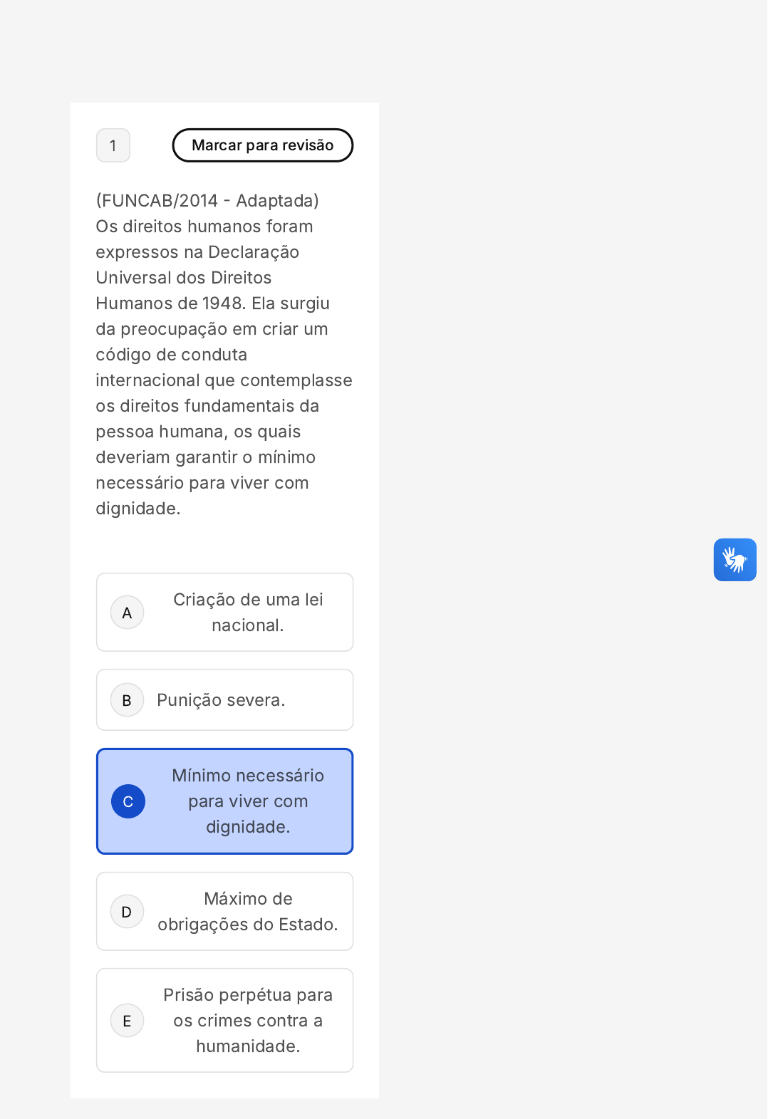 A B C D E 1 Marcar para revisão (FUNCAB/2014 - Adaptada) Os direitos humanos foram expressos na Declaração Universal dos Direitos Humanos de 1948. Ela surgiu da preocupação em criar um código de conduta internacional que contemplasse os direitos fundamentais da pessoa humana, os quais deveriam garantir o mínimo necessário para viver com dignidade. Criação de uma lei nacional. Punição severa. Mínimo necessário para viver com dignidade. Máximo de obrigações do Estado. Prisão perpétua para os crimes contra a humanidade. A B C 2 Marcar para revisão Na história da humanidade, a ideia de cidadania remonta a dezenas de séculos atrás. Sobre o tema, analise as proposições abaixo e a relação entre elas. I. É possível afirmar que já na polis grega, no período da Antiga Grécia, já se vislumbrava a ideia de cidadania. PORQUE II. Todas as pessoas eram livres e iguais, independentemente de gênero, classe e raça. A respeito dessas asserções, assinale a opção correta. As asserções I e II são proposições verdadeiras, e a II é uma justificativa correta da I As asserções I e II são proposições verdadeiras, mas a II não é uma justificativa correta da I. A asserção I é uma proposição verdadeira, e a II é uma proposição falsa. D E A asserção I é uma proposição falsa, e a II é uma proposição verdadeira. As asserções I e II são proposições falsas. 3 Marcar para revisão A ideia de sustentabilidade vem ganhando cada vez mais espaço e modificando as relações sociais. Acerca do tema, analise as proposições abaixo e a relação entre elas. I. A sustentabilidade guarda relação direta com a finitude dos recursos do planeta. PORQUE II. O consumo exagerado e desregulado dos recursos naturais ameaça a qualidade de vida da espécie humana bem como sua própria existência no planeta. A respeito dessas asserções, assinale a opção correta. A B C D E As asserções I e II são proposições verdadeiras, e a II é uma justificativa correta da I. As asserções I e II são proposições verdadeiras, mas a II não é uma justificativa correta da I. A asserção I é uma proposição verdadeira, e a II é uma proposição falsa. A asserção I é uma proposição falsa, e a II é uma proposição verdadeira. As asserções I e II são proposições falsas. 4 Marcar para revisão Durante uma reunião de pais e professores, a professora Ana percebe que os pais de Felipe, um aluno, estão preocupados com a dificuldade de seu filho em fazer amigos na escola. Como a professora Ana pode ajudar Felipe a desenvolver A B C D E habilidades sociais e se sentir mais acolhido? Sugerir que Felipe seja colocado em um programa de tutoria para alunos com dificuldades sociais. Incentivar Felipe a se juntar a clubes e atividades extracurriculares onde ele possa encontrar alunos com interesses similares. Aconselhar os pais de Felipe a procurarem terapia para ele sem envolver a escola. Ignorar a preocupação dos pais, considerando que é normal crianças terem dificuldades em fazer amigos. Organizar atividades de grupo obrigatórias para forçar Felipe a interagir com seus colegas. A B C 5 Marcar para revisão Rafael e Luana são membros de um grupo de trabalho que está enfrentando dificuldades para concluir um projeto importante dentro do prazo estabelecido. Eles percebem que cada membro está trabalhando de forma isolada e não há uma colaboração eficaz entre eles. Como Rafael e Luana podem promover uma colaboração mais orientada dentro do grupo? Culpar os outros membros do grupo pelo atraso no projeto, aumentando a tensão e o conflito. Dividir o projeto em partes menores e atribuir tarefas específicas a cada membro do grupo, incentivando a colaboração e a responsabilidade compartilhada. Deixar o projeto de lado e esperar que os problemas se resolvam por conta própria. D E A B C Trabalhar de forma isolada, sem compartilhar informações ou colaborar com os outros membros do grupo. Ignorar as dificuldades enfrentadas pelo grupo e focar apenas em suas próprias tarefas. 6 Marcar para revisão (FAURGS/2022) Os direitos fundamentais, entre todas as suas classificações, têm aquela embasada nas diversas dimensões/gerações. Qual o direito descrito como sendo de primeira dimensão/geração? Liberdade. Igualdade material e formal. Solidariedade. 00 hora : 35 min : 29 seg Ocultar Questão 10 de 10 Respondidas (10) Em branco (0) Finalizar prova 1 2 3 4 5 6 7 8 9 10 SM1 Educacao e Direitos Humanos D E A B C D E Engenharia genética. Paz mundial. 7 Marcar para revisão Nos termos constitucionais, a previdência social é um: Direito social. Dos fundamentos da República Federativa do Brasil. Dos objetivos fundamentais da República Federativa do Brasil. Remédio constitucional. Direito de nacionalidade. 8 Marcar para revisão Acerca do direito de reunião, marque a alternativa correta: A B C Todos podem se reunir em locais públicos, mesmo que estejam com armas, desde que pacificamente. É permitida a reunião em locais públicos, mesmo com armas, desde que haja autorização da autoridade competente. A liberdade de reunião protege as manifestações em locais públicos, mas não as passeatas. D E São permitidas passeatas e manifestações pacíficas, sem armas, desde que autorizadas pela autoridade competente. Todos podem reunir- se pacificamente, sem armas, em locais abertos ao público, independentemente de autorização, desde que não frustrem outra reunião anteriormente convocada para o mesmo local. 9 Marcar para revisão O Brasil é um Estado Democrático de Direito. Como tal, nele vigora uma Constituição que não apenas delineia a estrutura fundamental do Estado, mas também resguarda os direitos fundamentais. No que se refere aos direitos e garantias fundamentais existentes na Constituição da epública Federativa do Brasil de 1988, assinale a alternativa correta. A B C Homens e mulheres são iguais perante a Constituição, sendo uns mais igu