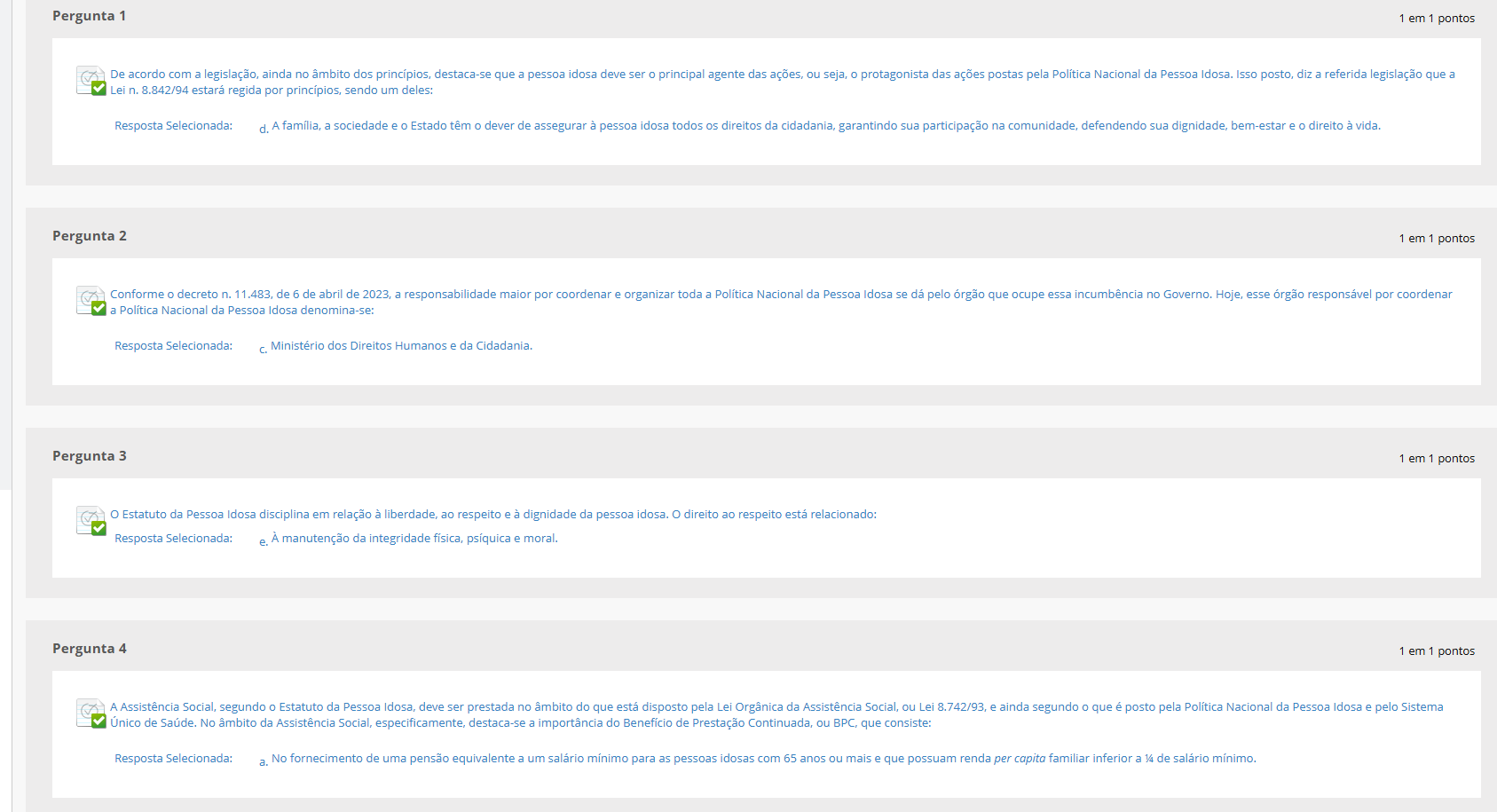 Pergunta 1 1 em 1 pontos De acordo com a legislação, ainda no âmbito dos princípios, destaca-se que a pessoa idosa deve ser principal agente das ações, ou seja, protagonista das ações postas pela Política Nacional da Pessoa Idosa. Isso posto, diz a referida legislação que a Lei n. 8.842/94 estará regida por princípios, sendo um deles: Resposta Selecionada: d. A família, a sociedade e Estado têm 0 dever de assegurar à pessoa idosa todos os direitos da cidadania, garantindo sua participação na comunidade, defendendo sua dignidade, bem-estar e 0 direito à vida. Pergunta 2 1 em 1 pontos Conforme decreto n. 11.483, de 6 de abril de 2023, a responsabilidade maior por coordenar e organizar toda a Política Nacional da Pessoa Idosa se dá pelo órgão que ocupe essa incumbência no Governo. Hoje, esse órgão responsável por coordenar a Política Nacional da Pessoa Idosa denomina-se: Resposta Selecionada: Ministério dos Direitos Humanos e da Cidadania. Pergunta 3 1 em 1 pontos Estatuto da Pessoa Idosa disciplina em relação à liberdade, ao respeito e à dignidade da pessoa idosa. direito ao respeito está relacionado: Resposta Selecionada: e. À manutenção da integridade física, psíquica e moral. Pergunta 4 1 em 1 pontos A Assistência Social, segundo Estatuto da Pessoa Idosa, deve ser prestada no âmbito do que está disposto pela Lei Orgânica da Assistência Social, ou Lei 8.742/93, e ainda segundo que é posto pela Política Nacional da Pessoa Idosa e pelo Sistema Único de Saúde. No âmbito da Assistência Social, especificamente, destaca-se a importância do Benefício de Prestação Continuada, ou BPC, que consiste: Resposta Selecionada: a. No fornecimento de uma pensão equivalente a um salário mínimo para as pessoas idosas com 65 anos ou mais e que possuam renda per capita familiar inferior a 1/4 de salário mínimo.