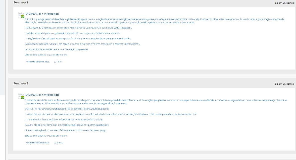 Pergunta 1 0,5 em 0,5 pontos com modificações) Não acho que seja identificar a globalização apenas com a criação de uma economia embora este seja seu ponto focal e sua característica mais Precisamos other além da economia. Antes de a globalização depende da eliminação de obstáculos técnicos, não de obstáculos Isso tornou organizar a e não apenas em internacional novo entrevista a Antonio Paulo: das 2000 (adaptado). Um fator essencial para a organização da na conjuntura destacada no é Criação de uniões aduaneiras nas quais são eliminados entraves para a 11. Difusão de padrões em especial quanto a normas e valores associados a governos democráticos III. Supressão de entraves para a livre circulação de correto apenas que se afirma Resposta Selecionada: b. Pergunta 2 0,5 em pontos com modificações) No final do século XX e em razão dos avanços da produziu se um sistema presidido pelas técnicas da que passaram a exercer um papel de entre as demais unindo as e assegurando ao novo sistema uma presença Um mercado que utiliza esse sistema de técnicas avançadas resulta nessa globalização M. uma Rio de Record. 2008 (adaptado) Uma consequência para setor e outra para mundo do trabalho advindas das transformações citadas no texto estão respectivamente Limitação dos fluxos logísticos e fortalecimento de associações Aumento dos investimentos e valorização dos postos Automatização dos processos fabris e aumento dos de correto apenas que se afirma em: Resposta Selecionada: d.Pergunta 3 0,5 em pontos com modificações) Um carro esportivo é financiado pelo projetado na e montado em México e França, usando mais avançados componentes que foram em Nova e fabricados na A campanha publicitária desenvolvida na filmada no a edição e as feitas em Nova York para serem veiculadas no mundo todo Teias globais disfarçam-se com 0 uniforme nacional que lhes for mais conveniente. R. trabalho nações: preparando-nos para capitalismo no século São Paulo: 1994 A viabilidade do processo de produção ilustrado pelo texto pressupõe 0 uso de: Linhas de montagem e formação de Empresas com estruturas e e mão de obra Organização em rede e tecnologia de IV. Gestão centralizada e protecionismo Está correto apenas que se afirma em: Resposta Selecionada: III. Pergunta 4 0.5 em 0.5 pontos (UFAL com modificações) Um dos temas mais debatidos na atualidade globalização. Sobre esse considere as afirmativas a seguir. LA globalização das comunicações tem sua face mais destacada na rede mundial de que permite um intenso fluxo de troca de idelas e A globalização do final do século XX tem as mesmas caracter do intenso comércio da época do mercantilismo. A globalização das comunicações aumentou a universalização do acesso a melos de eliminando as desigualdades socials existentes entre desenvolvidos e 05 em IV. Os efeitos da no mercado de trabalho são evidentes com a criação de modalidades de emprego para com mão de obra mais barata voltada à execução de serviços que não exigem alta qualificação. V.A globalização intensifica ritmo das mudanças nos meios de tendendo a um aumento de tecnologias limpas e Está correto apenas que se afirma em: Resposta Selecionada:Pergunta 5 0.5 em pontos (AMEOSC/2021, com modificações) Os blocos comercials como Europela e Mercosul deverão abrir lugar para acordos bilaterais entre mercado globalizado como 0 conhecemos está em plena mudança devido a Teremos um realinhamento na estrutura comercial do Os comerciais como União Europeia e Mercosul deverão abrir lugar para acordos bilaterais entre (...) Os efeitos colaterais da pandemia no mercado global deverão ser extremos e provocar profundas alterações na forma como os paises negociam seus produtos e serviços. (...) Por Carlos Analista e em: exposta adma evidencia a contração econômica provocada pela pandemia de covid-19 a consequente mudança nas organizações econômicas Tal realidade encontro que afirmam alguns Segundo eles. desde 0 inicio dos anos 2000 mundo passa por um de depois de anos de crescente integração econômica, que pode ser entendido como uma tentativa de redução da interdependência entre Um fato que corrobora com ponto de vista defendido por cientistas politicos em relação ao processo de "desglobalização" LA formação de blocos união de diferentes nações com intuito de estabelecer uma relação econômica fortalecida entre si. 11. A expansão das empresas que possuem sua sede em um determinado país e em outros fato que representa uma adversidade vivenciada pelo principal bloco econômico abalando ideal de construção de uma Europa Esta correto apenas 0 que se afirma em: Resposta Pergunta 6 0.5 em 0.5 pontos com modificações) anos 90 século passado. 0 Brasil era reconhecido como nova potência regional na economia do mundo. No ano de 2018. estudos do FMI apontaram sétimo ano seguido de queda na economia Em que pese de crise pode-se destacar que Brasil desempenha um papel no cenário mundial. Assinale a opção correta acerca da geopolitica brasileira no século XXI. cenáno geopolitico global a China tem exercido uma influência cada vez maior nas relações do Brasil e em sua balança comercial. crescimento da produção industrial e de commodities da economia brasileira nas últimas décadas tem colocado Brasil como potência mundial em situação de desenvolvimento tecnológico na denominada economia do conhecimento. A posição de centro financeiro, industrial e econômico na do Sul reforça papel do Brasil de potência regional na do Sul e papel do bloco geoeconômico Mercosul no global. correto apenas 0 que se afirma em: Resposta Selecionada:Pergunta 7 0,5 em 0,5 pontos (IBADE/2020, com modificações) geógrafo Rogério Haesbaert (2013) compreende que 0 século XXI provavelmente evidenciará um novo ainda não muito claro, da força da contradição da globalização em termos de suas dimensões e de seu co