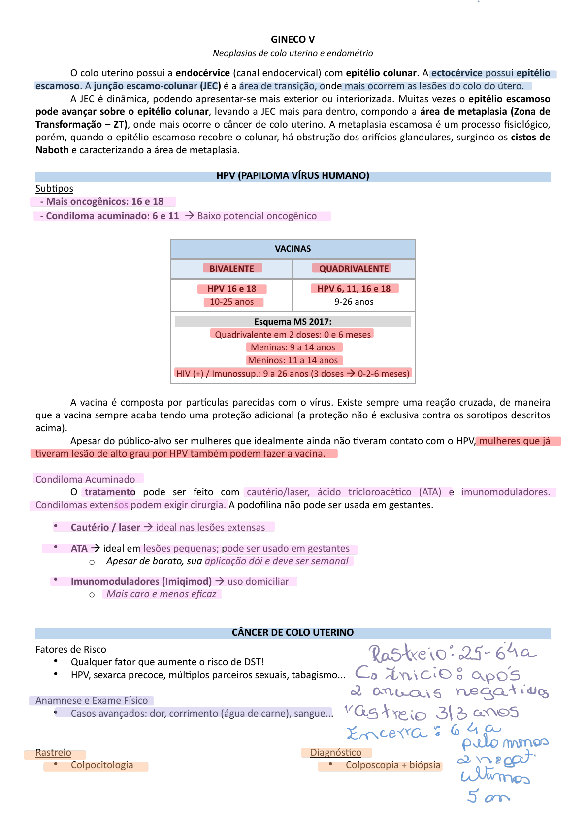 GINECO V Neoplasias de colo uterino e endométrio O colo uterino possui a endocérvice (canal endocervical) com epitélio colunar. A ectocérvice possui epitélio escamoso. A junção escamo-colunar (JEC) é a área de transição, onde mais ocorrem as lesões do colo do útero. A JEC é dinâmica, podendo apresentar-se mais exterior ou interiorizada. Muitas vezes o epitélio escamoso pode avançar sobre o epitélio colunar, levando a JEC mais para dentro, compondo a área de metaplasia (Zona de Transformação – ZT), onde mais ocorre o câncer de colo uterino. A metaplasia escamosa é um processo fisiológico, porém, quando o epitélio escamoso recobre o colunar, há obstrução dos oriKcios glandulares, surgindo os cistos de Naboth e caracterizando a área de metaplasia. HPV (PAPILOMA VÍRUS HUMANO) SubMpos - Mais oncogênicos: 16 e 18 - Condiloma acuminado: 6 e 11 ! Baixo potencial oncogênico A vacina é composta por parPculas parecidas com o vírus. Existe sempre uma reação cruzada, de maneira que a vacina sempre acaba tendo uma proteção adicional (a proteção não é exclusiva contra os soroMpos descritos acima). Apesar do público-alvo ser mulheres que idealmente ainda não Mveram contato com o HPV, mulheres que já Mveram lesão de alto grau por HPV também podem fazer a vacina. Condiloma Acuminado O tratamento pode ser feito com cautério/laser, ácido tricloroacéMco (ATA) e imunomoduladores. Condilomas extensos podem exigir cirurgia. A podofilina não pode ser usada em gestantes. • Cautério / laser ! ideal nas lesões extensas • ATA ! ideal em lesões pequenas; pode ser usado em gestantes o Apesar de barato, sua aplicação dói e deve ser semanal • Imunomoduladores (Imiqimod) ! uso domiciliar o Mais caro e menos eficaz CÂNCER DE COLO UTERINO Fatores de Risco • Qualquer fator que aumente o risco de DST! • HPV, sexarca precoce, múlMplos parceiros sexuais, tabagismo... Anamnese e Exame Físico • Casos avançados: dor, corrimento (água de carne), sangue... Rastreio • Colpocitologia DiagnósMco • Colposcopia + biópsia VACINAS BIVALENTE QUADRIVALENTE HPV 16 e 18 10-25 anos HPV 6, 11, 16 e 18 9-26 anos Esquema MS 2017: Quadrivalente em 2 doses: 0 e 6 meses Meninas: 9 a 14 anos Meninos: 11 a 14 anos HIV (+) / Imunossup.: 9 a 26 anos (3 doses ! 0-2-6 meses) Em mulheres menopausadas, a JEC fica mais interiorizada – logo, em pós-menopausadas, pode-se entrar um pouco mais com a escova endocervical (até as cerdas desaparecerem). DiagnósMco ! Colposcopia + biópsia! • Ácido acédco: demonstra aumento da aMvidade proteica o Área acetobranca: biópsia! • Teste de Schiller (Lugol): demonstra redução do glicogênio o Iodo negaMvo (Schiller posiMvo): biópsia • Gestante: biópsia apenas na suspeita de invasão! • Achado mais suspeito: vasos aPpicos (neoangiogênese) • Colposcopia insadsfatória (sem JEC): avaliar canal endocervical o Afastador / curetagem / histeroscopia Histologia • Lesões intraepiteliais • Câncer cervical COLPOCITOLOGIA QUANDO COLHER - 1x/ano, após 2 negaMvos, a cada 3 anos - Entre 25 e 64 anos, após a sexarca - Parar após histerectomia por doença benigna sem história de lesão de alto grau - GESTANTES ! igual a não grávida - HIV (+) ! após sexarca (independente da idade) – coletar de 6/6m no 1º ano; após anualmente * se CD4 4 cm de profundidade ESTÁDIO II IIA Parte superior da vagina (“vem Abaixo”) IIA1: até 4 cm IIA2: maior que 4 cm IIB Invade paramétrio ESTÁDIO III IIIA 1/3 inferior da vagina IIIB Prede pélvica / hidronefrose / exclusão renal ESTÁDIO IV IVA Bexiga e reto IVB Metástase a distância TRATAMENTO ESTÁDIO 0 Cone é diagnósMco e terapêuMco ESTÁDIO IA1 Padrão: histerectomia dpo 1 Se deseja gestar: cone ESTÁDIO IA2 Padrão: histerectomia dpo 2 + linfadenectomia pélvica ESTÁDIO IB1 Padrão: Wertheim-Meigs ESTÁDIO IB2 ESTÁDIO IIA Wertheim-Meigs ou quimiorradioterapia ESTÁDIO ≥ IIB Quimiorradioterapia Invasão (quando o câncer passa do colo): • Condnuidade CÂNCER DE ENDOMÉTRIO Fatores de Risco • Obesidade, idade > 60 anos, raça branca, nuliparidade, anovulação crônica, menacme longo, DM, hiperplasia aPpica, síndrome de Lynch II (CA colorretal não polipoide hereditário)... • Ação estrogênica sem proteção da progesterona ! SOP • A nuliparidade é um fator de risco pela falta da progesterona (nas gestações) • O principal fator de risco é a obesidade! Fator de proteção • MulMparidade, tabagismo e usuária de progesterona Clínica • Sangramento peri / pós-menopausa ➢ SUA após menopausa: atrofia (30%) / TH (30%) / CA endométrio (15%) Suspeita Menopausa: • Endométrio > 4 mm sem TH • Endométrio > 8 mm com TH Colpocitologia suspeita: • Célula endometrial pós-menopausa DiagnósMco • Cureta de Novak • Curetagem fracionada • Histeroscopia com biópsia (padrão-ouro) ➢ Hiperplasia endometrial ➢ Câncer de endométrio Tratamento Hiperplasias (precedem 80% dos CA) Quem manda na conduta = ter ou não aMpia ➔ Com aMpia: histerectomia TRATAMENTO: ATIPIA x DESEJO DE GESTAR Tipo Risco de malignização Simples sem adpia 1% Complexa sem adpia 3% Simples com adpia 8% Complexa com adpia 29% Simples ou c o m p l e x a SEM ATIPIA Progesterona: mais usado Histerectomia: pós-menopausa ou fa l h a d e t rata m e nto c l í n i co (exceção) Câncer de endométrio • Tipo mais comum: ENDOMETRIOIDE • O tratamento consiste em LAPAROTOMIA = estadiamento e tratamento • RADIOTERAPIA: ≥ 50% invasão miometrial (≥ IB) • QUIMIOTERAPIA: metástases Simples ou c o m p l e x a COM ATIPIA Histerectomia: eleição na presença de aMpia Progesterona: desejo de gestar ou alto risco cirúrgico (exceção) HTA + lavado + anexectomia b i latera l + linfadenectomia (se suspeito)