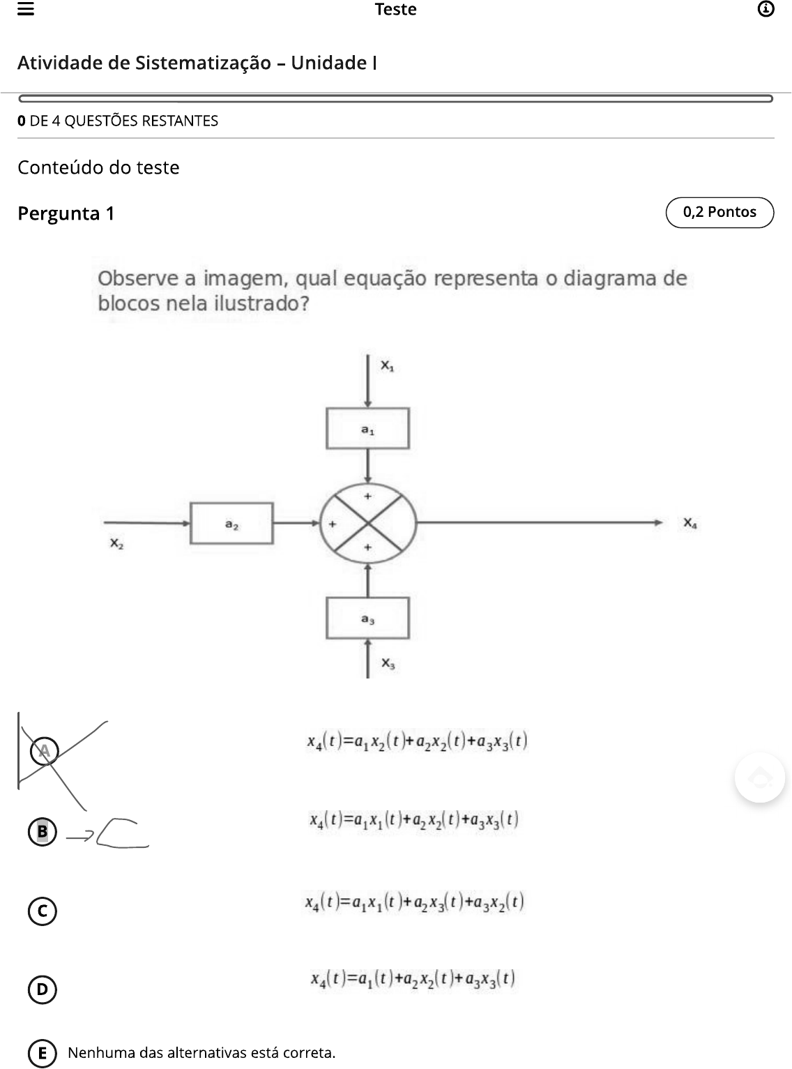 Teste i Atividade de Sistematização - Unidade I 0 DE 4 QUESTÕES RESTANTES Conteúdo do teste Pergunta 1 0,2 Pontos Observe a imagem, qual equação representa diagrama de blocos nela ilustrado? a₁ + a₂ + + B c D E Nenhuma das alternativas está correta.Pergunta 2 0,2 Pontos Podemos classificar um sistema de controle quanto à sua: A organização espacial e temporal; estrutura e gráficos; c representação e continuidade; D dimensão e peso; E nenhuma alternativa é correta. Pergunta 3 0,2 Pontos Podemos dizer que um ponto de ramificação é: A Nenhuma das alternativas está correta. É um elemento do sistema. É onde sinal é alterado por meio de uma função. Essa função G(s) é conhecida como função de transferência. c É exatamente sinal de referência na entrada do sistema. É ponto do qual sinal que vem de um bloco avança simultaneamente em direção a outros blocos D ou somadores. É ponto ligado no somador, que se compara ao sinal de entrada R(s). A saída do bloco C(s), nesse E caso, é obtida pela multiplicação da função de transferência G(s) com ponto de ramificação. Pergunta 4 0,2 Pontos O principal objetivo do estudo de sistemas de controle é: A Otimizar controladores de sistemas automatizados; Aprender a reproduzir sistemas de controle existentes no mercado; c Obter os melhores controladores a partir de representações com diagramas de blocos;Construir, analisar e intervir em sistemas de controle, otimizando tempos de respostas e D minimizando perdas. E Nenhuma das alternativas está correta. Salvo pela última vez 16:21:01 Filtro de questões (4) Salvar e fechar Enviar