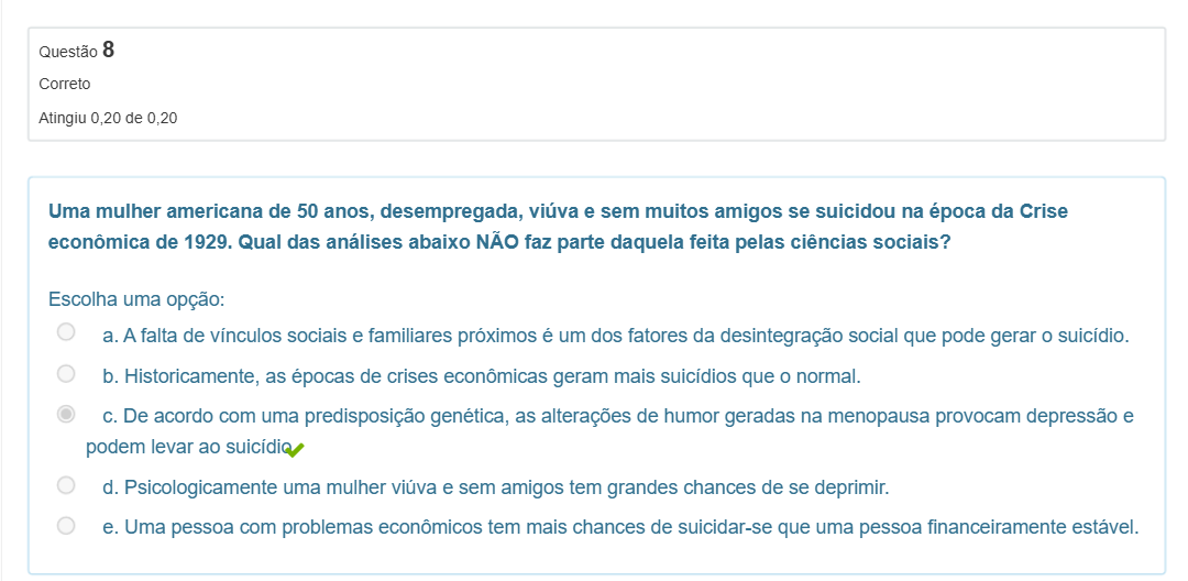 Questão 8 Correto Atingiu 0,20 de 0,20 Uma mulher americana de 50 anos, desempregada, viúva e sem muitos amigos se suicidou na época da Crise econômica de 1929. Qual das análises abaixo NÃO faz parte daquela feita pelas ciências sociais? Escolha uma opção: a. A falta de vínculos sociais e familiares próximos é um dos fatores da desintegração social que pode gerar suicídio. b. Historicamente, as épocas de crises econômicas geram mais suicídios que normal. C. De acordo com uma predisposição genética, as alterações de humor geradas na menopausa provocam depressão e podem levar ao suicídio d. Psicologicamente uma mulher viúva e sem amigos tem grandes chances de se deprimir. e. Uma pessoa com problemas econômicos tem mais chances de suicidar-se que uma pessoa financeiramente estável.