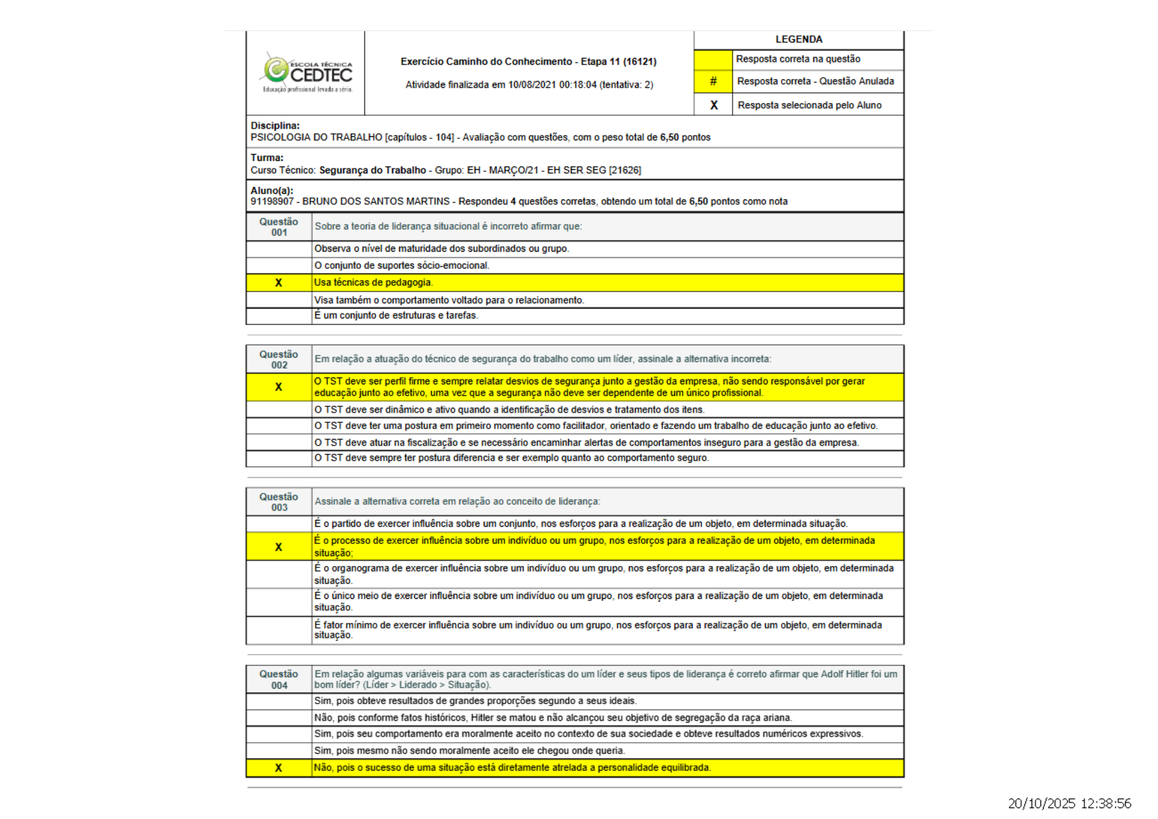 LEGENDA ESCOLA TÉCNICA Exercício Caminho do Conhecimento Etapa 11 (16121) Resposta correta na questão CEDTEC Atividade finalizada em 10/08/2021 00:18:04 (tentativa: 2) # Resposta correta - Questão Anulada Educação profissional levada X Resposta selecionada pelo Aluno Disciplina: PSICOLOGIA DO TRABALHO [capítulos 104] Avaliação com questões, com 0 peso total de 6,50 pontos Turma: Curso Técnico: Segurança do Trabalho Grupo: EH MARÇO/21 EH SER SEG [21626] Aluno(a): 91198907 BRUNO DOS SANTOS MARTINS Respondeu 4 questões corretas, obtendo um total de 6,50 pontos como nota Questão 001 Sobre a teoria de liderança situacional é incorreto afirmar que: Observa nível de maturidade dos subordinados ou grupo. conjunto de suportes sócio-emocional. X Usa técnicas de pedagogia. Visa também 0 comportamento voltado para 0 É um conjunto de estruturas e tarefas. Questão 002 Em relação a atuação do técnico de segurança do trabalho como um líder, assinale a alternativa incorreta: X TST deve ser perfil firme e sempre relatar desvios de segurança junto a gestão da empresa, não sendo responsável por gerar educação junto ao efetivo, uma vez que a segurança não deve ser dependente de um único profissional. o TST deve ser dinâmico e ativo quando a identificação de desvios e tratamento dos itens. TST deve ter uma postura em primeiro momento como facilitador, orientado e fazendo um trabalho de educação junto ao efetivo. TST deve atuar na fiscalização e se necessário encaminhar alertas de comportamentos inseguro para a gestão da empresa. TST deve sempre ter postura diferencia e ser exemplo quanto ao comportamento seguro. Questão Assinale a alternativa correta em relação ao conceito de liderança: 003 É 0 partido de exercer influência sobre um conjunto, nos esforços para a realização de um objeto, em determinada situação. É 0 processo de exercer influência sobre um indivíduo ou um grupo, nos esforços para a realização de um objeto, em determinada X situação; É 0 organograma de exercer influência sobre um indivíduo ou um grupo, nos esforços para a realização de um objeto, em determinada situação. É 0 único meio de exercer influência sobre um indivíduo ou um grupo, nos esforços para a realização de um objeto, em determinada situação. É fator mínimo de exercer influência sobre um indivíduo ou um grupo, nos esforços para a realização de um objeto, em determinada situação. Questão Em relação algumas variáveis para com as características do um líder e seus tipos de liderança é correto afirmar que Adolf Hitler foi um 004 bom (Líder > Liderado > Situação). Sim, pois obteve resultados de grandes proporções segundo a seus ideais. Não, pois conforme fatos históricos, Hitler se matou e não alcançou seu objetivo de segregação da raça ariana. Sim, pois seu comportamento era moralmente aceito no contexto de sua sociedade e obteve resultados numéricos Sim, pois mesmo não sendo moralmente aceito ele chegou onde queria. X Não, pois 0 sucesso de uma situação está diretamente atrelada a personalidade equilibrada. 20/10/2025 12:38:56