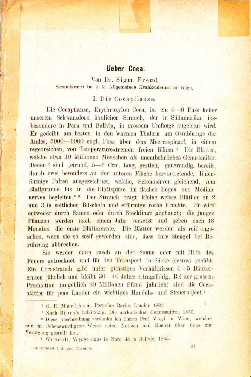 ·, Ueber Coca. Von Dr. Sigm. Freud, ecundararzt im k. k. Allgemeinen Krankenhause in Wien. I. D i e Co ca p fI an z e. Die Cocapflanze, Erythroxylon Coca, ist ein 4-6 Fuss hoher un. erem chwarzdorn ähnlicher Strauch, der in Südamerika, ins besondere in Peru und Bolivia, in gros. em Umfange angebaut wird. Er gedeiht am besten in den \varmen ThH.lern am Ostabhange der An,des, 5000-6000 engl. Fnss über dem Meeresspiegel, in einem regenreichen, von Temperatmextremen freien Klima. 1 Die Bliitter, welche etwa 10 Millionen Menschen als unentbehrliche: Gen11ss111itt l dienen, 2 sind „eirund, 5-6 Ctm. lang, gestielt, ganzrandig, bereift, durch zwei besonders an der unteren Fläche hervortretende, linien förmige Falten ausgezeichnet, welche, eitennerven gleichend, vom Blattgrunde bis in die lllattspitze im flachen Bor,-en den Median nerven begleiten." 3 Der trauch trägt kleine weis e Blüthen zu 2 und 3 in seitlichen Büscheln und eiförmige rothe Friichte. Er wird entweder durch Samen oder durch Stecklinge geptfam~t; di jungen Pflanzen werden nach einem Jahr versetxt und 0 ·eben nach 18 Monaten die erste Blätterernte. Die Blätter werden als reif ange sehen, wenn sie so steif geworden sind, dass ihre ten11·el hei Be ri.iluung abbrechen. Sie werden dann rasch an der tionne oder mit Hilfe des .Feuers getrocknet und für den Transport in iicke (cestos) genäht. Ein Cocastrauch gibt unter günstigen Verhältni:sen +-5 Blätter ernten jährlich und bleibt 30-40 Jahre crtra 0 ·sfahio·. Bei der grossen Procluction (angeblich 30 Millionen Pfund jährlich) sind die Coca blätter für jene Länder ein wichtiges Handels- und Steuerohject. ·1 , O. Jt. Mark ]1 a 111, Pcrnvian ]3arks. London l SO. 2 ~ach Bib ra's Schiitwng: Die 11arkotiscben Uenus milt 1. 18:iii. j l>iese Jl sclll'ribung verdank ich llerrn l'rot. Vog I in Wien, w Jeher mir in Jichenswlinligst!'r \Vei~t' seine Xoti1.r11 und .l:lüclier über Coca zur V erfilgu ng gestcll t hat. •1 \V ddell. Voyagc dans Je Xord de la Bolivie, 1853. 'e11tralt1li.\lt f'. d. qos. 'J'llorn.pio. 290 II. Geschicht und V rwendung im Lande. Al die . panischen Eroberer nach Peru drang n, fand 11 , ie die ocapflanze im Lande cultivirt und im hohen An. eh n, ja selbst in innige Beziehungen zu den reli0 iö en Gebräu ·hen des Volke. ge- 1,racht. Die age erzählte, da s Manco Capac, der göttliche ohn der Sonne, in der Urz it von d '11 Felsen des Titica ·as eR herab ,,.esti gen ·sei, und das Licht sei11e · Vaters den armseligen Ein wohnern gebracht habe, da s er sie die Kenntni.. der Götter, di Au.-Ubung der nützli ·hen Künste lehrte und ihn 11 di Coca· :eh nkt , die e rröttli ·he Pflanze, welche den Hnngrio 11 Rättigt, den 'eh wachen . farkt, und si ihr Iissge. chick vercre . .- n ma •ht.1 'o ·ahliltter wurden den Göttern zum Opfer rrebracht, 'ocablätter währ nd der gott sdien,'tlich 11 Handlungen gekaut . lbst den Todt n Coca in d n Mund g teckt, um sie einer g-ürrntigen Auf nahm im Jenseits zu v rsichern. Wie der Geschidlt schJ"iber der spanischen Eroberung/ . lbst ei11 Abkömmling cl r Jnca ·, berichtet, war di Coca zuerst spärlich im Lande und ihr m,.-· ein Yor rc ·ht d r Herr. eher; zur Zeit der Eroberun° war . i aber seit Lang m j derma1111 zugü1111lich geworden. Gar 'ila . o bemühte :::ich di Coca gegen d n Bann zu vertheidigen, den di Erob rer auf i geie rt hatten. Die 'pani r glaubten nicht an di wunderbare11 Wirkuno·en der Pflanz , welche ihn n durch ihre Roll im reliI. " neise in Brasilien von 8pix und Martins. l, '31. 10 ]_ c. 292 citirt wird, was T s c h u d i 1 von den Leistungen eine Cholo's (Misch lings) berichtet, den er genau beobachten konnte. Derselbe st llte fünf Tage und fünf Nächte lang mühsame Ausgrabun°en für ihn an, ohne mehr als 2 Stunden jede Nacht zu schlafen und ohne Anderes als Coca zu sich zu nehmen. Nach vollendeter Arbeit begleitete er ihn während eines zweitä0 ·igen Ritte., neben seinem Mau1thier her laufend. Er versicherte, dass er gerne die nämliche Arbeit nochmals ohne zu essen verrichten würde, wenn man ihm genu0 · Coca gäbe. Der Mann war 62 Jahre alt und niemals krank gewesen. In der „Reise der Fregatte Novara" sind iLhnliche Beispiele gesteigerter Leistungsfähi0 ·keit durch Coca er;.:ä.hlt. W e d d e 1 I 2, v. Meyen\ Markham ', selbt Poeppig", von dem viel üble Nachrede über die Coca herri.il1rt,erzählte, dass Manco Capac, der göttliche Sohn der Sonne, in der Urzeit von den Felsen des Titicacasees herab- 1 0. R. Markham, Peruvian Barks. London 1880. 2 Nach ßibra's Schätzung: Die narkotischen Genussmittel. 1855. 9 Piese Beschreibung verdanke ich Herrn Prof. V o g I in Wien, welcher .mir in liebenswürdigster Weise seine Notizen und Bücher über Coca zur Ver fügung gestellt hat. • Weddel, Voya.ge dans le Nord de la ßolivie, 1853. 4,, .,. 1 •• t:' ohrt denselben mehrmals mit einem in die Asche getauchten Stachel, 6 und kaut ihn unter reich licher Speichelabsonderung langsam durch. In anderen Gegenden soll eine Art Erde, Tonra, anstatt der Pflanzenasche den Blättern zu gesetzt werden. 6 Drei bis vier Unzen Blätter täglich zu kauen, gilt nicht als Unmässigkeit. Derlndianer beginnt nach Man t e g a z z a in früher Jugend mit dem Gebrauche dieses Genussmittels, den er bis an sein Lebensende fortsetzt. Wenn er einen beschwerlichen Weg zu gehen hat, wenn er eine Frau nimmt, überhaupt wenn eine grössere Anforderung an seine Kräfte gestellt ist, vermehrt er die gewohnte Dosis. ' Scrivener, On the coca leaf and its uses in diet and medicine. Medical Times and Gazette, 1871. 11 Garcilasso de la Vega. Comentarios reales de los Incas, 1609-17. s Christison, Observations on the effect of cuca, or coca, de leaves of Erythroxylon coca. British Medical Journal, 1876. - Bibra l. c. ' Man t e g a z z a, Sulle virtu igieniche e medicinali della coca. Milano 1859. 6 S c ri v e n er l. c. 1 Nach Ulloa, dem Bibra folgt. _5_ (Welche Absicht durch den Zusatz der Alkalien in de