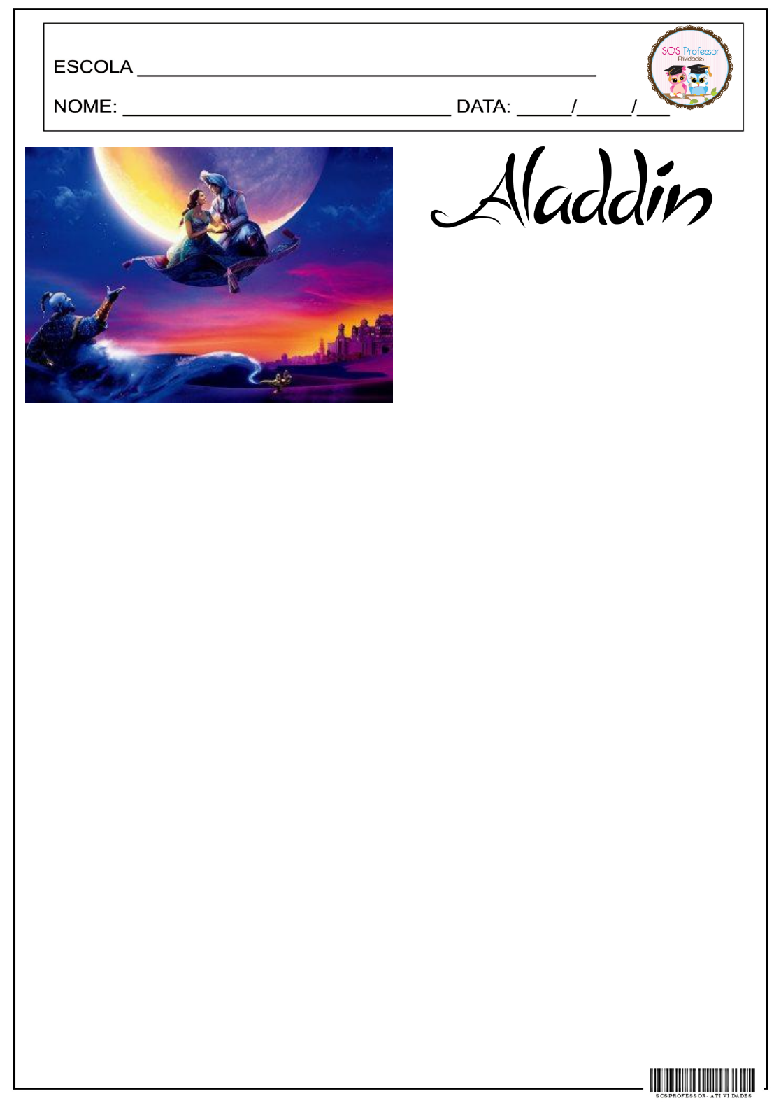 Aladdin é um jovem ladrão que vive de pequenos roubos em Agrabah. Um dia, ele ajuda uma jovem a recuperar um valioso bracelete, sem saber que ela na verdade é a princesa Jasmine. Aladdin logo fica interessado nela, que diz ser a criada da princesa. Ao visitá-la em pleno palácio e descobrir sua identidade, ele é capturado por Jafar, o grão-vizir do sultanato, que deseja que ele recupere uma lâmpada mágica, onde habita um gênio capaz de conceder três desejos ao seu dono. Aladdin aceita a missão de visitar a Caverna dos Tesouros e trazer a lâmpada lá guardada. Meio sem querer, ele descobre que o artefato, ao ser esfregado, libera um gênio capaz de realizar desejos. Apaixonado pela bela Jasmine, Aladdin vê uma chance de impressioná-la e conquistar seu coração. Só que ele não imagina o quão perigoso é o grão-vizir. O filme é inspirado no famoso conto "Aladdin e A Lâmpada Maravilhosa", da coletânea "As Mil e Uma Noites". Betânia Maximiano 1- Onde acontece a história do filme? _________________________________________________________ 2- O texto que você leu é: ( ) uma crítica ( ) uma sinopse 3- Quais são as personagens principais do filme citadas no texto? _________________________________________________________ 4- De qual livro foi tirado o conto que inspirou o filme? _________________________________________________________ 5- Copie do texto: a) Um substantivo composto: _____________________________ b) Os substantivos próprios: _________________________________ _________________________________________________________ c) Duas palavras proparoxítonas: ______________________________ 6- Dê o par do substantivo abaixo: a) ladrão: _______________ e) gênio: __________________ b) princesa: ______________ f) sultão: _________________ c) macaco: _______________ g) criada: _________________ d) mágico: _______________ h) amigo: _________________ 7- Leia o trecho da música Nunca teve um amigo assim. “...Estou ansioso para usar o meu poder É só pra isso que eu aqui estou Me dê essa lista quilométrica Esfregue a lâmpada e verá quem sou, ê ô ô ô Pode falar senhor, seus desejos para mim Deixa que eu faço, seu ricaço Você nunca teve amigo, nunca teve amigo Você nunca teve amigo, nunca teve amigo Você nunca teve amigo assim...” Sublinhe na música: a) de azul os adjetivos; b) de verde os substantivos; c) de vermelho os pronomes pessoais do caso reto; d) de cinza um pronome de tratamento; e) de laranja os pronomes oblíquos.