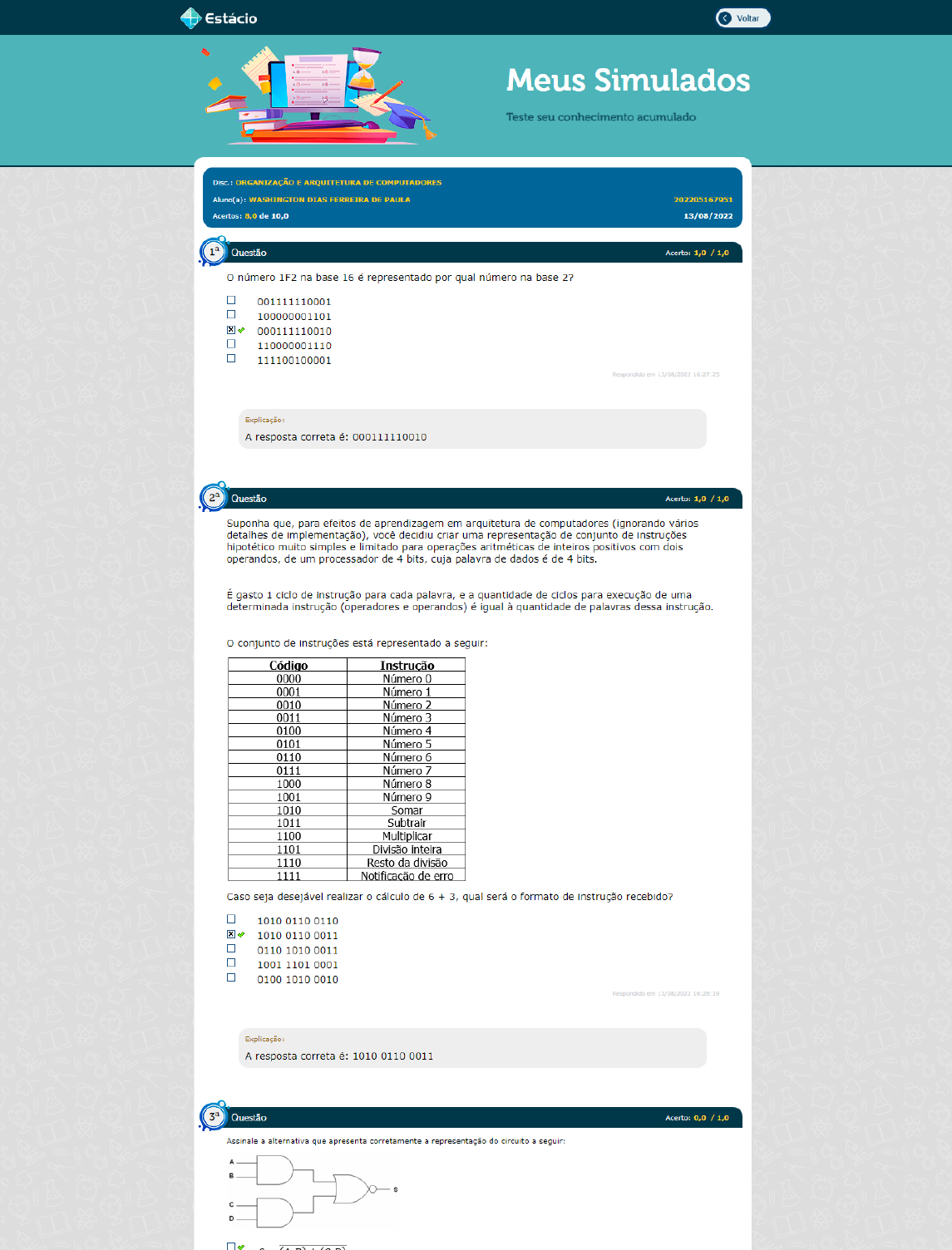 Estácio Voltar Meus Simulados Teste seu conhecimento acumulado Disc.: ORGANIZAÇÃO E ARQUITETURA DE COMPUTADORES Aluno(a): WASHINGTON DIAS FERREIRA DE PAULA 202205167951 Acertos: 8,0 de 10,0 13/08/2022 Questão Acerto: 1,0 1,0 número 1F2 na base 16 é representado por qual número na base 2? 001111110001 100000001101 000111110010 110000001110 111100100001 Respondido em 13/08/2022 16:27:25 Explicação: A resposta correta é: 000111110010 Questão Acerto: 1,0 1,0 Suponha que, para efeitos de aprendizagem em arquitetura de computadores (ignorando vários detalhes de implementação), você decidiu criar uma representação de conjunto de instruções hipotético muito simples e limitado para operações aritméticas de inteiros positivos com dois operandos, de um processador de 4 bits, cuja palavra de dados é de 4 bits. É gasto 1 ciclo de instrução para cada palavra, e a quantidade de ciclos para execução de uma determinada instrução (operadores e operandos) é igual à quantidade de palavras dessa instrução. conjunto de instruções está representado a seguir: Código Instrução 0000 Número 0 0001 Número 1 0010 Número 2 0011 Número 3 0100 Número 4 0101 Número 5 0110 Número 6 0111 Número 7 1000 Número 8 1001 Número 9 1010 Somar 1011 Subtrair 1100 Multiplicar 1101 Divisão inteira 1110 Resto da divisão 1111 Notificação de erro Caso seja desejável realizar cálculo de 6 + 3, qual será formato de instrução recebido? 1010 0110 0110 1010 0110 0011 0110 1010 0011 1001 1101 0001 0100 1010 0010 Respondido em 13/08/2022 16:28:19 Explicação: A resposta correta é: 1010 0110 0011 Questão Acerto: 0,0 1,0 Assinale a alternativa que apresenta corretamente a representação do circuito a seguir: A S C D+ S (A.B) + (C.D) S (A (C.D) S = S = Respondido em 13/08/2022 16:31:51 Explicação: A resposta correta é: Repare que temos uma porta NOR responsável por conectar as portas (A and B), and D). Questão Acerto: 1,0 1,0 Usando as regras da álgebra booleana, selecione a alternativa que apresenta corretamente a simplificação da expressão a seguir: (A.~B) + (B.(A+C)) A C) A A) A.B A.B+C Respondido em 13/08/2022 16:33:45 Explicação: A resposta correta é: A + ABC 111 1 1 110 1 1 101 1 1 011 1 1 001 0 0 010 0 100 1 1 000 0 0 Questão Acerto: 0,0 1,0 Analise as seguintes definições de pipeline de instruções simples, superescalar e multithreading simultâneo: I. Pipeline instruções simples: instruções individuais que são executadas através de um pipeline de estágios, de maneira que, enquanto uma instrução está sendo executada em um estágio, outra instrução está sendo executada em outro estágio do pipeline. II. Superescalar: um pipeline é construído por meio da replicação de recursos de execução, 0 que permite a execução paralela de instruções em pipelines paralelos. III. Multithreading simultâneo (SMT): bancos de registros são replicados para que múltiplas threads possam compartilhar uso dos recursos de pipelines. Assinale a alternativa que indica qual ou quais das afirmações acima estão corretas: Apenas as afirmações I II. Apenas a afirmação I. As afirmações I, II e III. Apenas as afirmações II e III. Apenas a afirmação III. Respondido em 13/08/2022 16:34:54 Explicação: A resposta correta é: Apenas as afirmações II. Questão Acerto: 1,0 1,0 surgimento de processadores com arquitetura RISC foi fundamental para desenvolvimento de smartphones, tablets, "smartwatches" entre muitos outros. Com a restrição de espaço para construir esses equipamentos, a abordagem RISC foi fundamental pois: Diminui uso de memória, priorizando disco rígido. Priorizava execução em registradores, aumentando a eficiência dos programas. Permite uso de SSD, acelerando a busca de dados. Possui integração com tecnologia sem fio, possibilitando a plena conexão à internet. Tem um conjunto amplo de instruções, facilitando a programação dos equipamentos. Respondido em 13/08/2022 16:38:04 Explicação: A resposta correta é: Priorizava a execução em registradores, aumentando a eficiência dos programas.A abordagem RISC aumentou de forma contumaz as inovações tecnológicas. Suas instruções simplificadas, proporcionaram celeridade na execução de tarefas. Questão Acerto: 1,0 1,0 Os componentes que formam cerne da infraestrutura da internet, responsáveis por cobrir as enormes distâncias intercontinentais e transportar os datagramas pelo mundo, são chamados de: Servidores. Modems. World Wide Web. Infraestrutura de circuitos virtuais. Roteadores. Respondido em 13/08/2022 16:39:06 Explicação: A resposta correta é: Roteadores. Os Sistemas Autônomos e os roteadores de Backbone são responsáveis por permitir a interconexão e a troca de pacotes (também chamados de datagramas) no ambiente de roteamento global. Questão Acerto: 1,0 1,0 Em 2019, Sistemas Operacionais para dispositivos móveis (mobileOS) já respondiam por mais de 50% do market share dos Sistemas Operacionais. Qual das funcionalidades a seguir é responsabilidade do mobileOS de um celular? I. Mostrar notificações. II. Calcular rotas. III. Mostrar a carga restante da bateria. IV. Ler a tela touchscreen. V. Restringir tráfego de Broadcast. I e II, apenas. III, IV V, apenas. II e V, apenas. I, III IV, apenas. I, II e IV, apenas. Respondido em 13/08/2022 16:40:31 Explicação: A resposta correta é: I, III e IV, apenas. cálculo de rotas é feito através de uma tabela de roteamento, característica comum aos roteadores. o uso de VLANS (Rede de Área Local Virtual) visa restringir tráfego de Broadcast de uma rede. Questão Acerto: 1,0 / 1,0 Em um sistema operacional, conjunto de rotinas que oferece serviços aos usuários, às suas aplicações e também ao próprio sistema é denominado especificamente como: Binário. Microcódigo. Núcleo. Aplicativo de usuário. Setup. Respondido em 13/08/2022 16:41:20 Explicação: A resposta correta é: Núcleo. Sistema Operacional é 