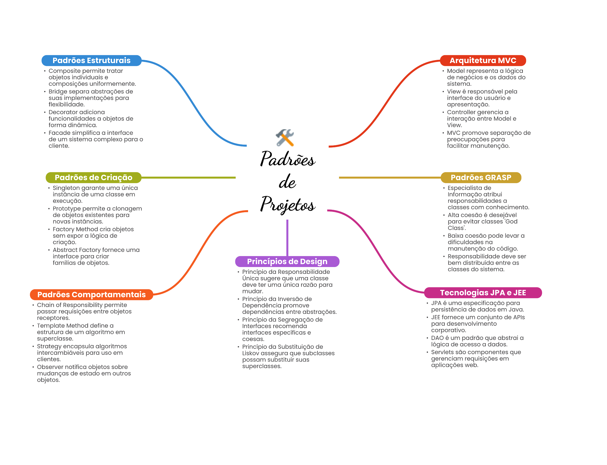 Padrões Estruturais Arquitetura MVC Composite permite tratar Model representa a lógica objetos de negócios dados do composições Bridge separa abstrações de View responsável pela implementações para Interface do usuário apresentação. Decorator adiciona Controller gerencia a funcionalidades a objetos de Interação entre Model . forma View. Facade simplifica a MVC promove separação de de um sistema para o preocupações para Padrões de Criação Padrões GRASP Singleton garante uma única Especialista de de uma classe em atribul execução. responsabilidades a Prototype a classes com conhecimento. de objetos existentes para Alta cossão desejável novas para evitar classes Factory Method cria objetos sem expor a lógica de pode levar a criação. na Abstract Factory fornece uma manutenção do código. interface para criar Responsabilidade deve ser de objetos. Princípios de Design bem entre as Principio da classes do sugere que uma classe deve ter uma única razão para mudar. Padrões Comportamentais Tecnologias JPA e JEE Princípio da de Chain of Responsibility permite Dependência promove JPA uma especificação para passar requisições entre objetos dependências entre de dados em receptores. da Segregação de JEE fornace um conjunto de Template Method define a recomenda para estrutura de um algoritmo em . corporativo. DAO é um padrão que abstral a Strategy algoritmos da Substituição de lógica de acesso a dados. para uso em assegura que são componentes que clientes. possam substituir gerenciam requisições em Observer notifica objetos sobre aplicações web. mudanças de estado em outros objetos.