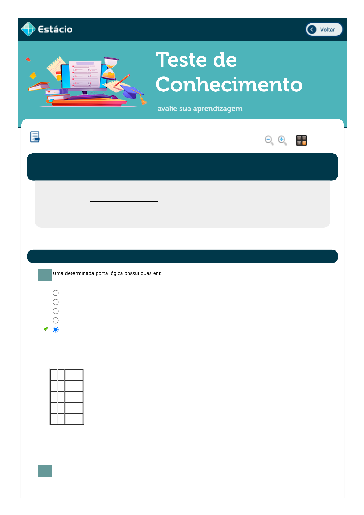 29/08/2022 22:19 Estácio: Alunos https://simulado.estacio.br/alunos/ 1/5 Teste de Conhecimento avalie sua aprendizagem Uma determinada porta lógica possui duas entradas, X e Y. Quando X e Y são 0 a saída é 0. Quando X e Y são 1 a saída também é 0. Qual é a porta lógica que possui esta tabela verdade? Assinale a alternativa que apresenta a sequência correta da saída (S) para a expressão lógica S = AB + C, quando os valores de entrada são: A = 010, B 110 e C=001. ARQUITETURA DE COMPUTADORES Lupa Calc. DGT0281_202208538576_TEMAS Aluno: JOÃO MARCELO GOMES DE OLIVEIRA Matr.: 202208538576 Disc.: ARQUITETURA DE COM 2022.3 EAD (G) / EX Prezado (a) Aluno(a), Você fará agora seu TESTE DE CONHECIMENTO! Lembre-se que este exercício é opcional, mas não valerá ponto para sua avaliação. O mesmo será composto de questões de múltipla escolha. Após responde cada questão, você terá acesso ao gabarito comentado e/ou à explicação da mesma. Aproveite para se familiarizar com este modelo de questões que será usado na sua AV e AVS. LÓGICA DIGITAL 1. NAND AND NOR OR XOR Data Resp.: 29/08/2022 22:13:04 Explicação: A resposta correta é: XOR A B XOR 0 0 0 0 1 1 1 0 1 1 1 0 2. javascript:voltar(); javascript:voltar(); javascript:diminui(); javascript:aumenta(); javascript:calculadora_on(); 29/08/2022 22:19 Estácio: Alunos https://simulado.estacio.br/alunos/ 2/5 Analise as seguintes definições de pipeline de instruções simples, superescalar e multithreading simultâneo: I. Pipeline instruções simples: instruções individuais que são executadas através de um pipeline de estágios, de maneira que, enquanto uma instrução está sendo executada em um estágio, outra instrução está sendo executada em outro estágio do pipeline. II. Superescalar: um pipeline é construído por meio da replicação de recursos de execução, o que permite a execução paralela de instruções em pipelines paralelos. III. Multithreading simultâneo (SMT): bancos de registros são replicados para que múltiplas threads possam compartilhar o uso dos recursos de pipelines. Assinale a alternativa que indica qual ou quais das afirmações acima estão corretas: Periféricos são dispositivos extremamente relevantes no processo de interação com os sistemas computacionais. Acerca de suas características, assinale a opção que representa um dispositivo de saída para um computador pessoal: I. Mouse. II. Leitor biométrico. III. Projetor de vídeo. IV. Impressora 3D. S = 100 S = 110 S = 011 S = 010 S = 101 Data Resp.: 29/08/2022 22:13:24 Explicação: A resposta correta é: S = 011 AB+C: (0 and 1 or 0) = 0 (1 and 1 or 0) = 1 (0 and 0 or 1) = 1 PROCESSAMENTO EM PARALELO 3. Apenas a afirmação I. As afirmações I, II e III. Apenas as afirmações II e III. Apenas as afirmações I e II. Apenas a afirmação III. Data Resp.: 29/08/2022 22:13:57 Explicação: A resposta correta é: Apenas as afirmações I e II. BASE COMPUTACIONAL 4. 29/08/2022 22:19 Estácio: Alunos https://simulado.estacio.br/alunos/ 3/5 V. Leitor de código de barras. Em 2019, os Sistemas Operacionais para dispositivos móveis (mobileOS) já respondiam por mais de 50% do market share dos Sistemas Operacionais. Qual das funcionalidades a seguir é responsabilidade do mobileOS de um celular? I. Mostrar notificações. II. Calcular rotas. III. Mostrar a carga restante da bateria. IV. Ler a tela touchscreen. V. Restringir o tráfego de Broadcast. Um processador possui resumidamente duas funções principais: Processamento e controle. Nesse contexto, em que área da UCP (processador) se realiza a movimentação de dados e de instruções de E/S para o processador? II, III e IV, apenas. III e IV, apenas. II e V, apenas. I e II, apenas. III, IV e V, apenas. Data Resp.: 29/08/2022 22:16:24 Explicação: A resposta correta é: Impressora 3D e Projetor de vídeo. Dispositivos como Mouse, Leitor biométrico e Leitor de código de barras são, tipicamente, periféricos de entrada. Um Projetor de vídeo e uma Impressora 3D são periféricos de saída (output) de dados. 5. II e V, apenas. III, IV e V, apenas. I, II e IV, apenas. I, III e IV, apenas. I e II, apenas. Data Resp.: 29/08/2022 22:17:11 Explicação: A resposta correta é: I, III e IV, apenas. O cálculo de rotas é feito através de uma tabela de roteamento, característica comum aos roteadores. O uso de VLANS (Rede de Área Local Virtual) visa restringir o tráfego de Broadcast de uma rede. COMPONENTES DE HARDWARE 6. Registrador de Dados de Memória - RDM. Contador de Instrução - CI. Registrador de instrução - RI. Registrador de Endereço - REM. Unidade de Controle - UC. Data Resp.: 29/08/2022 22:17:33 Explicação: 29/08/2022 22:19 Estácio: Alunos https://simulado.estacio.br/alunos/ 4/5 A parte do estudo da ciência da computação que trata dos aspectos relativos às partes do computador que são mais conhecidas pelos especialistas que o construíram, e cujo entendimento é desnecessário para o programador é denominada especificamente de: Quanto é o resultado da operação 4765 + 3552 na base numérica 8? Para realizar as conversões e operações necessárias, considere: Os valores como potências da base 10; Os resultados expressos com os números escritos por extenso (não usar notação científica, como, por exemplo, 1 x 103). Dica: calcular usando a unidade de medida padrão como base de cálculo (bits ou Bytes). A operação 128 Mbits - 2MBytes é igual a: A resposta correta é: Unidade de Controle - UC. A unidade de controle é responsável pelo Ciclo de Busca, Decodificação e Execução de Instruções. 7. Arquitetura de Computadores. Características de Computadores. Criação de Computadores. Implementação de Computadores. Concepção de Computadores. Data Resp.: 29/08/2022 22:17:57 Explicação: A resposta correta é: Implementação de Computadores. A área conhecida como implementação de computadores está tipicamente relacionada à abordagem de q