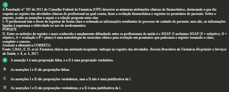 2 A Resolução n° 585 de 2013 do Conselho Federal de (CFF) descreve as atribuições clínicas do farmacêutico, destacando a que diz respeito ao registro das atividades do profissional na qual consta, fazer a evolução farmacêutica e registrar no prontuário do paciente. Sobre 0 exposto, avalie as asserções a seguir e a relação proposta entre elas: profissional tem 0 dever de registrar de forma clara e ordenada as informações resultantes do processo de cuidado do paciente, mas não, as informações ligadas à segurança e efetividade no uso de medicamentos. PORQUE II- Entre os métodos de registro 0 mais conhecido e amplamente difundindo entre os profissionais de saúde é SOAP. acrônimo SOAP (S = subjetivo, = objetivo, A = avaliação e P= plano) é uma metodologia de clínico para evolução em prontuário que padroniza 0 registro tornando-o claro, completo e conciso. Assinale a alternativa CORRETA: Fonte: LIMA, E.D. et al. Farmacia em ambiente hospitalar: enfoque no registro das atividades. Revista Brasileira de Farmácia Hospitalar e Serviços de Saúde, V. 8, n. 4, 2017. A A asserção I é uma proposição falsa, e a II é uma proposição verdadeira. B As asserções I e II são proposições falsas. C As asserções Ie II são proposições verdadeiras, mas a II não é uma justificativa da I. D As asserções I e II são proposições verdadeiras, e a II é uma justificativa da I.