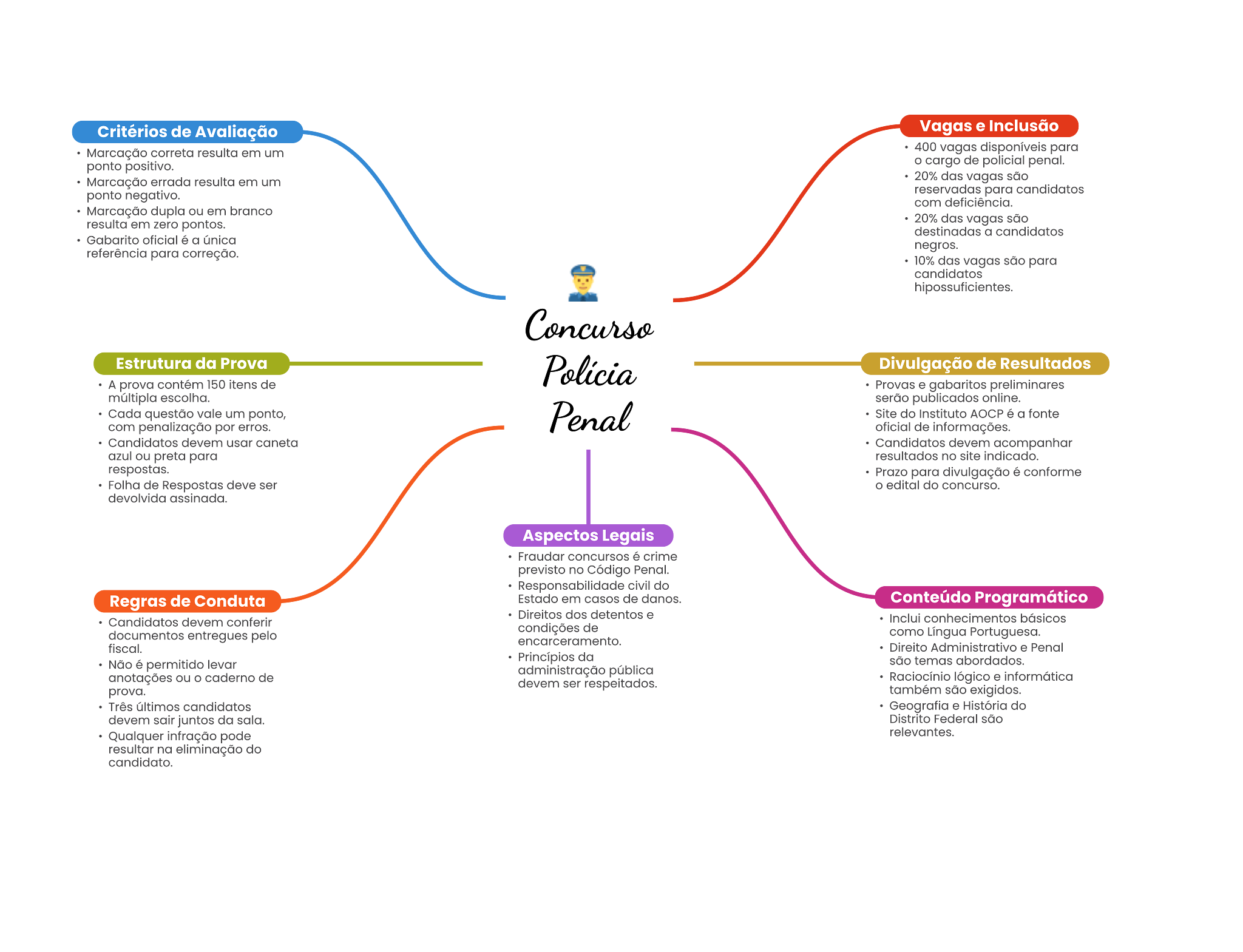 Critérios de Avaliação Vagas e Inclusão Marcação correta resulta em um 400 vagas para ponto positivo. cargo de policial penal. Marcação errada resulta em um 20% das vagas são ponto negativo. reservadas para candidatos com deficiência. Marcação dupla ou em branco resulta em zero pontos. 20% das vagas são a candidatos Gabarito oficial é a única referência para correção. negros. 10% vagas são para candidatos Estrutura da Prova Divulgação de Resultados A prova contém 150 Itens de Provas preliminares escolha. serão publicados online. Cada questão vale um ponto, Site do AOCP a fonte com por erros. oficial de informações. Candidatos devem usar Candidatos devem acompanhar ou preta para resultados no respostas. Prazo para divulgação é conforme Folha de deve edital do concurso. devolvida assinada. Aspectos Legais concursos crime no Código Penal. Responsabilidade civil do Regras de Conduta Estado em casos de Conteúdo Programático Direitos dos detentos e Candidatos devem conferir Inclui conhecimentos básicos documentos entregues pelo condições de como Lingua fiscal. Direito Administrativo Penal Não é permitido da temas abordados. anotações ou o cademo de administração pública devem ser respeitados. lógico . informática prova. também são exigidos. Trêe últimos Geografia História do sair juntos da Distrito Federal Qualquer infração pode relevantes. resultar na eliminação do